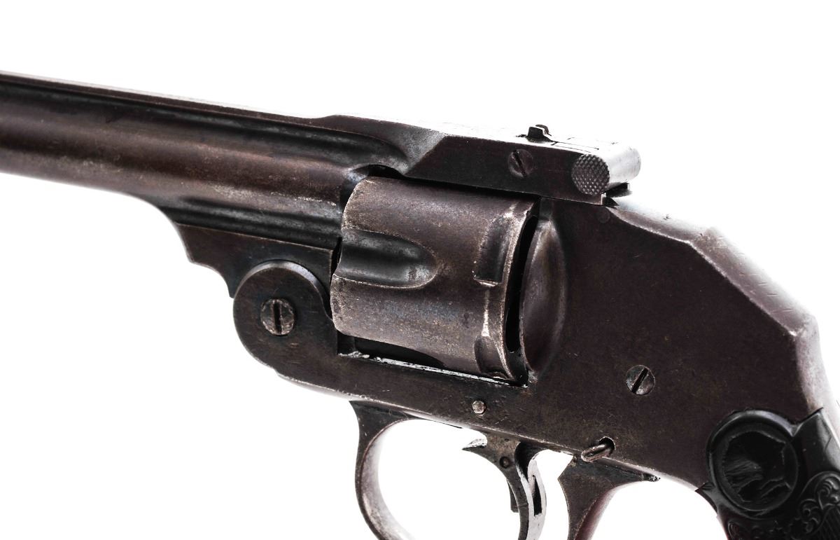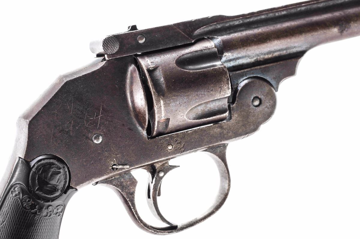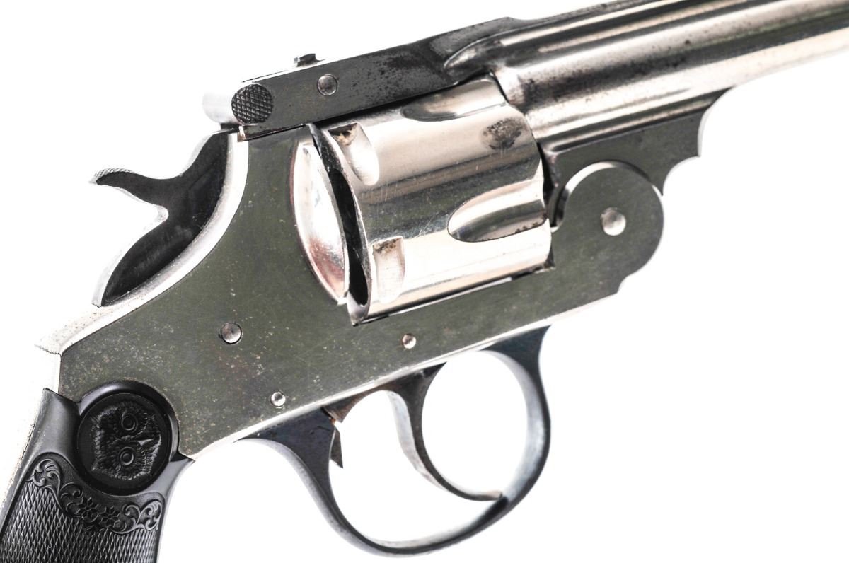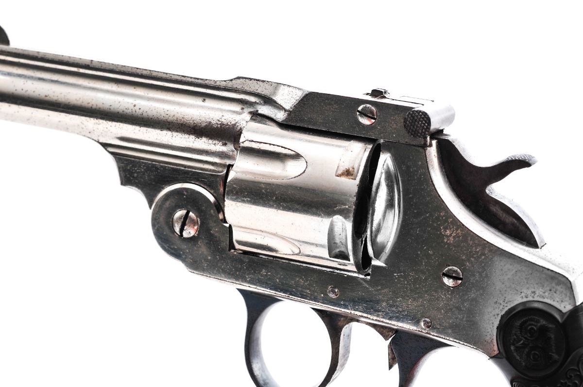 Lot of Two (2) Iver Johnson Top-Break Revolvers: (1) 2nd Model Hammer Double Action, #G28777, .38 cal., 3-1/4'' barrel, nickel finish, original checkered hard rubber owl's head grips, case hardened trigger and hammer, and standard sights. Condition is very good retaining approx. 75% original nickel with general light freckling. Grips with some flattening to checkers but are in overall nice condition with the exception of a hairline crack to the bottom edge of left grip. Trigger and hammer retain approx. 40%-45% case colors with most of the losses to the trigger. Top-break action is crisp and barrel is tight to the frame; bore is very good. (2) Top-Break Hammerless, #47269, .38 cal., 4'' barrel, blue finish, checkered hard rubber grips, with standard sights. Condition is poor. Action is broken, and frame is missing one of the cross retaining pins. Grips have had the owl's head obliterated, and the right grip panel is cracked. Sold as parts or project gun. Est.: $150-$250/lot. (C&R)