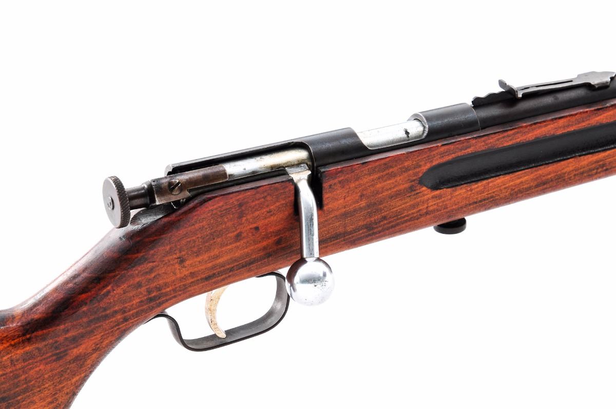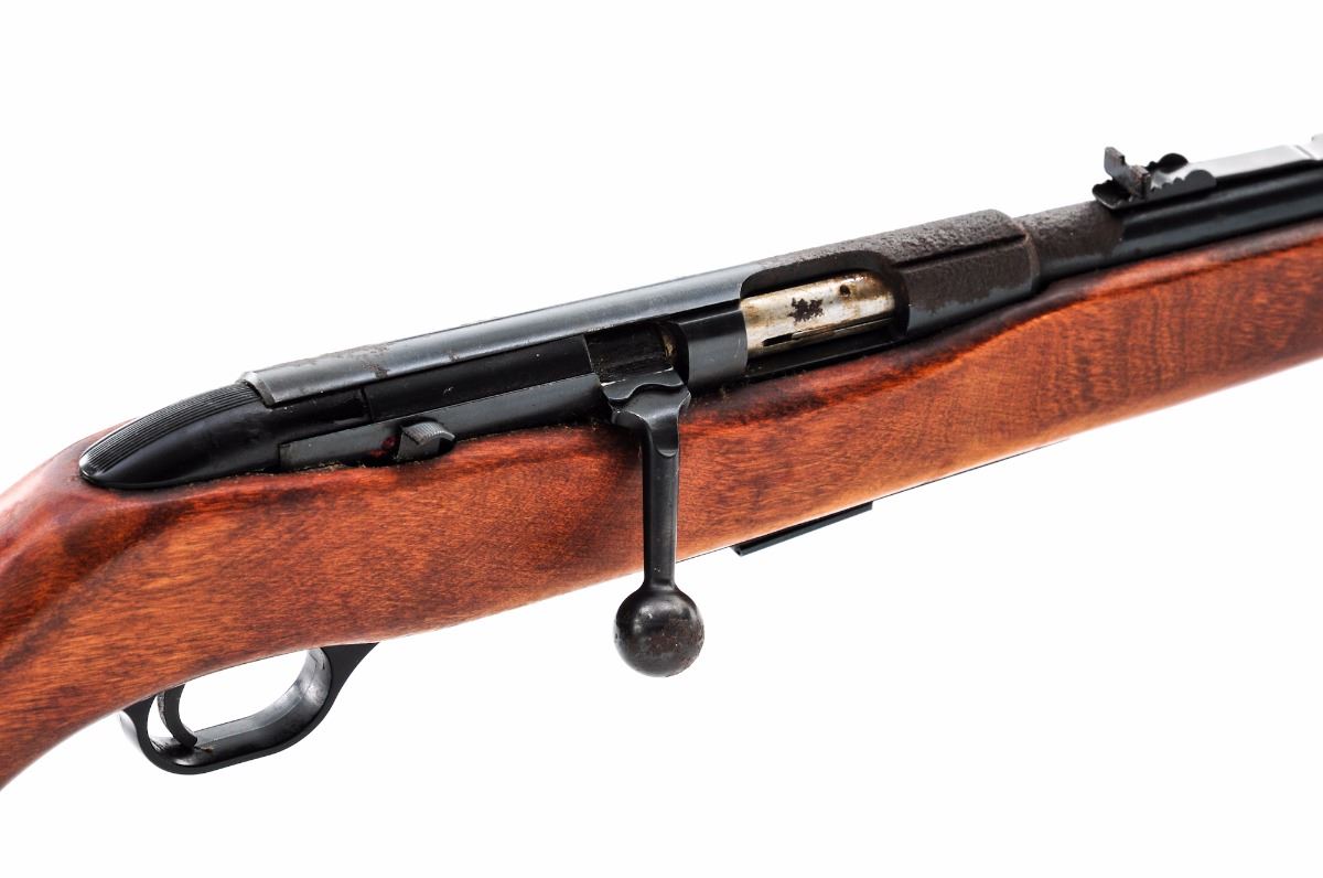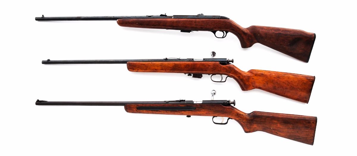 Lot of Three (3) Bolt Action Rifles: (1) Wards-Westernfield Model 35A, NVSN, .22 S-L-LR cal., 24'' barrel, smooth pistol-grip hardwood stock, bright bolt and trigger, ramp blade front sight and notched rear sight with elevator. Condition is good with scattered general surface rust. Metal surfaces retain approx. 70% blue that has toned to an overall dark patina. Stock with little varnish remaining. Action is crisp, bore is very good. (C&R) (2) Wards-Westernfield Model 46A, NVSN, .22 S-L-LR cal., 24'' barrel, blue finish, pistol-grip walnut stock, blade front sight and notched rear sight, bright bolt and trigger, with one magazine. Condition is good retaining approx. 80% thinning and toning blue, with scattered general surface rust. Stock with light to moderate scuffs and scratches. Bolt handle and trigger with flaking and darkening to nickel finish. Action is crisp, bore is good with ring approx. 6'' from muzzle. (C&R) (3) Mossberg Model 740T, #1253199, .22 mag. cal., 24'' barrel, blue finish, pistol-grip walnut stock, brass bead front sight and notched rear sight, checkered black plastic buttplate, with one magazine. Condition is fair. Metal surfaces show patches of moderate to heavy corrosion. Stock shows a medium amount of thinning to the finish, as well as light scuffs and scratches. Action is crisp, bore is fine. Est.: $150-$300/lot. (Modern)