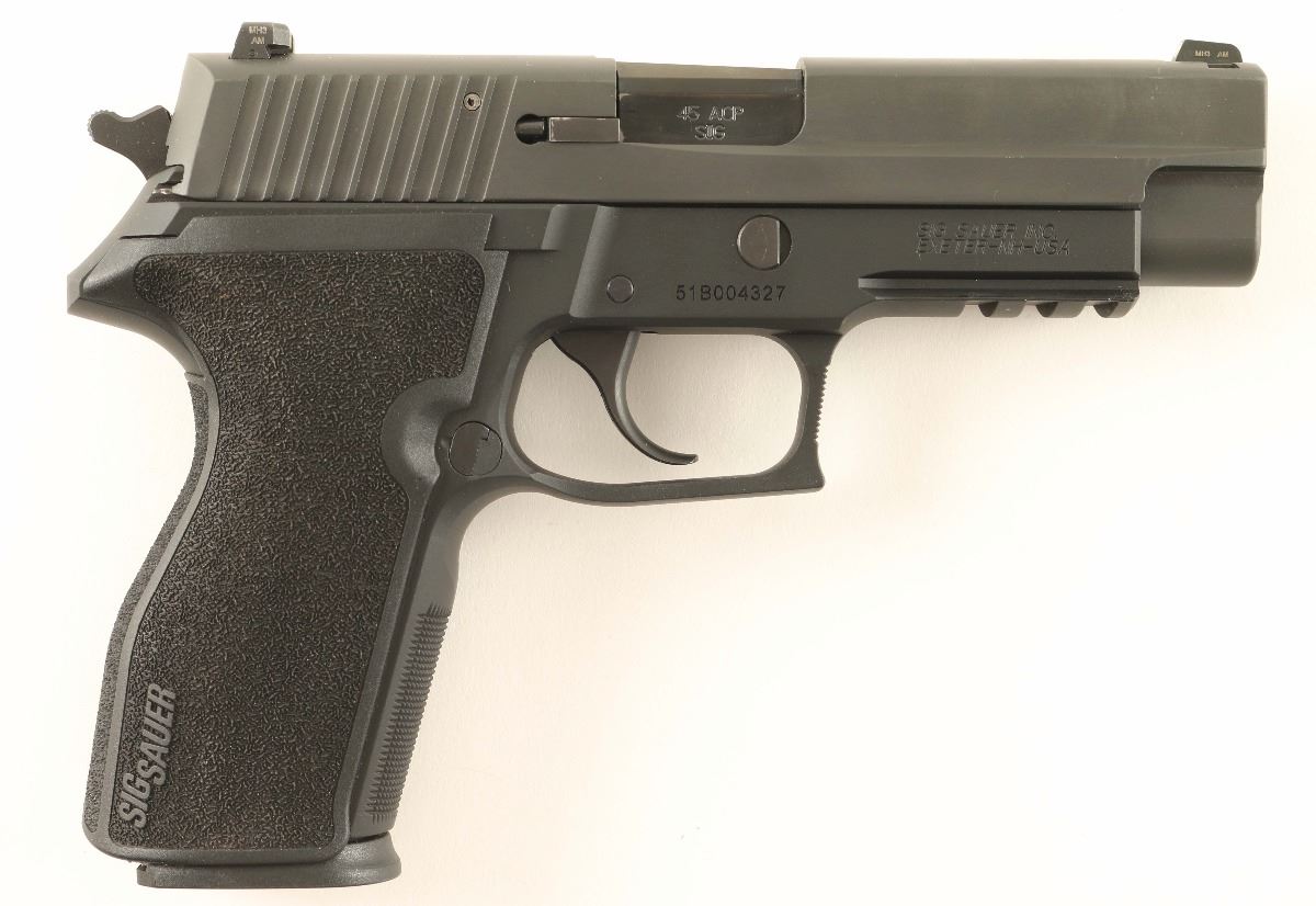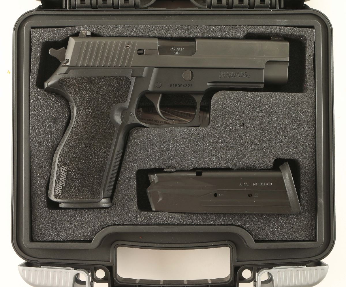 Quality double action semi-automatic pistol chambered in .45 Automatic. Features a matte black Nitron finish, 4.4" barrel, night sights, thumb decocker, smooth trigger, serrated hammer spur, push button magazine release, 10 round magazine, black anodized frame with integral accessory rail, and Sig Sauer black polymer wrap-around grips. Includes the original factory hard case with extra magazine, documents and lock. Pistol shows little to no wear. Action is smooth, bore is excellent, and grips are fine.
