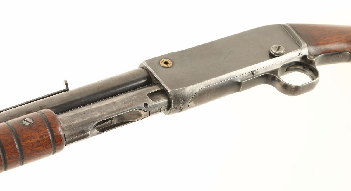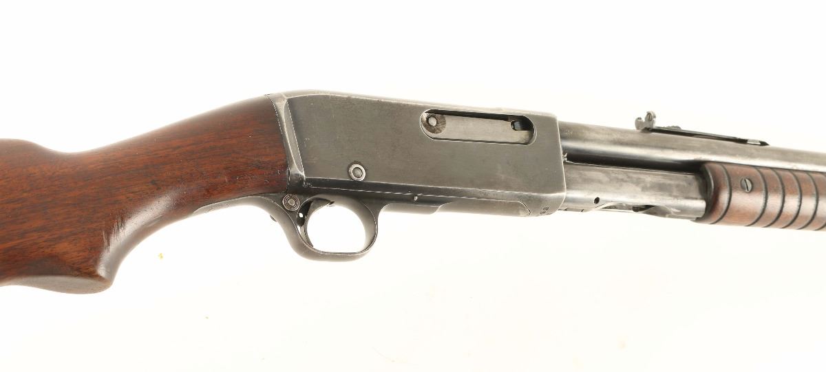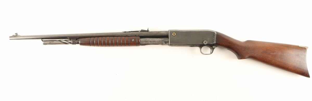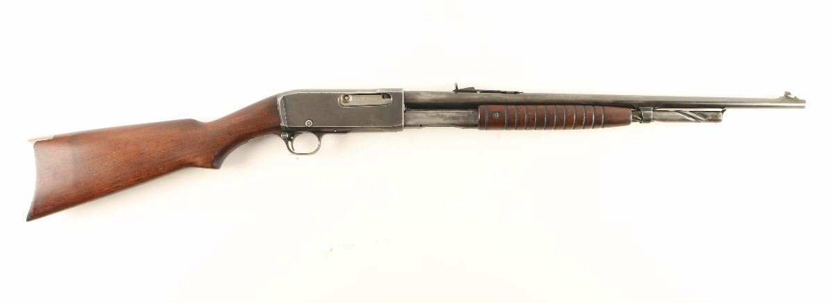 Vintage take-down slide action repeating rifle chambered in .32 Remington. Rifle features it's original blued finish, 22" tapered barrel, dovetailed blade front sight, adjustable rear sporting sight, 3/4 tube magazine, case hardened trigger, push button safety, serrated round take-down lever, grooved walnut slide handle and pistol grip shoulder stock with crescent metal buttplate. Rifle exhibits approximately 63% of it's blued finish with moderate/heavy wear on the barrel and some light surface rust emerging on the slide arm forward of the receiver. Action is crisp, bore is very good and wood stocks are fine.
