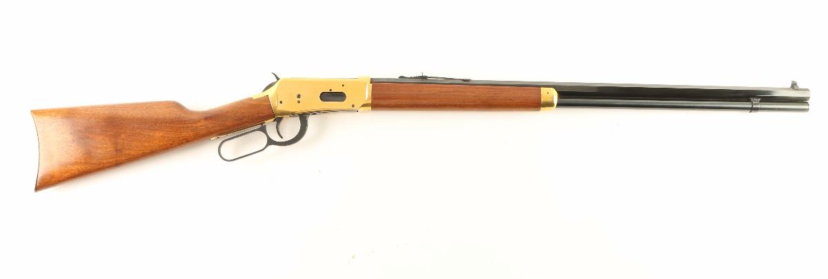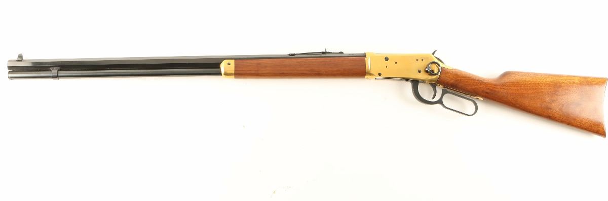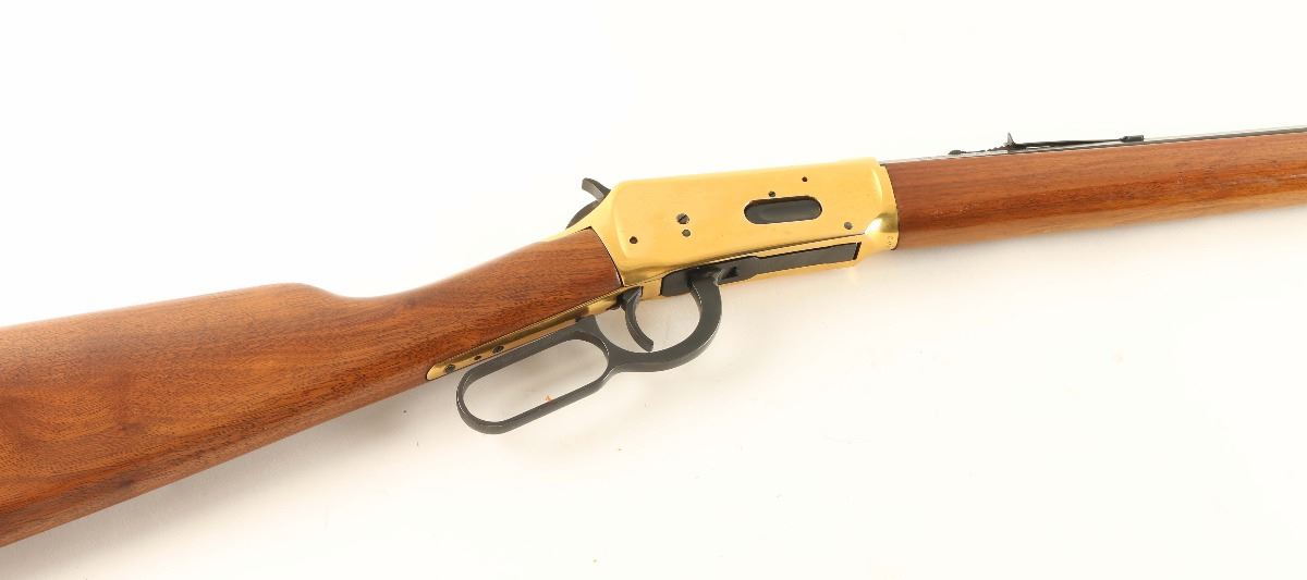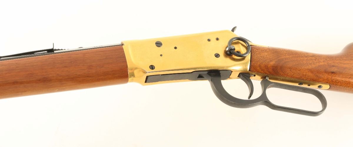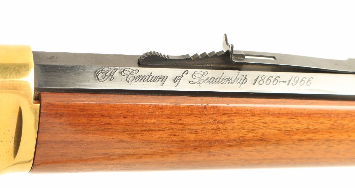 'Centennial '66' Lever action commemorative repeating rifle chambered in .30-30 Winchester, circa 1966. One of only 102,309 produced, inscribed "A Century of Leadership 1866-1966" on barrel. Features a blued 26" octagonal barrel, full tube magazine, blade front sight, adjustable rear sporting sight, brass colored receiver, serrated hammer spur, beveled trigger, saddle ring, smooth wood forend with metal tip, and straight grip shoulder stock with metal buttplate. Finish shows light handling wear, some light scattered surface rust forming around the rear sight and a few small losses to the brass finish on the receiver. Action is smooth, bore is pristine and wood stocks are fine.