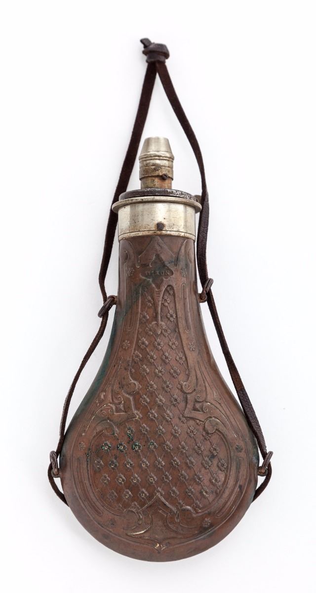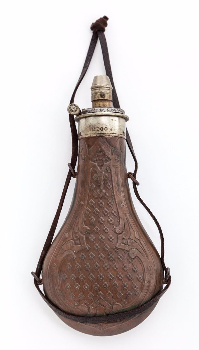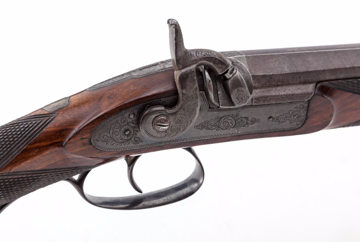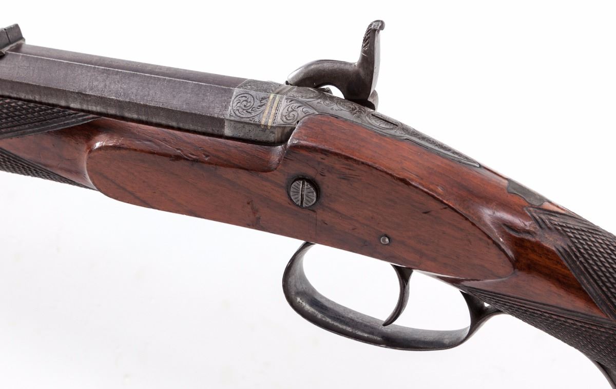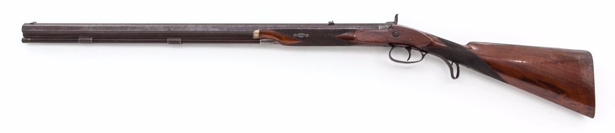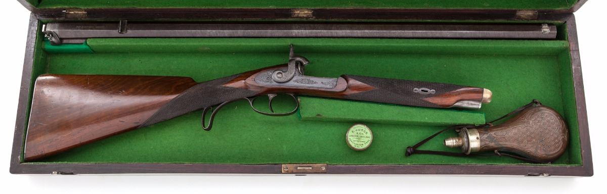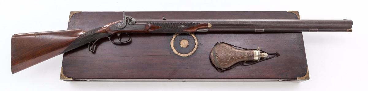 D. P. Slingsby, Leeds, Provincial English Bar Action Percussion Rifle, NSNV, .54'' cal, 29-1/2'' browned twist steel octagonal barrel having 12 groove rifling, with maker's name engraved on top barrel flat, accompanied by early Birmingham proofs on lower barrel flat. Lock is case colored with scroll engraved vignettes and triangular cut borders which follow to the blued breech plug and combination glove-fitting triggerguard and knurled hand stop; hammer has a half-cock notch and is similarly engraved. The windage adjustable two-leaf rear sight assembly has one standing and one folding sight, with a small blade front sight. Barrel pipes house a brass-tipped rosewood ramrod with a copper handle. The figured walnut halfstock has a gloss varnish and is cut with coarse diamond checkering, bordered by three lines on the wrist, with a heavy steel buttplate, silver nosecap and ramrod guide, and a small vacant silver shield on top of wrist. Rifle is housed in a key lock mahogany campaign-style case with brass furniture and green felt lining, along with accoutrements including an ornate DIXON & SONS hallmarked copper flask with an adjustable charger and a sealed tin of Joyce percussion caps. Overall condition is very good, having indications of occasional use and retaining a strong mainspring. Barrel brown has drifted to mottled gray-black with overall fine pitting, the hook has light corrosion. The visible bore lands have patchy copper-colored fouling; lock case colors have toned bronze with faint traces of original color. Barrel dovetails and sights have small nicks and scratches from adjustments; buttplate has been polished over old corrosion and pitting. Stock has minor shrinkage and an uneven re-varnish over old dents and scratches with scattered pry marks around the lock inletting. Case has scuffs and scratches with a few shrinkage cracks and is missing the lock escutcheon and key; case lining and partitions have been periodically redone. Est.: $1,800-$2,800. (Antique)