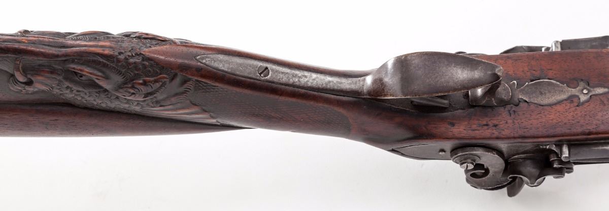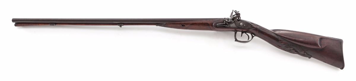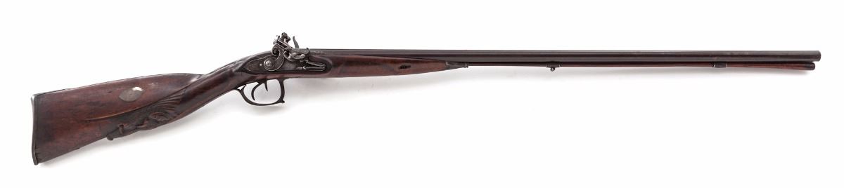 French Flintlock Side-by-Side Shotgun, NVSN, 12 ga., 33'' barrels, brown finish, checkered walnut stock. Right lock marked ''Cobert'' left lock marked ''du Havre''. Condition is fair. All metal parts have an even grey/brown patina. Barrels have small dents that do not show in the bore. Locks function as designed; right side frizzen is broken off. Cocks are complete, left screw is replaced. Stock is fair with a beautifully rendered boar's head carving on the underside of the butt; checkering on forearm and wrist is worn smooth. Toe of butt is chipped with some loss. Middle ramrod thimble is fitted with a sling stud; rear stud is missing and replaced with a screw. A silver escutcheon with starburst pattern engraving is inlet into the right side of the buttstock. Est.: $1,500-$2,000. (Antique)