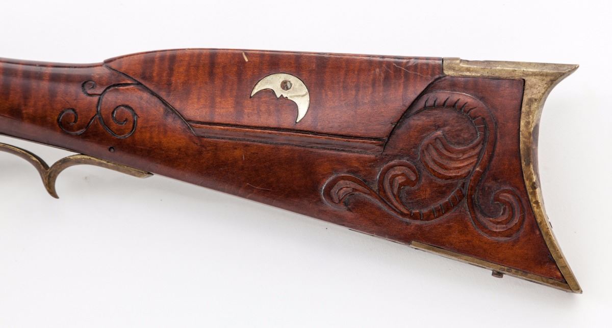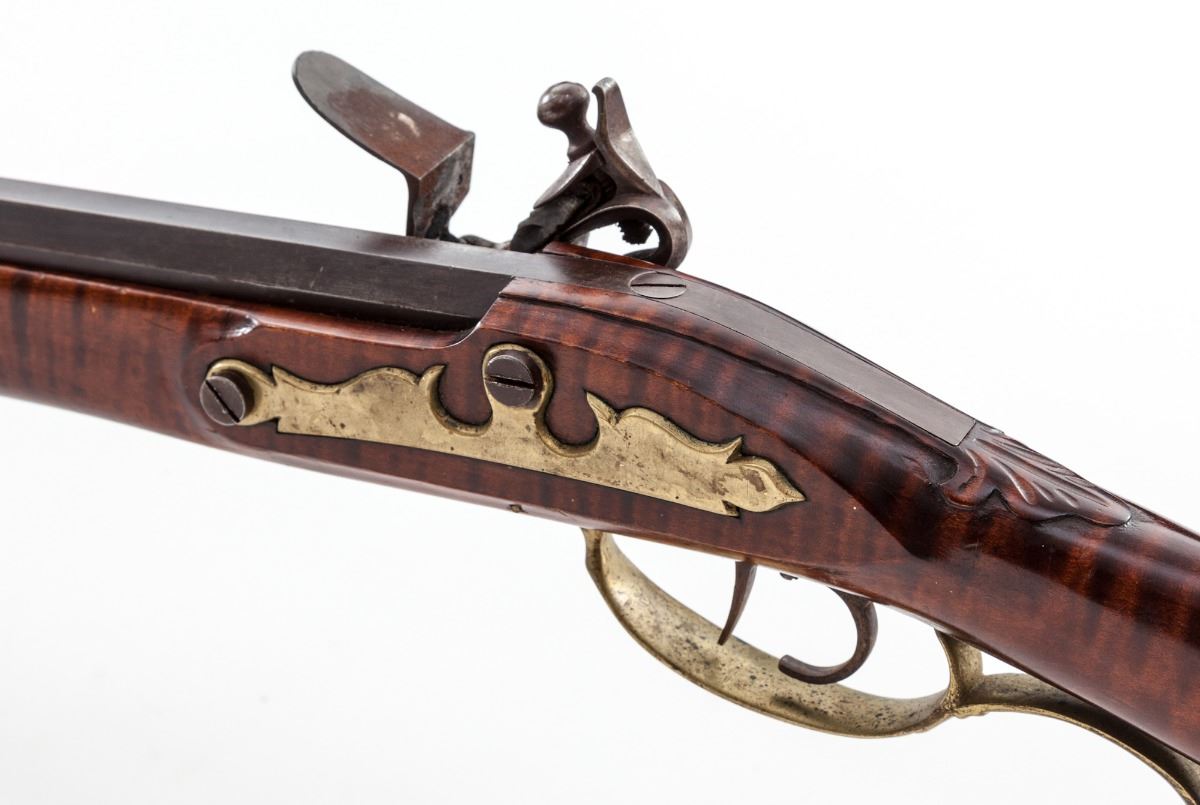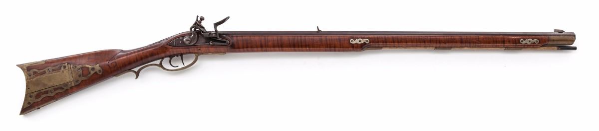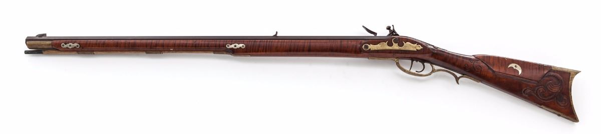 Fullstock Kentucky Style Flintlock Rifle, by unknown maker, NVSN, approx. .30 cal., 28-3/4'' barrel, brown finish, nickel and brass furniture, tiger stripe maple full-length stock, no visible markings, with patchbox and German silver half moon inlaid into cheekpiece. Front sight is dovetailed German silver Rocky Mountain style; rear sight is an iron ''V'' notch. Condition is very good. Stock is sound with no cracks or losses. Patch box is opened by button on toe of stock but is missing part of the latch. Sears will not hold the lock cocked; double set triggers appear to function. Stock is nicely carved behind the breech plug. Est.: $550-$800. (Antique)