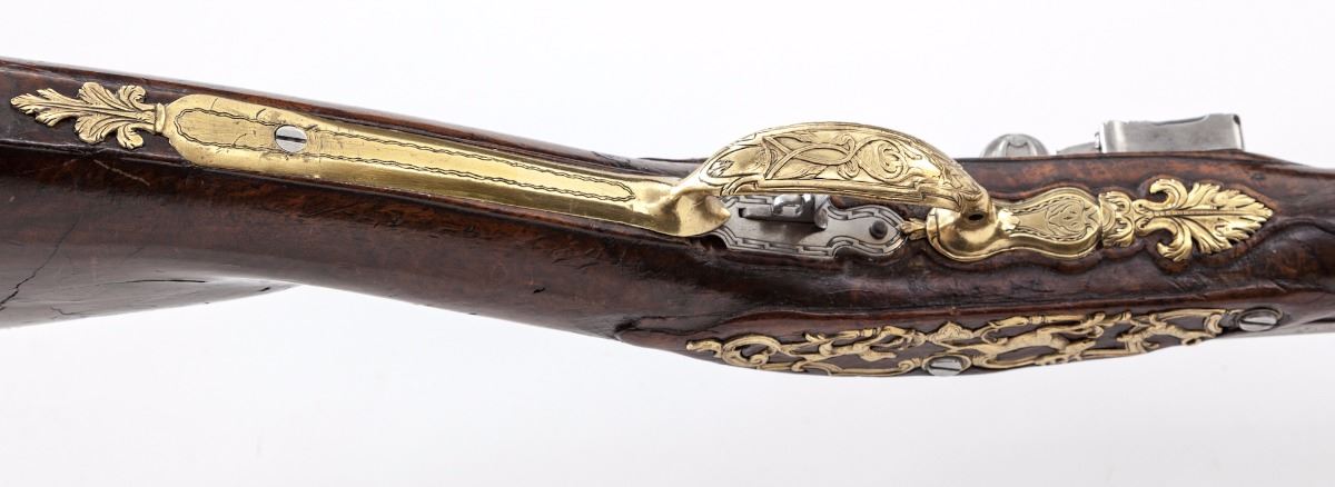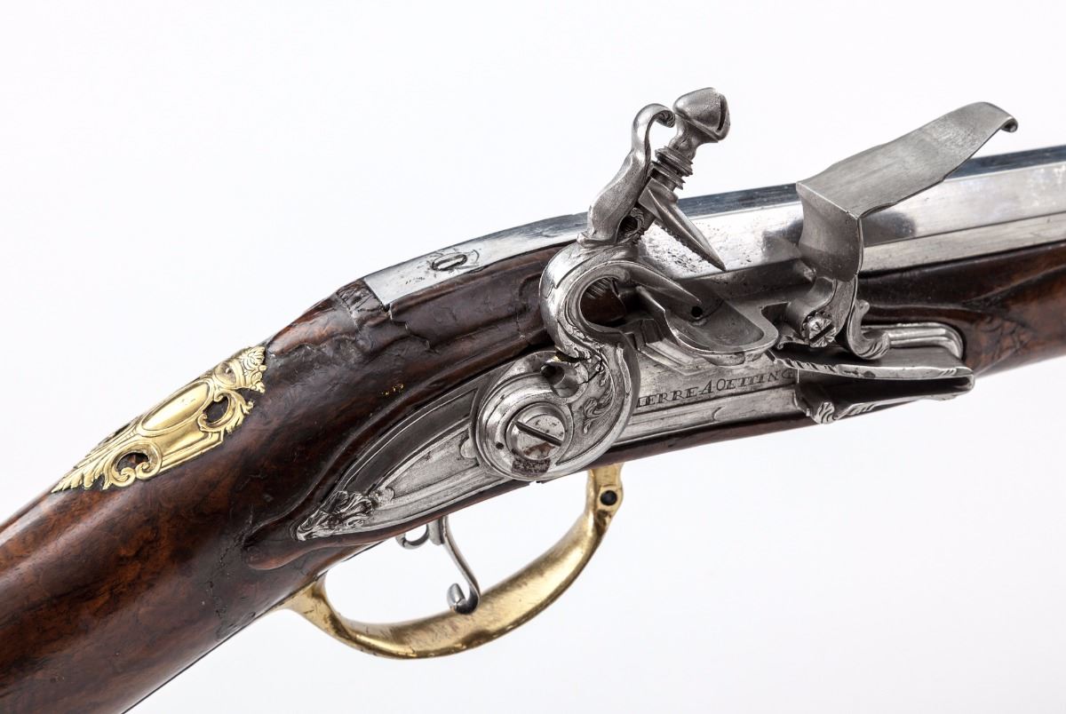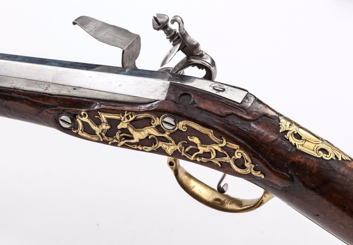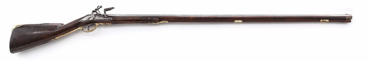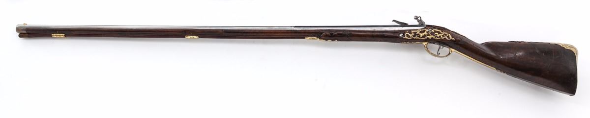 Flintlock Fowling Piece, marked Pierre A Oetting, 20 ga., 44-3/4'' half-round half-octagon barrel, right finish, carved European walnut stock, with brass font sight inlaid into muzzle. Mfg'd circa 1725. Made in Bavaria. Condition is good. Barrel is finished bright; lock sports heavily engraved panels signed ''Pierre a Oetting''. Cock is cracked; top jaw is larger than the bottom and may be replaced. Stock is relief carved in a floral pattern, showing several cracks and breaks and extensive restoration. Furniture is beautifully cast in brass with a floral pattern throughout; left side shows scene of dogs and deer in filigree work; cast triggerguard with a floral pattern. The fore-end cap appears to be replaced with a type of alabaster. Ramrod is a later replacement. Johann Wolf Peter (1664-1732) was gunmaker to the Princes â„¢ttingen-â„¢ttingen. Est.: $2,500-$3,500. (Antique)