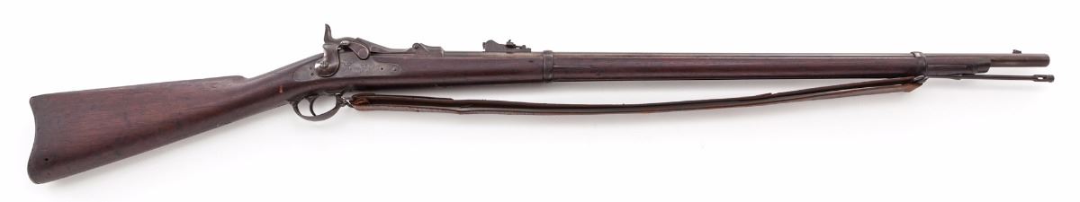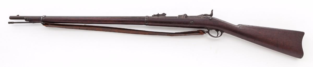 U.S. Springfield Model 1873 Trapdoor Rifle, #98779, .45-70 cal., 32-5/8'' barrel, walnut stock, two barrel bands, long-range rear sight with adjustable leaf, cleaning rod, and brown leather sling. Lock is marked ''U.S. / Springfield / 1873''; top of breech is marked ''U.S. / Model / 1873'', and left side of barrel is marked ''VP/(eagle's head)'' (barely visible). Left side of stock with faint cartouche just above triggerguard. Top edge of buttplate with U.S. markings. Condition is very good. Metal surfaces retain approx. 30% blue with an overall light to medium gray/brown patina. Lock and breechblock markings remain clear. Stock with normal signs of age and wear, impressions, oil darkening, in addition to a hairline crack at wrist. Action is crisp, bore is very good. Leather sling shows considerable wear and cracking but remains intact. Est.: $500-$750. (Antique)