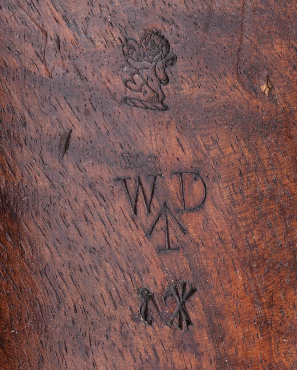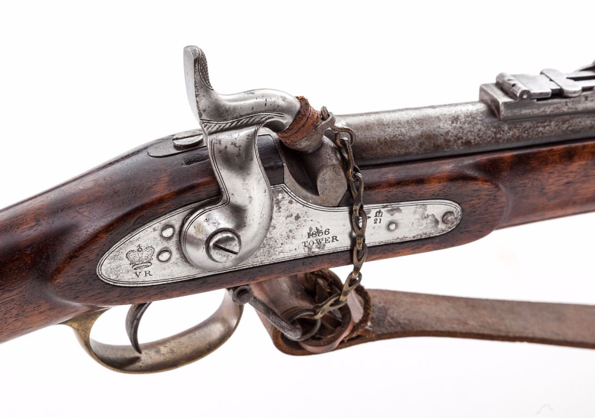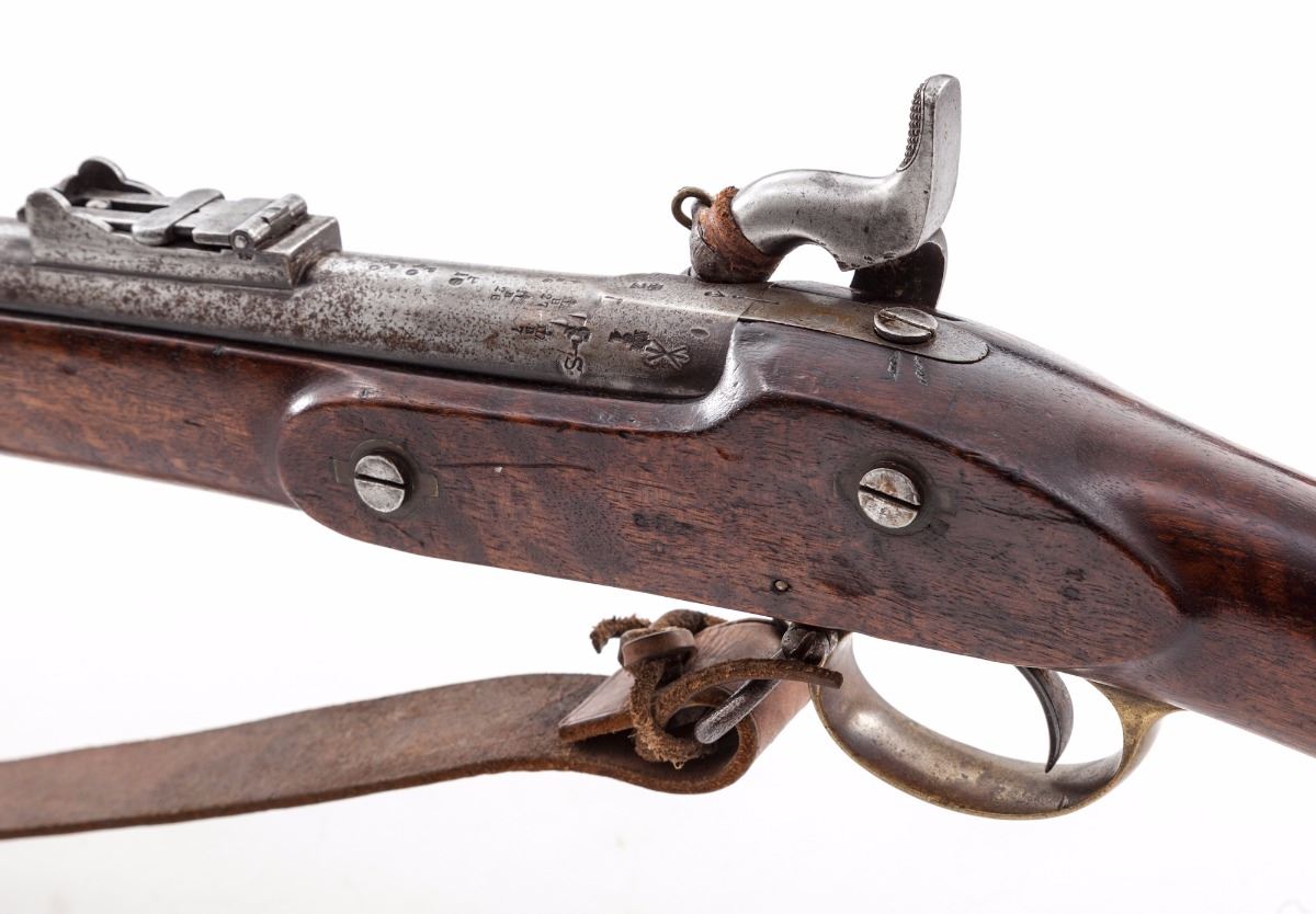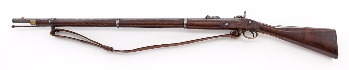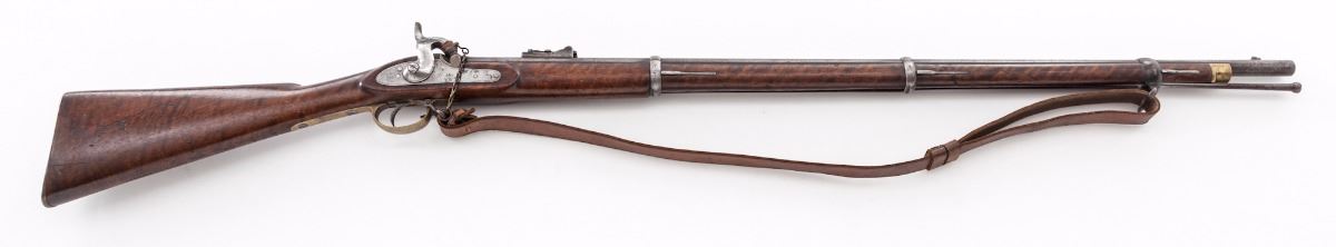 2nd Pattern 1853 Enfield Three-Banded Rifled Musket, by Tower (1856), NVSN, .577 cal., 36'' barrel, lion and ''WD'' cartouched walnut stock, brass buttplate, triggerguard and forend cap. Bottom edge of stock is neatly stamped ''J.P. Beadle-J. Borne New ImG7''. James P. Beadle (1863-1947) was an English painter of historical and military scenes. He is famous for battlescapes depicting scenes from the Peninsula War, Franco-Prussian War, Boer War, and WWI, his most notable work being ''Neuve Chapelle'', 10 March 1915, ''Dawn: Waiting to Go Over, and Breaking the Hindenburg Line''. Ramrod and WWI era leather sling are present, as is leather nipple cover. Condition is very good to fine with light to moderate general frosting to barrel assembly. Stock with just light marks from handling. Action is crisp, bore is fair. Est.: $1,800-$2,400. (Antique)