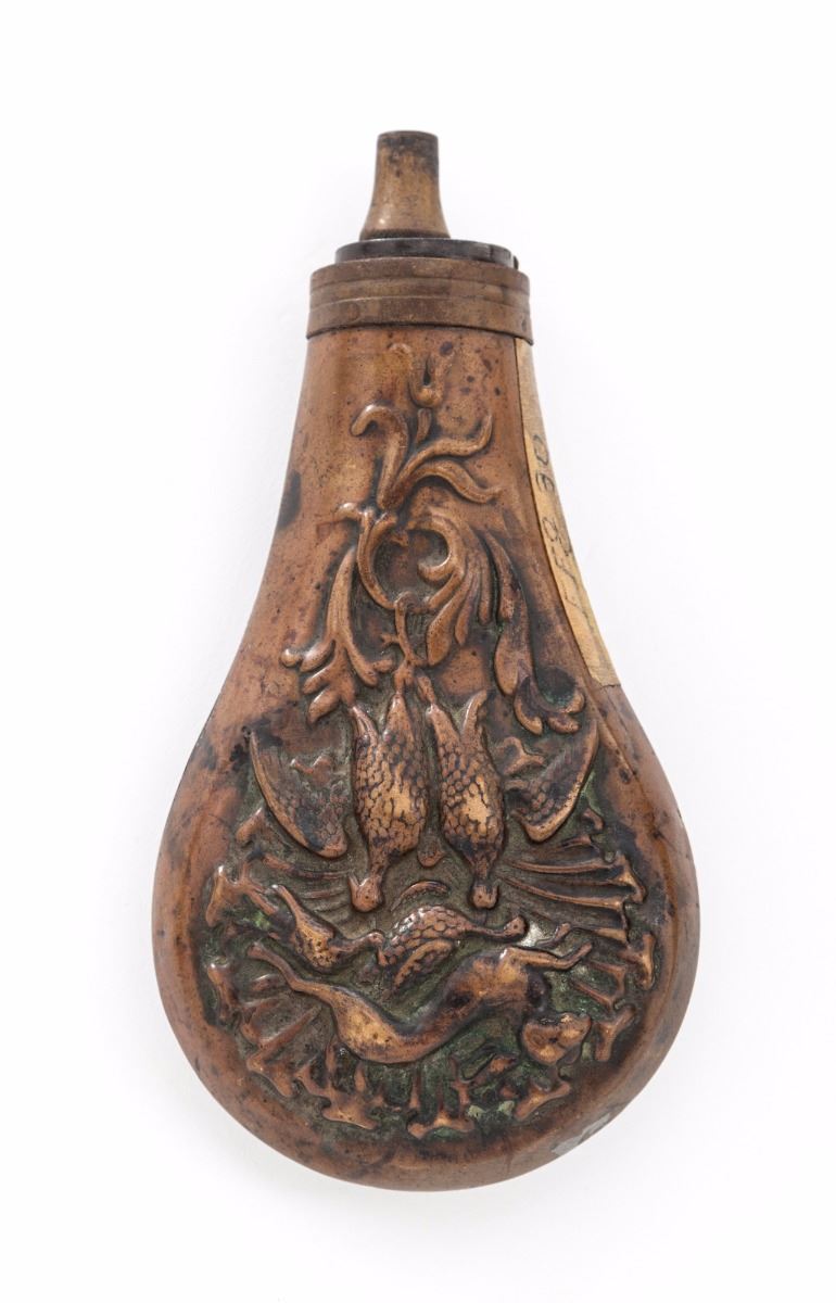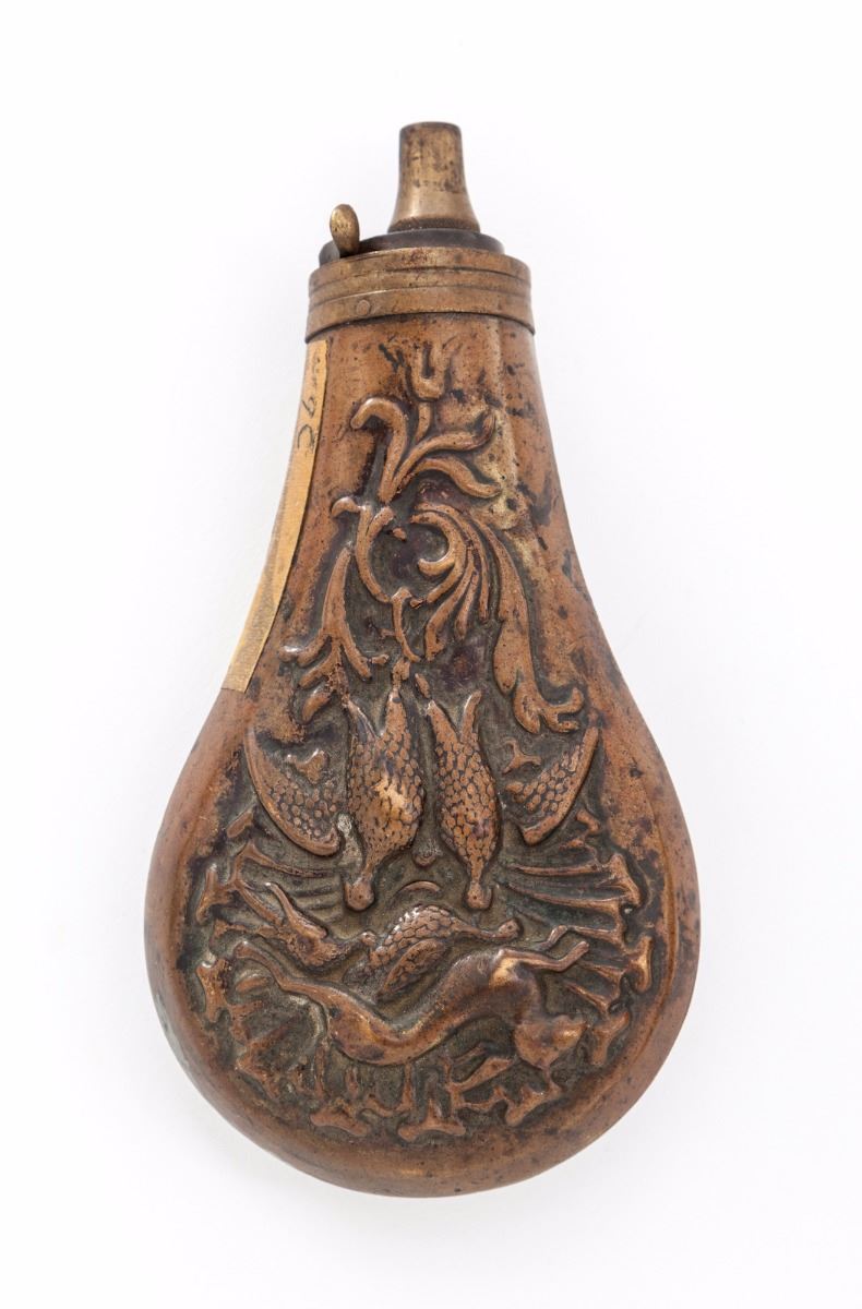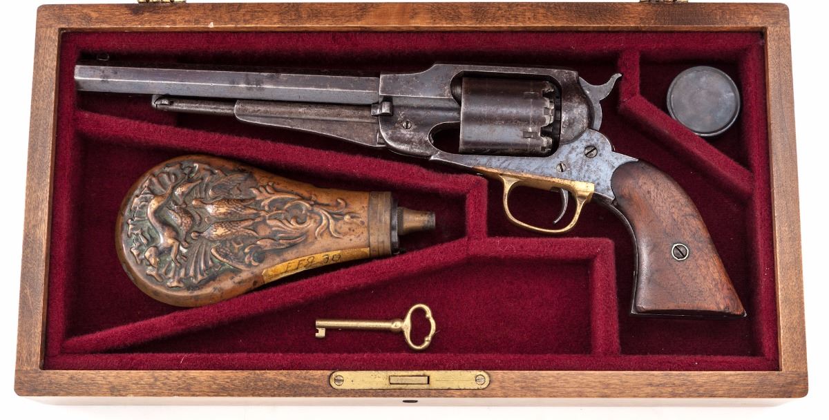Remington New Model Army Percussion Revolver, #55914, blue finish, .44'' bore, 8'' octagonal barrel with front blade sight; cylinder is numbered 5914 with a ''K'' sub-inspector's stamp; triggerguard, frame and barrel have a ''W'' stamp with a ''T'' stamp on the lever catch; left grip panel cartouche is illegible except for the border. In a modern mahogany partition case with red felt lining. Case accessories include a copper hunting theme flask with spout labeled for 30 grains, unmarked cap tin and key. Mechanical condition is good with an oxidized brown bore and uneven wear on the rifling. Back of cylinder has accumulated black and green fouling and chambers are lightly rusted. Frame and barrel have 50% mottled blue that is oxidized and pitted through the finish along with scattered peening marks and scratches. Grips are darkened, worn undersize and dented with a corner missing on the right grip that is filled with a small piece of dark wood. Est.: $600-$900. (Antique)