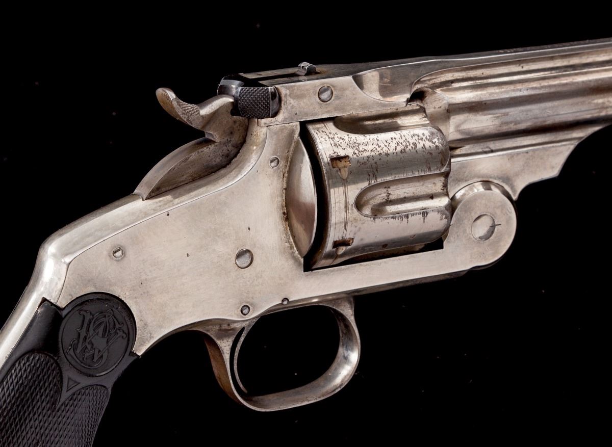 Smith & Wesson New Model No. 3 Single Action Revolver, #3501, .44 Russ. cal., 6'' barrel, nickel finish, checkered hard rubber grips. Condition is excellent retaining approx. 90%-92% original nickel, with most of the losses to cylinder and triggerguard. Face of cylinder, butt of frame, and inside edge of barrel extension with matching serial numbers. Grips are excellent with no cracks or losses. Action is tight with excellent lock up and timing. Bore is bright with a couple areas of corrosion near the breech which should clean. Est.: $3,000-$4,000. (Antique)