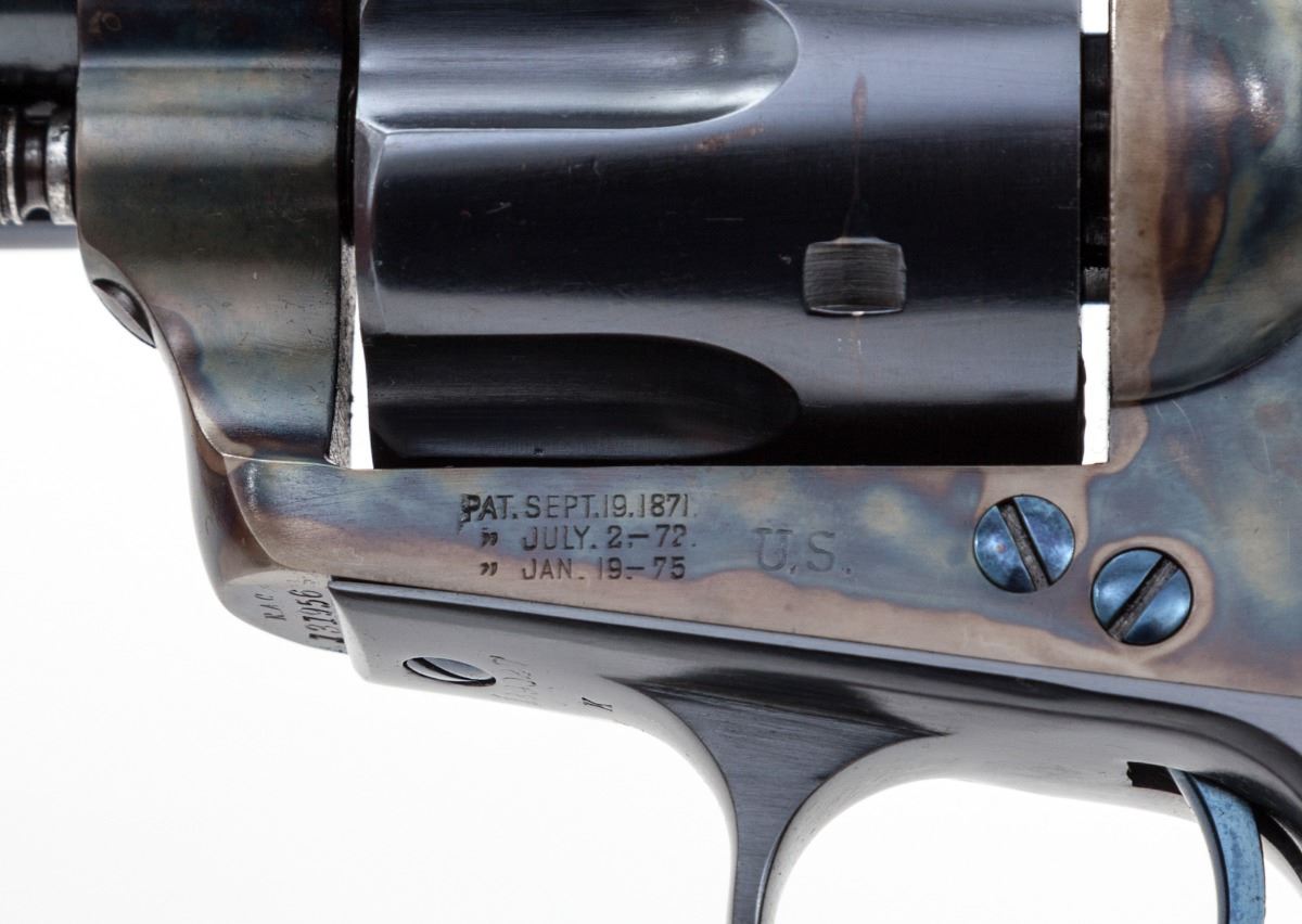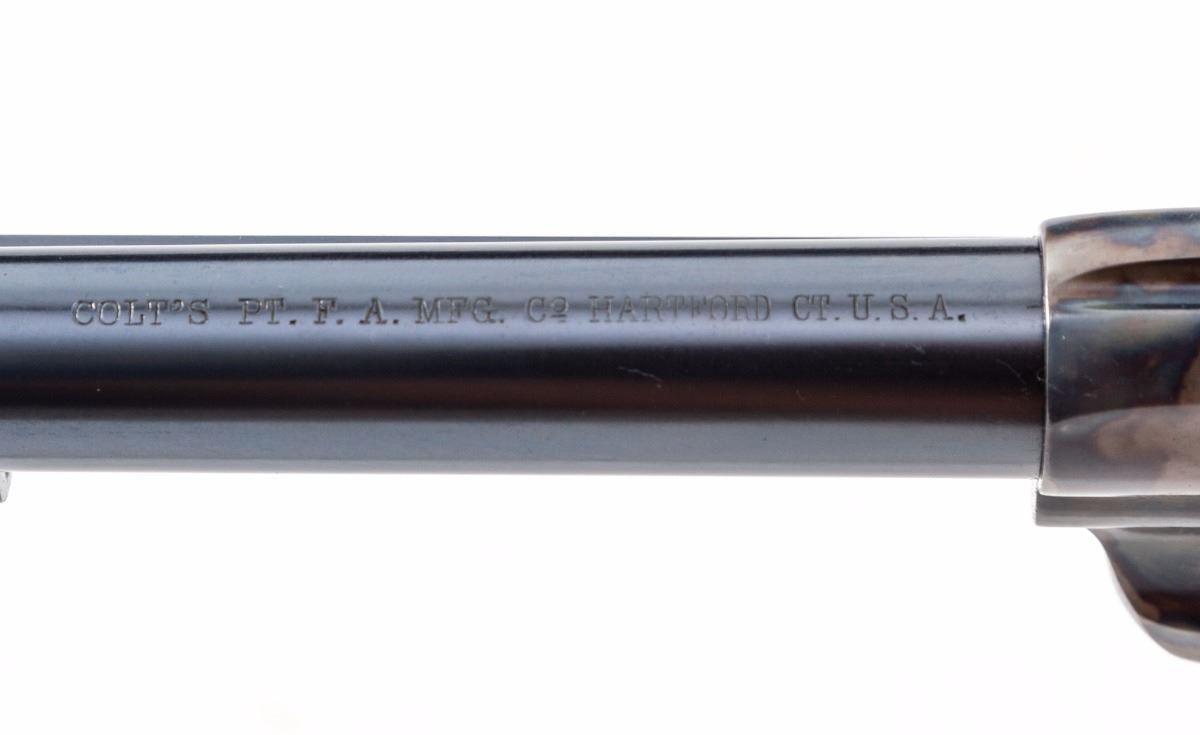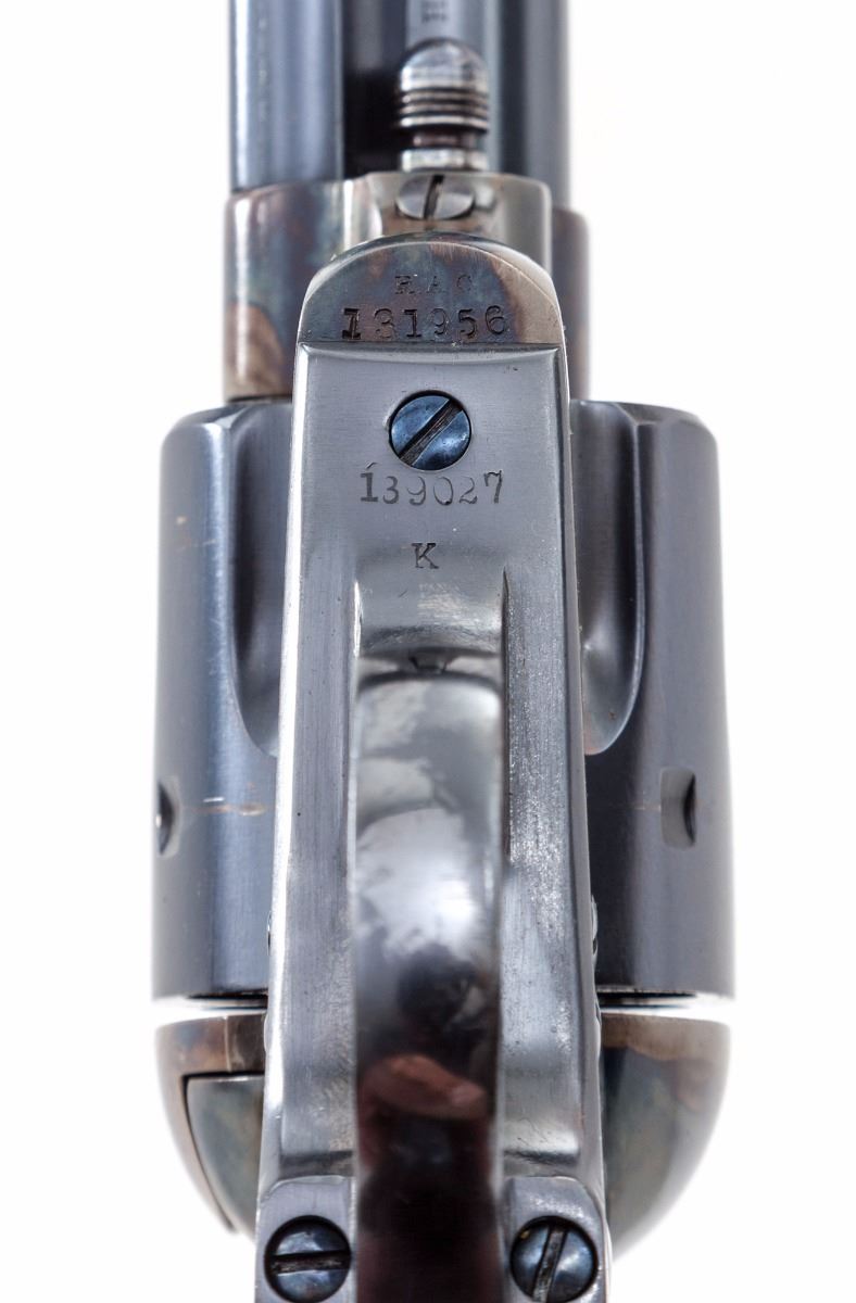 Colt Artillery Single Action Army Revolver, #131956 to frame, .45 Colt cal., 5-1/2'' barrel, blue finish, case hardened frame, one-piece lightly 1902 cartouched walnut grips. Backstrap and triggerguard numbered #139027; barrel with ''HN'' inspector marks; walnut grip with 1902 date, showing faint cartouche which is probably ''OCH'' and are ''RAC'' sub-inspected. Revolver was originally shipped in the early 1890s and overhauled in 1902 for 1903 shipment. Condition is excellent as professionally restored, retaining approx. 99% correct type blue and case hardening. Grips show trace amounts of original varnish. Action remains crisp, bore is fine. Est.: $3,000-$5,000. (C&R/PPT)