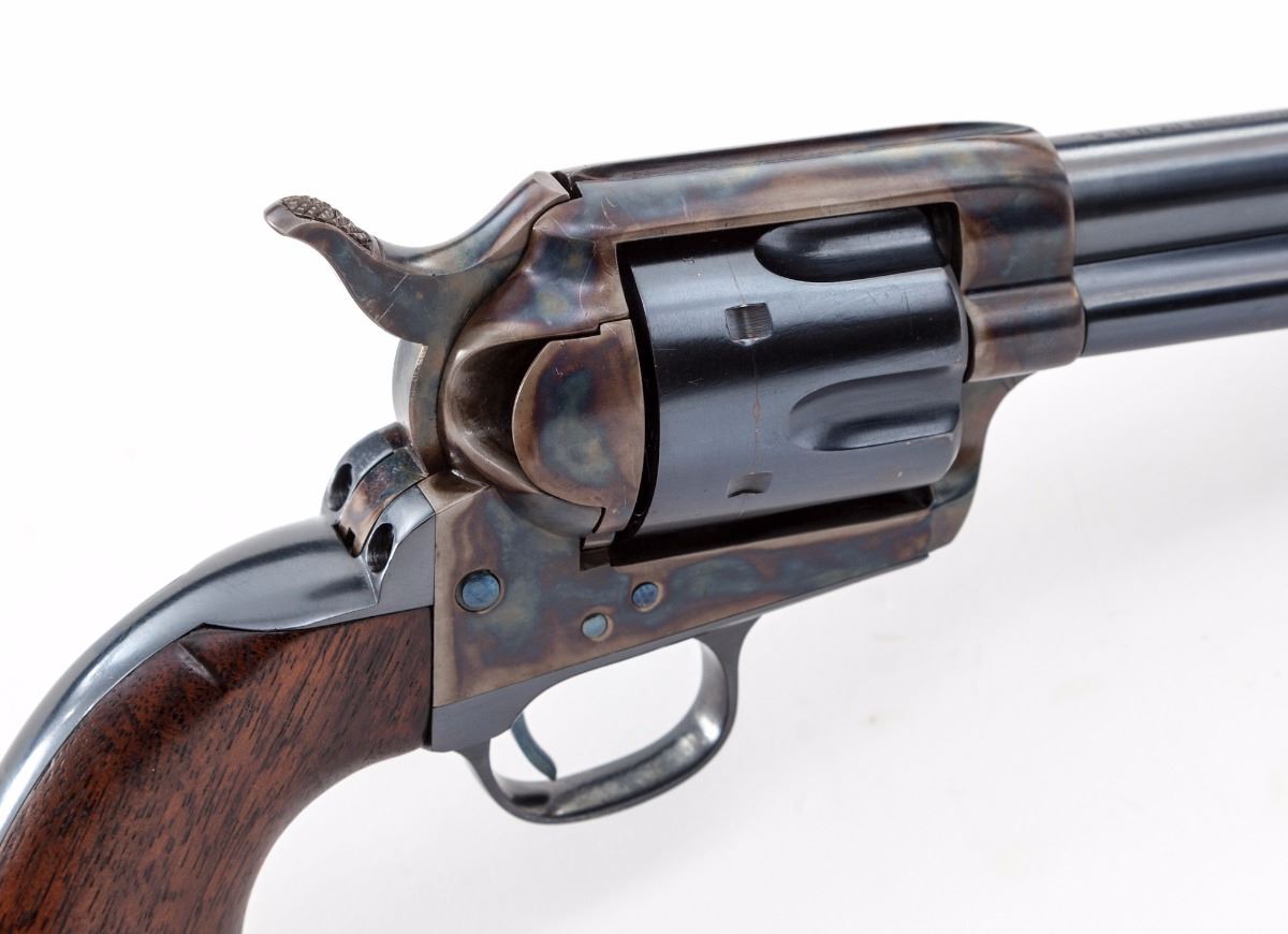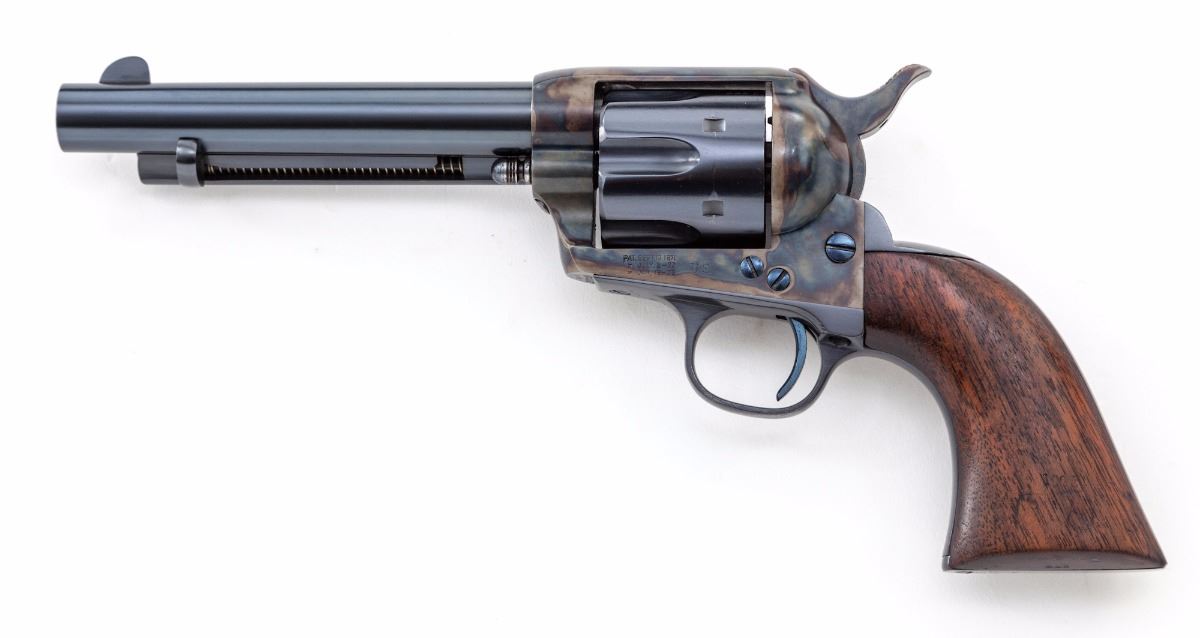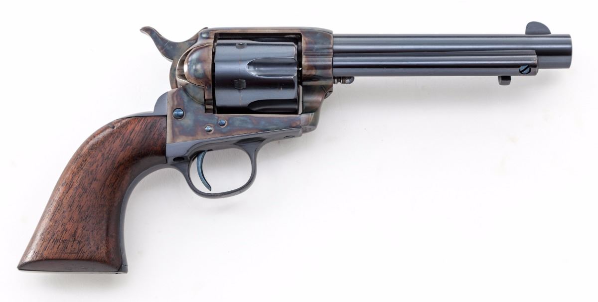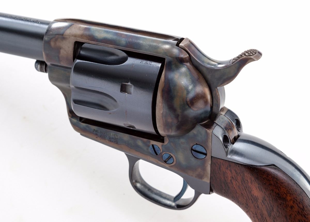 Colt Artillery Single Action Army Revolver, #131956 to frame, .45 Colt cal., 5-1/2'' barrel, blue finish, case hardened frame, one-piece lightly 1902 cartouched walnut grips. Backstrap and triggerguard numbered #139027; barrel with ''HN'' inspector marks; walnut grip with 1902 date, showing faint cartouche which is probably ''OCH'' and are ''RAC'' sub-inspected. Revolver was originally shipped in the early 1890s and overhauled in 1902 for 1903 shipment. Condition is excellent as professionally restored, retaining approx. 99% correct type blue and case hardening. Grips show trace amounts of original varnish. Action remains crisp, bore is fine. Est.: $3,000-$5,000. (C&R/PPT)