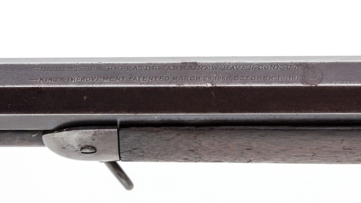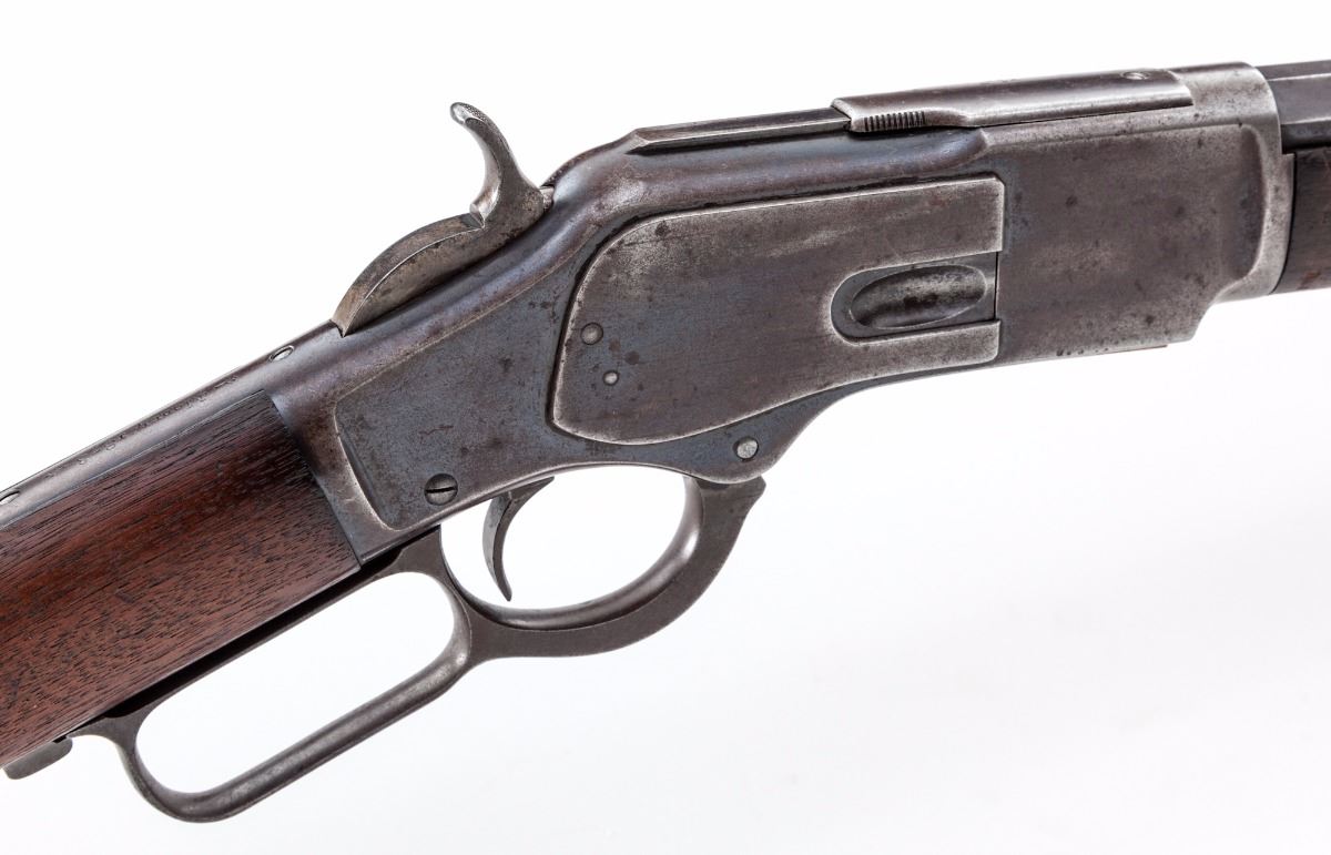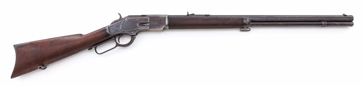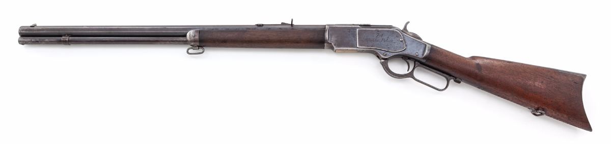 Atlanta Police Marked Winchester Model 1873 Lever Action Rifle, #331930B, .44 WCF cal., 24'' octagon barrel marked in two-lines Winchester's Repeating Arms, New Haven, Conn. U.S.A. / King's Improvement'' and patent dates; straight walnut stock and forend, brass blade front sight, buckhorn rear sight, with dustcover. Upper tang is marked ''1873'', with serial number on lower tang. Winchester records show that this rifle was factory inscribed ''Atlanta Police'', having a rack number of 74 to left sideplate, falling within the proper serial number range of other documented Atlanta Police Dept. marked Model 1873s. Sling swivels were also a special feature ordered with this rifle. With Winchester Factory information sheet stating that this rifle was shipped on Feb. 24, 1890. Bottom edge of stock with 25 notches. Condition is very good overall. Receiver retains approx. 35%-40% original blue finish, mainly in protected areas near sideplate, dustcover and beneath lever; remaining exposed surfaces with a pleasing brown patina. Forend with very little original varnish remaining, as well as a hairline crack that runs the full length of the wood. Stock with scattered light to moderate scratches and impressions. Atlanta Police, Winchester barrel markings and model designation remain clear and well defined. Action is crisp, bore is fine with nice rifling. Rifle shows signs of honest use and age. Est.: $6,000-$7,500. (Antique)