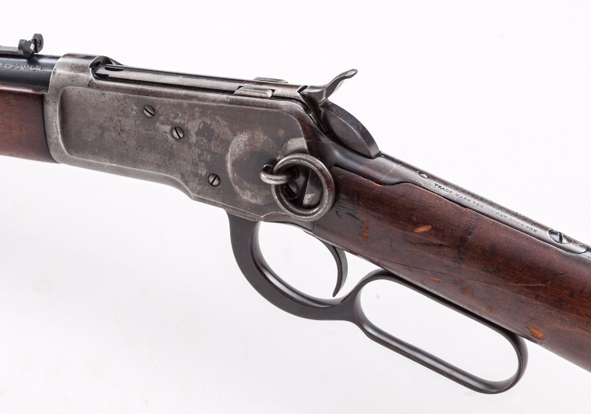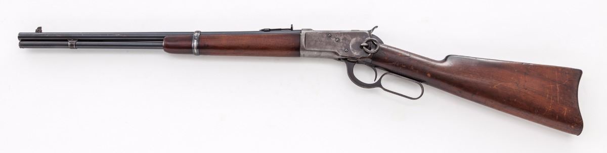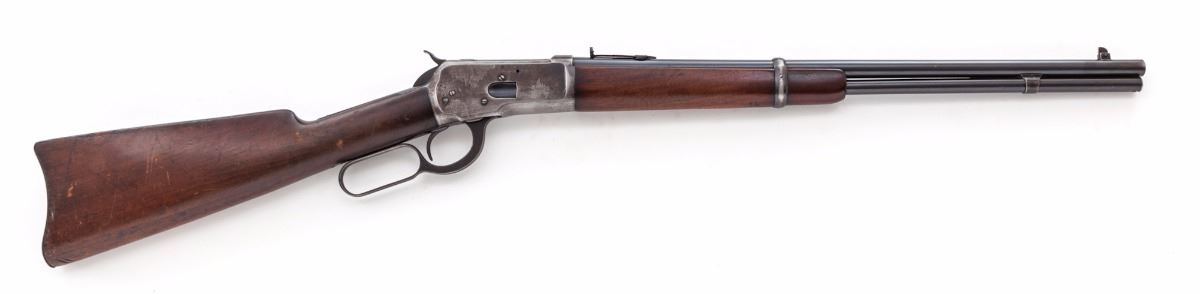 Winchester Model 1892 Saddlering Carbine, #914488, .25-20 cal., 20'' barrel, blue finish, gumwood stock and forend, with Marbles front and rear sights. Mfg'd 1922. Condition is very good. Barrel and mag tube retain approx. 92%+ original blue; frame shows 20%. Gumwood stock with scuffs and scratches and oil darkening, predominantly at wrist area. Forend is about fine. Action is good, bore is bright. Est.: $600-$800. (C&R)