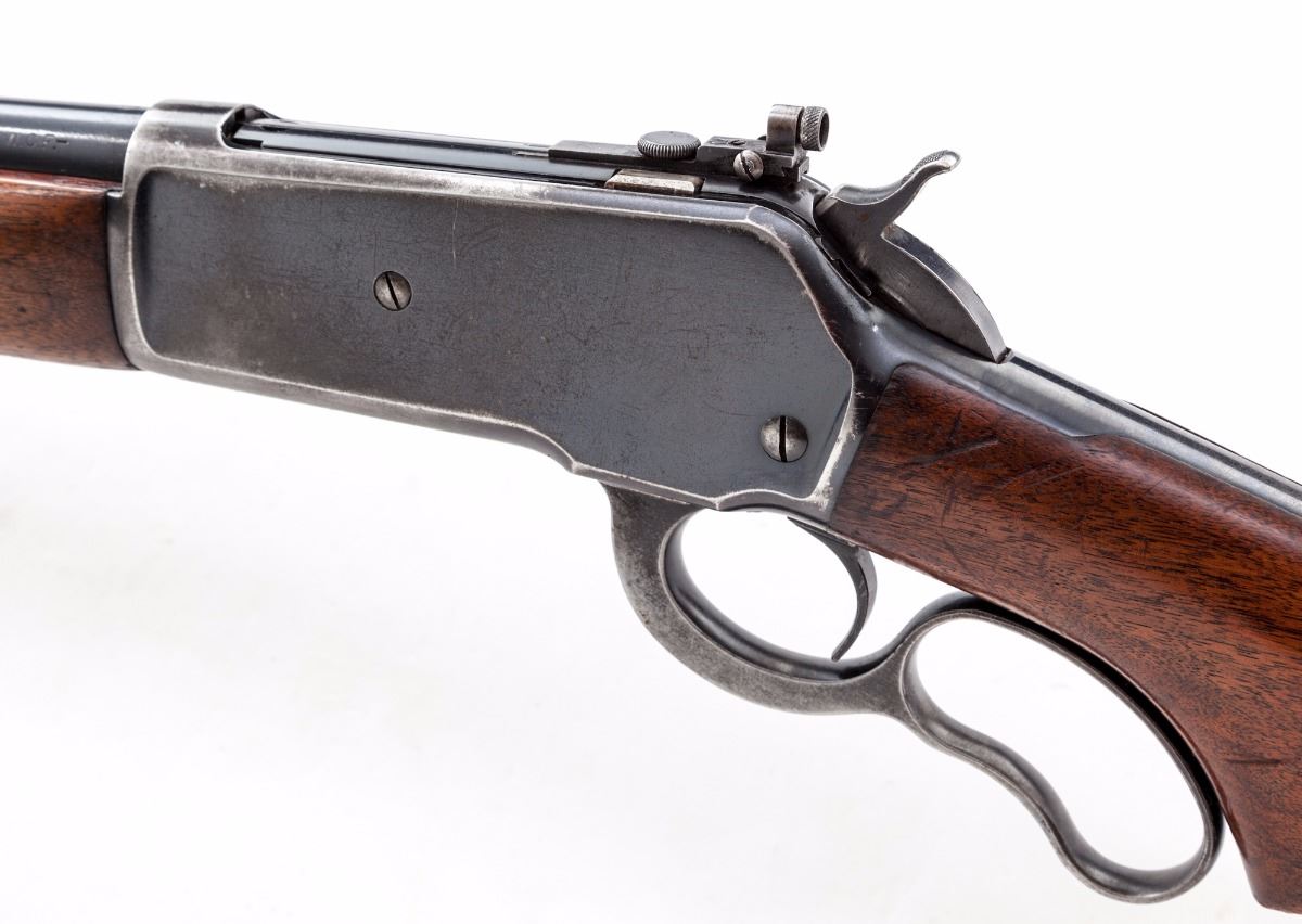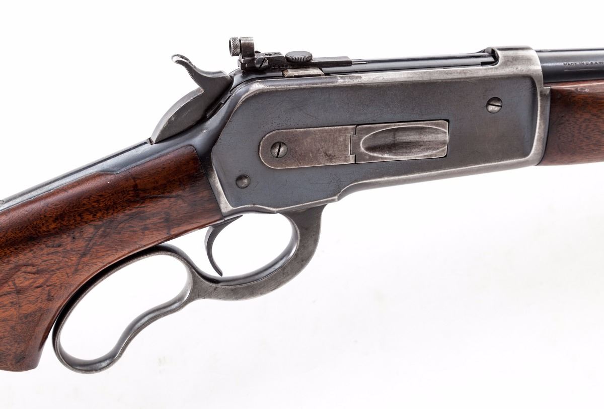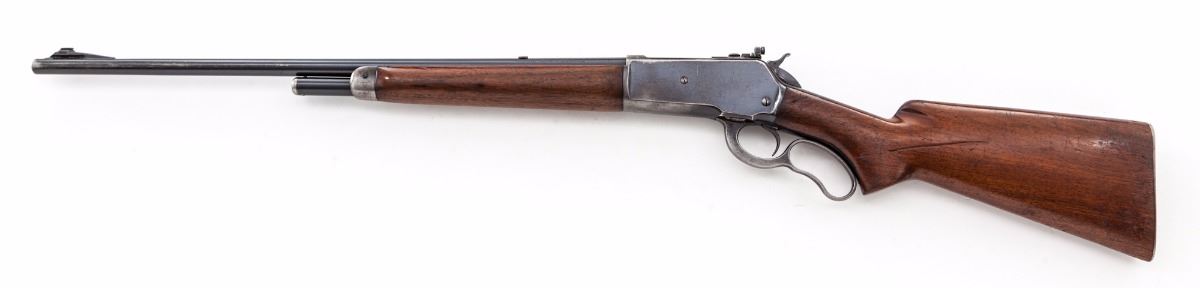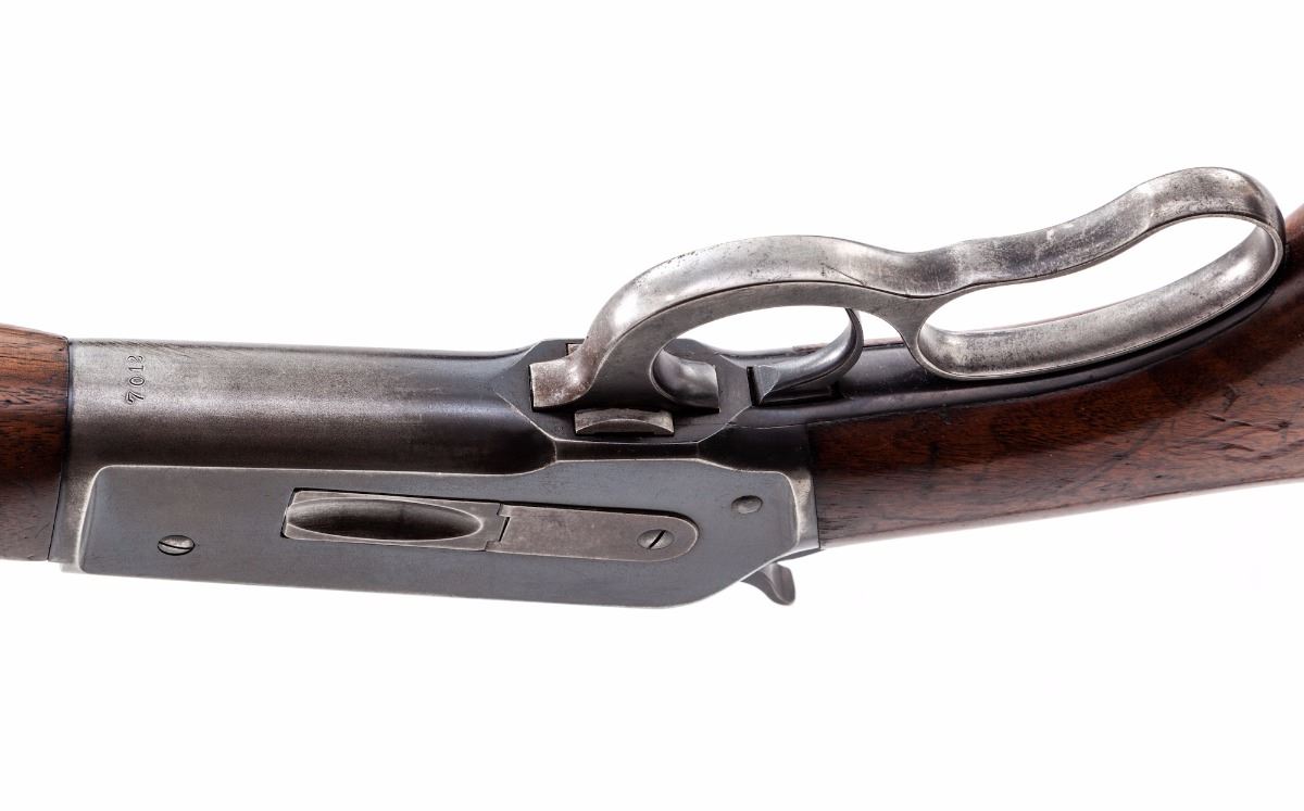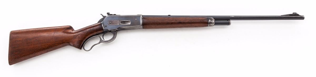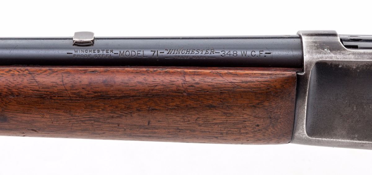 Pre-War Winchester Model 71 Lever Action Rifle, #7012, .348 WCF cal., 24'' barrel, blue finish, smooth pistol-grip walnut stock with long tang, checkered steel shotgun butt, ramped dovetailed brass bead front sight and bolt mounted peep sight. Mfg'd 1936. Condition is very good overall retaining approx. 70%-75% original blue with general scratches and marks from handling to the barrel, and most of the finish loss being to the right side of receiver, lever and balance point. Stock and forend with scratches, impressions and some thinning to the finish, as well as a larger gouge to the left side of buttstock. Action is crisp, bore is excellent. Est.: $1,200-$1,800. (C&R)
