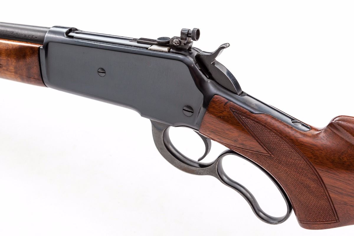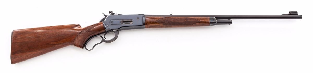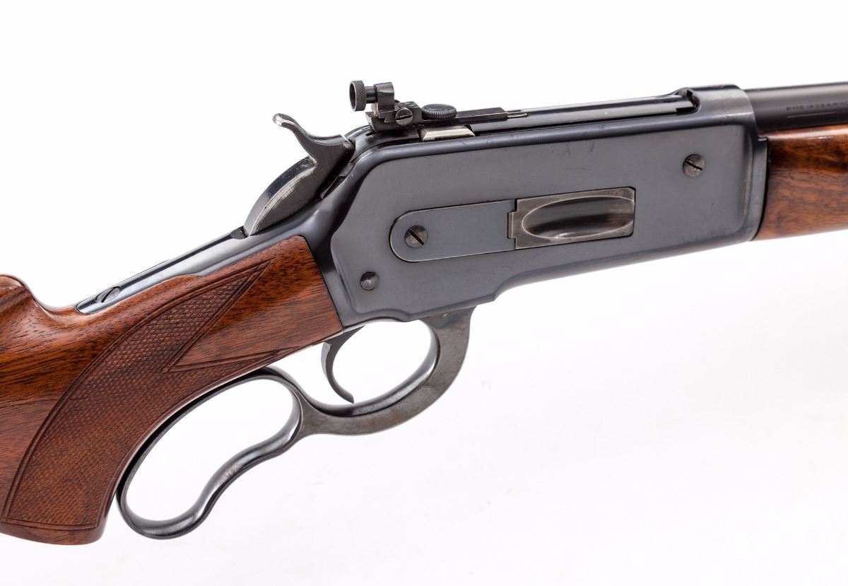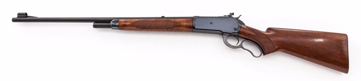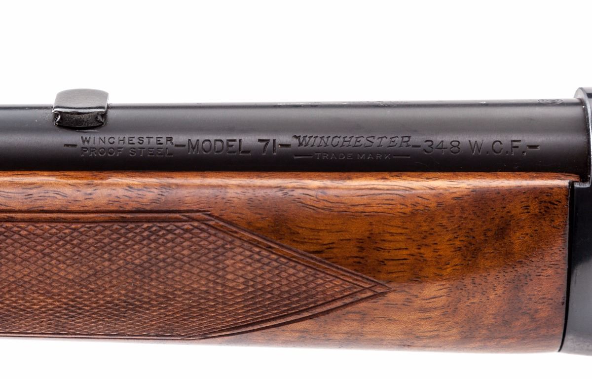 Deluxe Pre-War Winchester Model 71 Lever Action Rifle, #20123, .348 WCF cal., 24'' barrel, blue finish, checkered pistol-grip walnut stock, checkered steel shotgun butt, ramped hooded brass bead front sight and bolt mounted peep sight. Top of barrel and receiver with Winchester proofmarks. Mfg'd 1941. Condition is fine overall retaining approx. 95% original blue with most of the losses to the lever, scuffs to top of barrel near Winchester proofmark, and a larger mark to the left-hand side. Stock and forend with crisp checkering and a few minor surface dents. Action and bore are excellent; bore with nice rifling. Includes original Winchester Model 71 hang tag. Est.: $3,000-$4,000. (C&R)