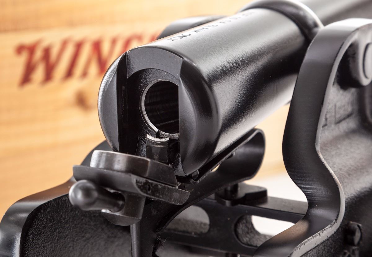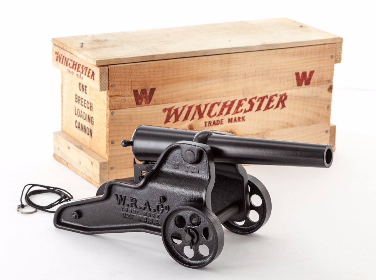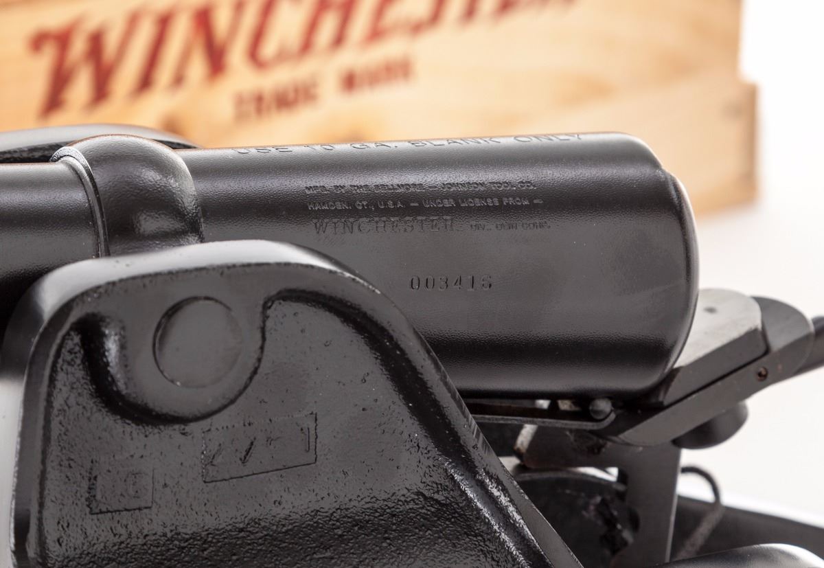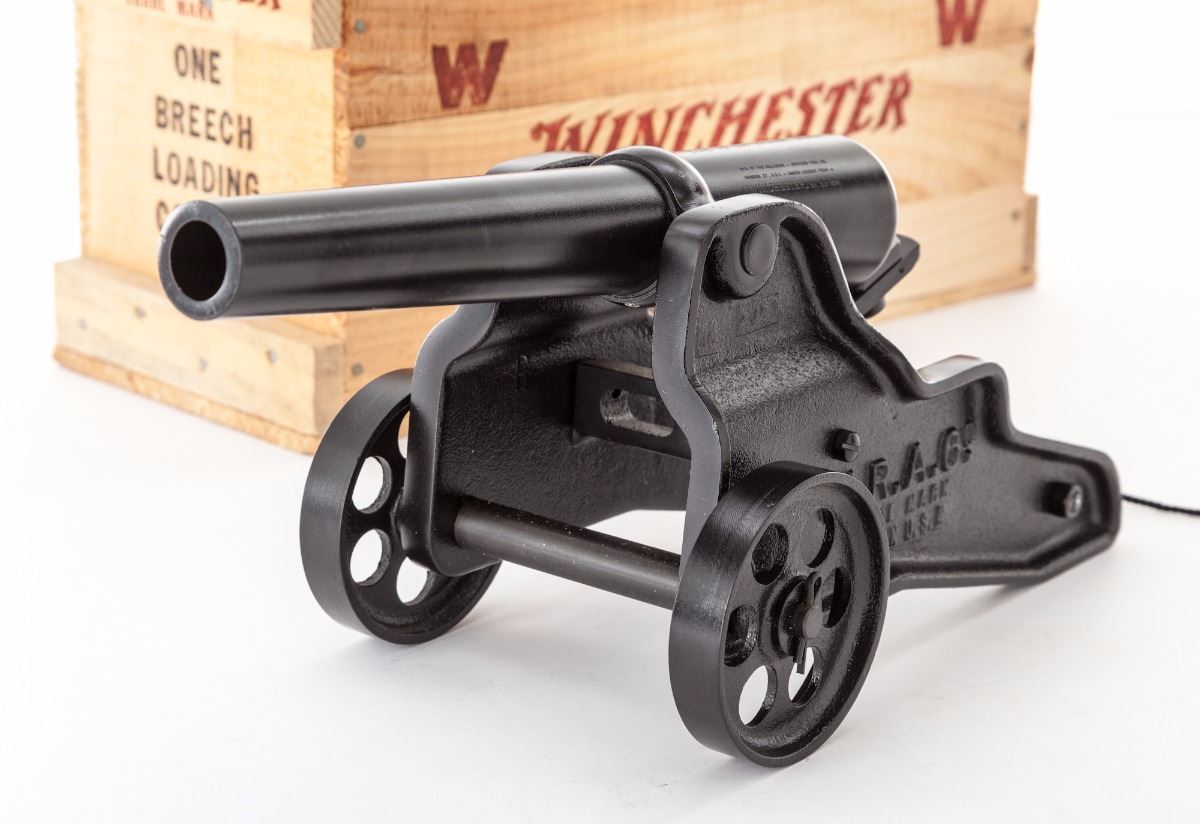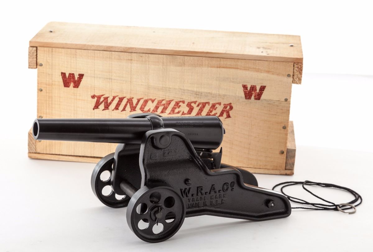 Winchester Model 1898 Signal Cannon, #003416, in original pine Winchester crate, 10 ga. blank only, 12'' long barrel, black finish, marked on right and left side of carriage, ''W.R.A. Co. Trademark Made in USA''; barrel is also marked ''Winchester Mfg'd by Bellmoore-Johnson Tool Co.'' Overall dimensions are 16'' long x 6-1/2'' wide x 7'' high, with an overall weight of approx. 15 lbs. Condition is excellent, appearing as new, with only a few light marks from handling. Pine crate is as new with clear Winchester logo and lettering. Includes owner's manual. Est.: $500-$700.