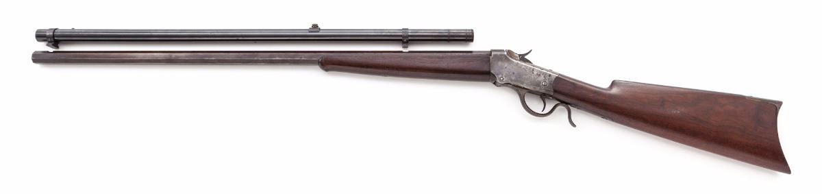 Antique Winchester Low-Wall Single Shot Rifle, #21376, .32-20 cal., 28'' octagonal barrel of No. 1 weight, blue and case hardened finish, walnut stock and forend. Front and rear sights have been removed to facilitate scope. Includes a L.C. Cummins scope with attached rings and light engraving near eyepiece; measures 26-1/8'' in overall length. Mfg'd 1888. Condition is good to very good retaining approx. 60% blue, which has toned brown, with light spots of corrosion and scratches. Case hardened frame has toned a silvery gray. Upper tang screw does not appear to be original. Stock with light scratches and darkening at wrist. Good functioning action, bore is very good. Scope optics remain mostly clear. Est.: $1,000-$1,500. (Antique)