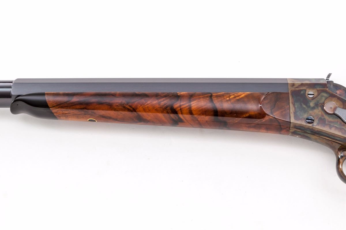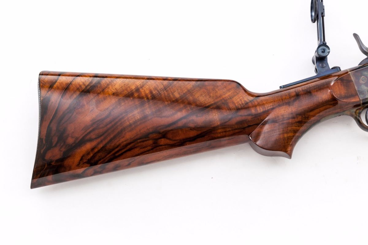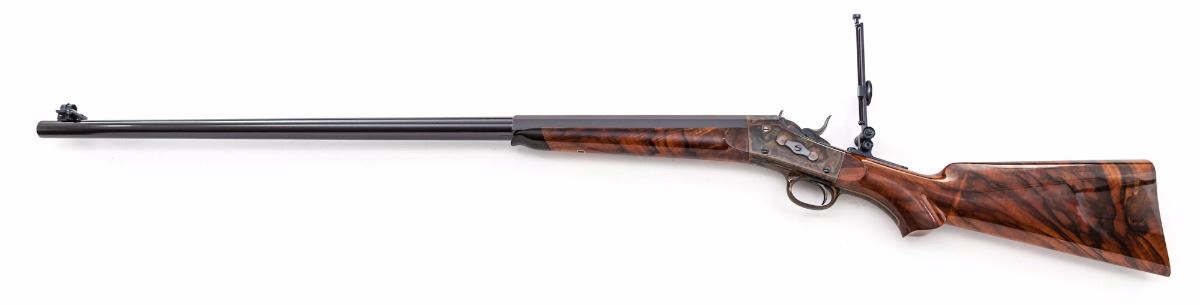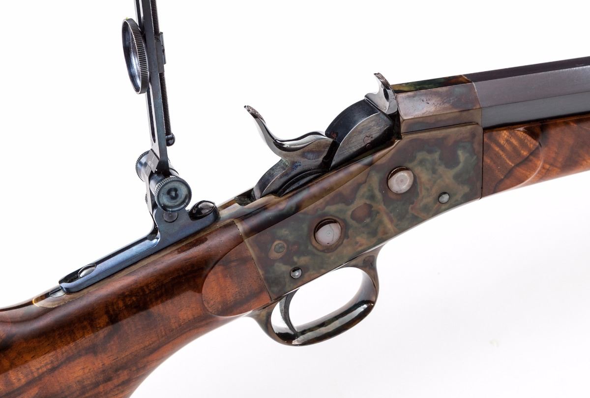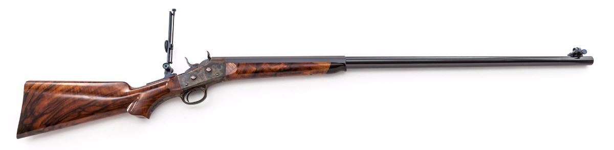 Exquisite Custom Built Remington Rolling Block Single Shot Rifle, by Joe Lozito of Long Island, NY, NVSN, .45-70 cal., having a vividly case colored frame with a brightly polished blue finish, 34'' part-round part-octagon 7-groove barrel and similarly blued block, hammer, pins and pin retainer plate; tang-mounted vernier sight has a nitre blue finish and is graduated from 0 to 450 in 1/10 increments, with a fine windage adjustment on the base and an adjustable spirit level aperture front sight. The ''AAA Grade'' English walnut stock and forend have a very fine high-gloss finish and are uncheckered to highlight the contrasting colors and marble figure; the pistol grip has a contoured ''S'' curved base and the forend has an ''S'' curved ebony tip complementing the base. Length of pull is 13-7/8'' to a finely checkered blued metal buttplate; weight of the rifle is 11-1/8 lbs. Per our consigner, with the exception of the action, the entire rifle, including sights, was built by Mr. Lozito, who passed away in 2015. Overall condition is near new as custom built, appearing to have been fired only a few times. The blue finish has drifted to brown on the pins and areas of the block. Est.: $5,500-$7,500. (Modern)