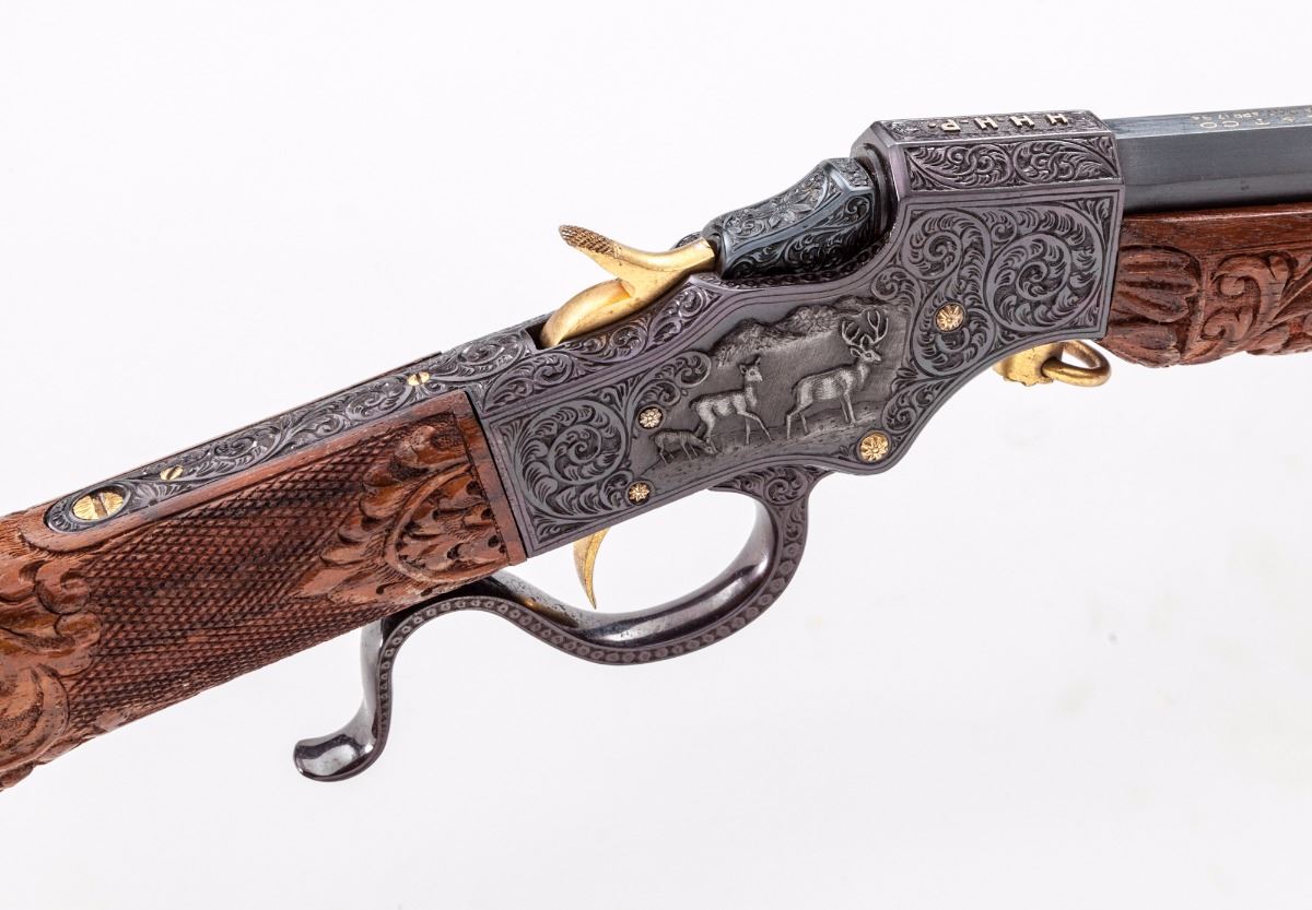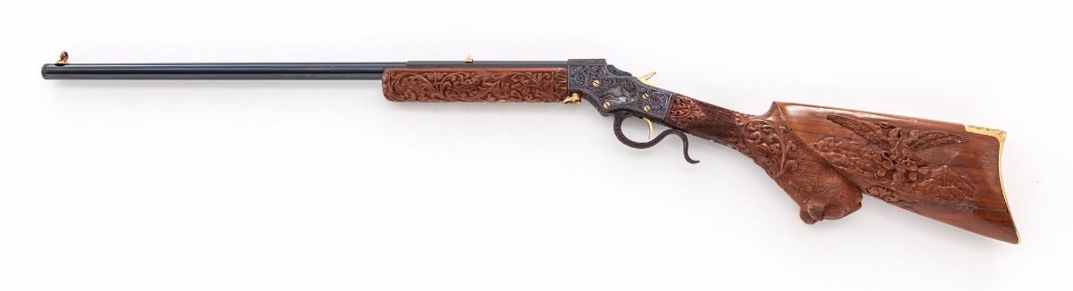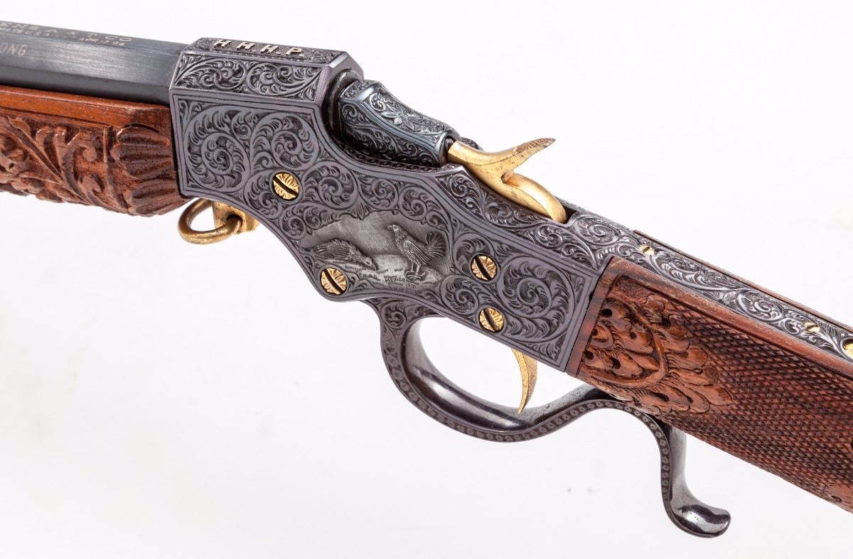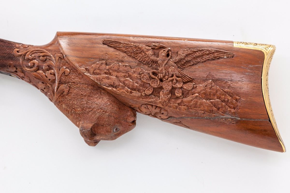 Mexican Engraved Stevens Favorite Single Shot Takedown Rifle, #74, .32 Long cal., 22'' part-round barrel, medium-relief scroll engraving with game scenes signed ''Luis Rojas, Feb. 25, 1976, Mexico''; original owner's initials HHHP in platinum relief to top of frame, with Stevens company name and address inlaid in similar fashion; gold-plated screws, hammer, trigger, sights, and engraved buttplate; front sight is Beech's type combination, fire blue buttplate screws, chisel carved stock with Mexican eagle and cougar motifs; forend with vines and flowers. Condition is near excellent as embellished showing nearly all of the later accomplished blue. Stock with repair to heel area. Action is good, bore is fine. Est.: $750-$1,000. (C&R)