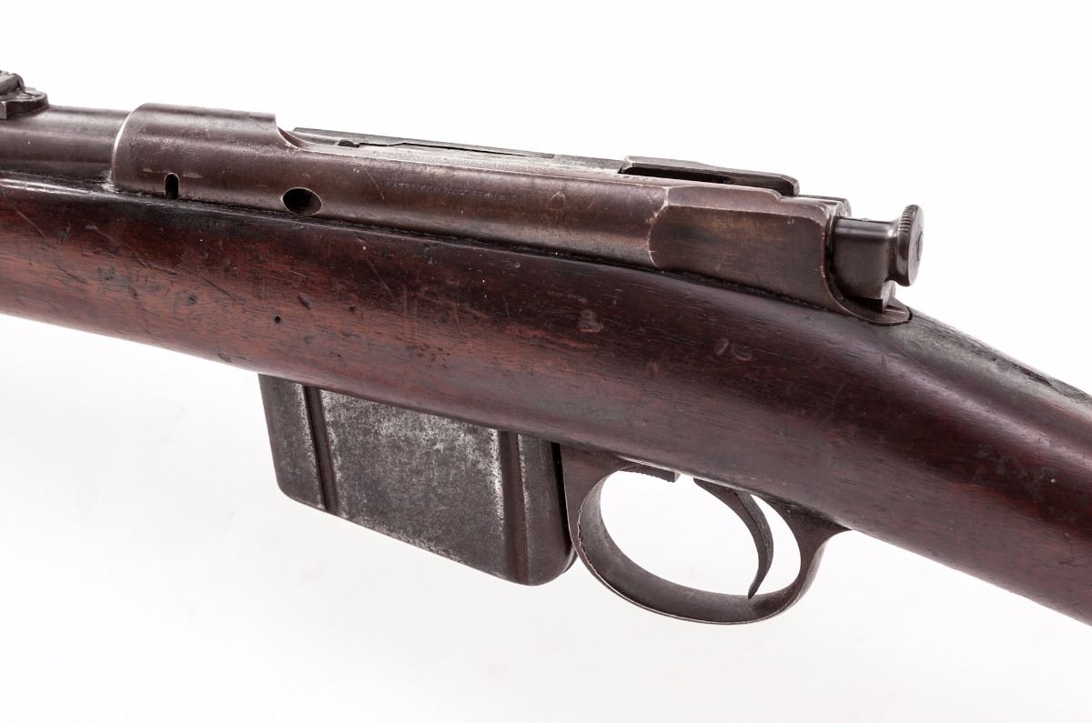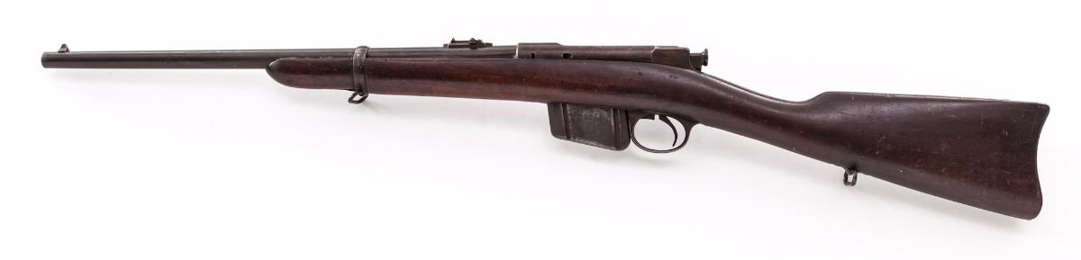 Remington-Lee Model 1885 Bolt Action Carbine, #20575, .45-70 cal., 20'' barrel, brown finish, smooth walnut stock, blade front sight and ladder rear sight. Condition is fine. Finish has turned an even brown with light surface corrosion overall. Unmarked stock is very good+ with no cracks or checks, just the usual handling marks. Action is tight, bore is dark with uniform light corrosion. Est.: $1,200-$1,800. (Antique)