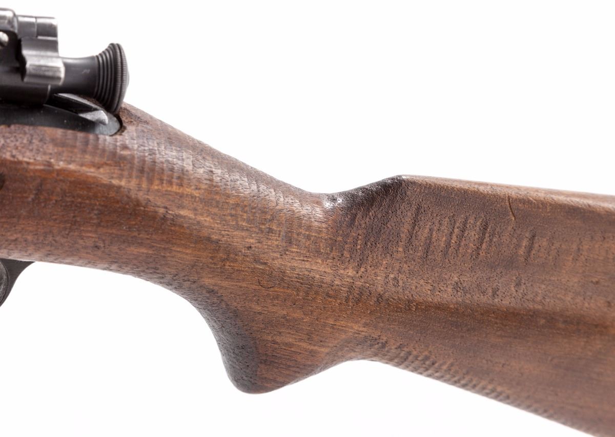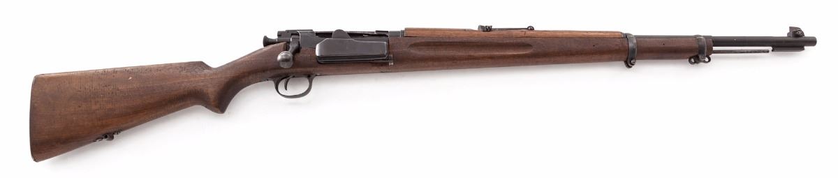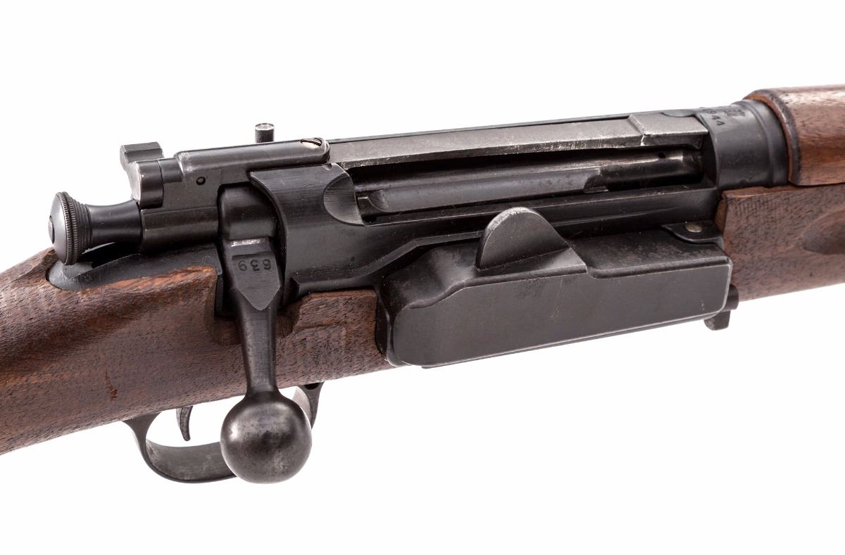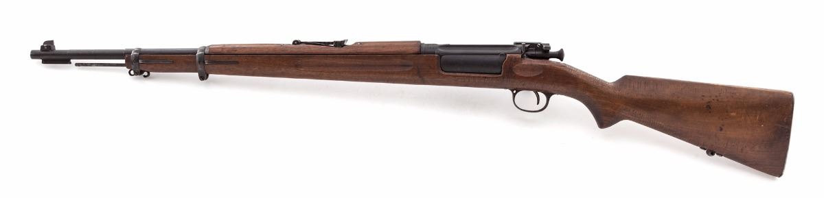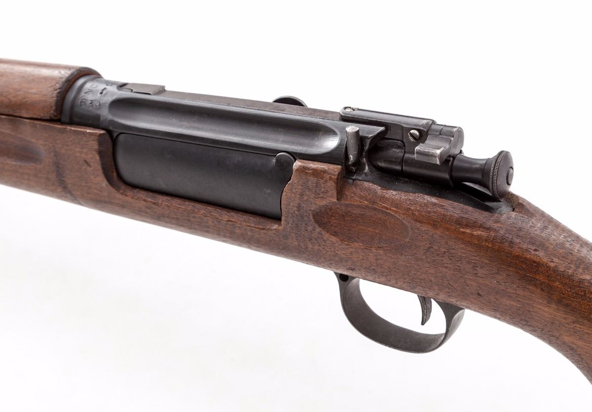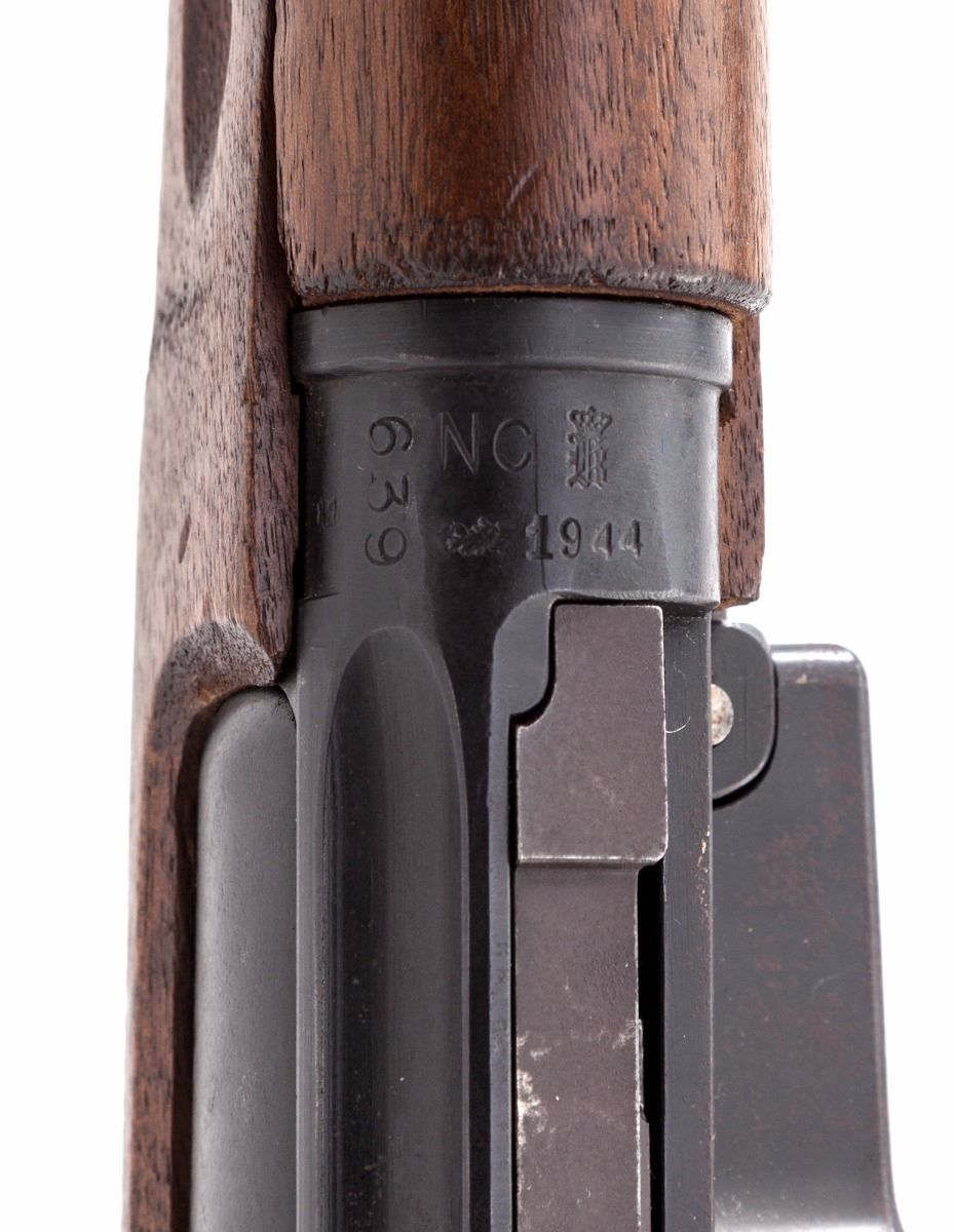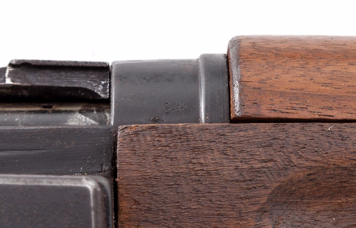 Nazi Occupation Norwegian Krag Bolt Action Carbine, #NC639, 6.5x55mm, 24.04'' barrel, phosphate finish, smooth hardwood stock, blade front sight and military style ladder rear sight. Receiver ring is marked ''NC639 / Konigsberg proof / (Rampant lion) / 1941/WaA8''. Condition is excellent retaining approx. 98% original finish, with mixed numbers as is almost always the case. Bolt and receiver match. Stock is rough showing most of the original rough shaping marks. Buttplate is mismatched with trap and no relief hole under the trap. Action is tight, bore is dark with strong lands and grooves. Rear sight graduated to 2200 meters with some light corrosion to the scale. Est.: $1,200-$1,800. (C&R)