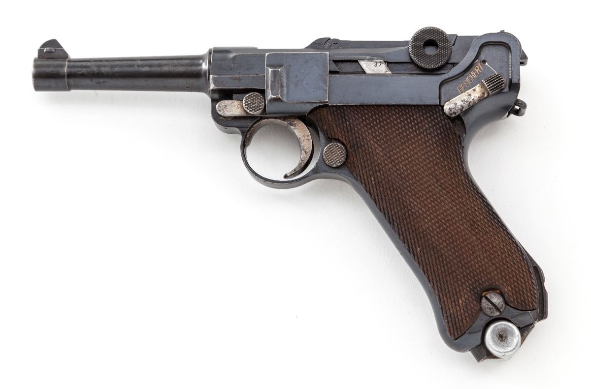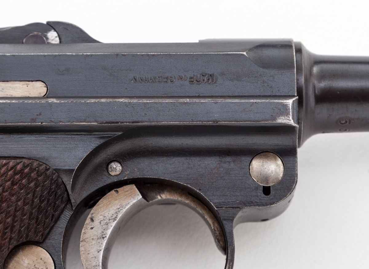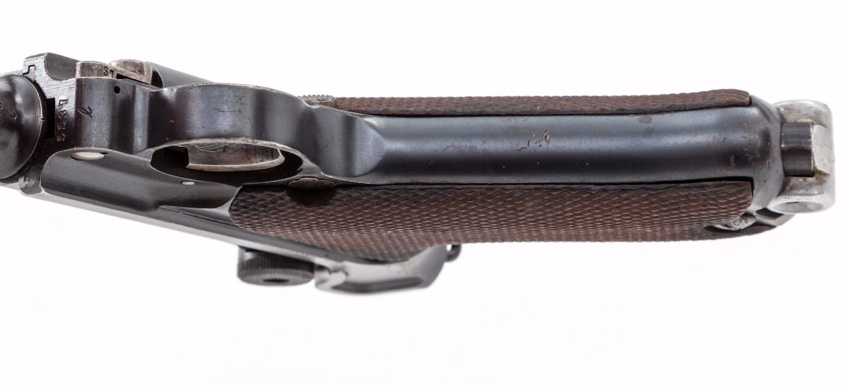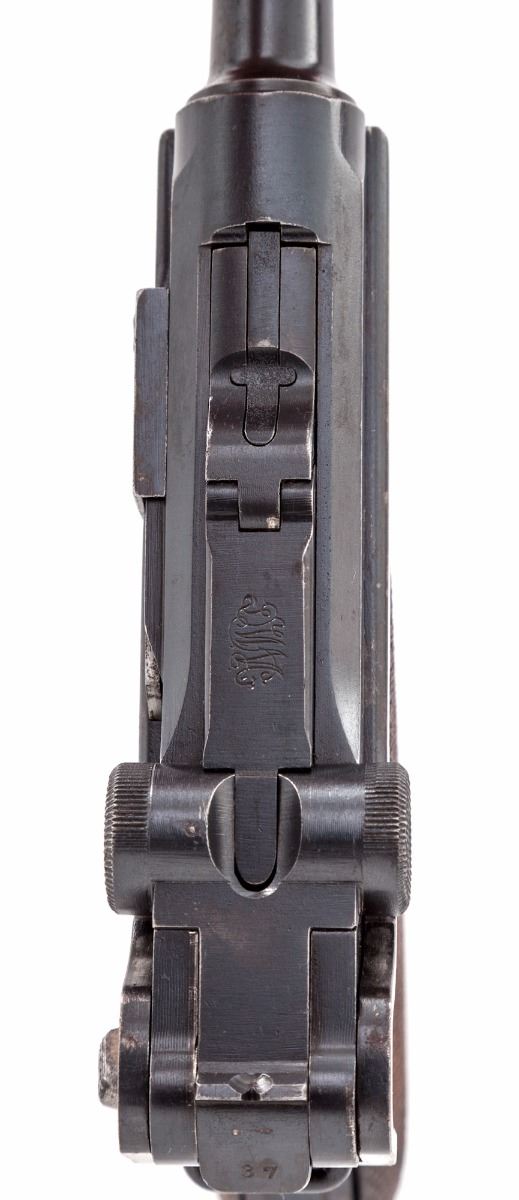 DWM Model 1920 Commercial P.08 Luger, #5537L .30 Luger cal., 3-3/4'' barrel, blue finish, straw small parts, checkered walnut grips, with WWII ''fxo'' blue bodied aluminum based magazine. Crown/N on barrel, barrel extension and front toggle. ''Made in Germany'' on right side of barrel extension. Condition is very good retaining approx. 90% original finish, with light surface corrosion to barrel, right side of frame, and right side grip screw. Straw parts retain approx. 50% color with slight pitting to their surfaces. Action is tight, bore is strong with frosting in the grooves that may clean. Est.: $800-$1,200. (C&R)