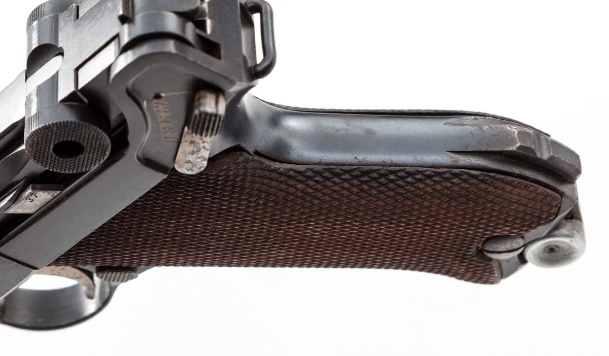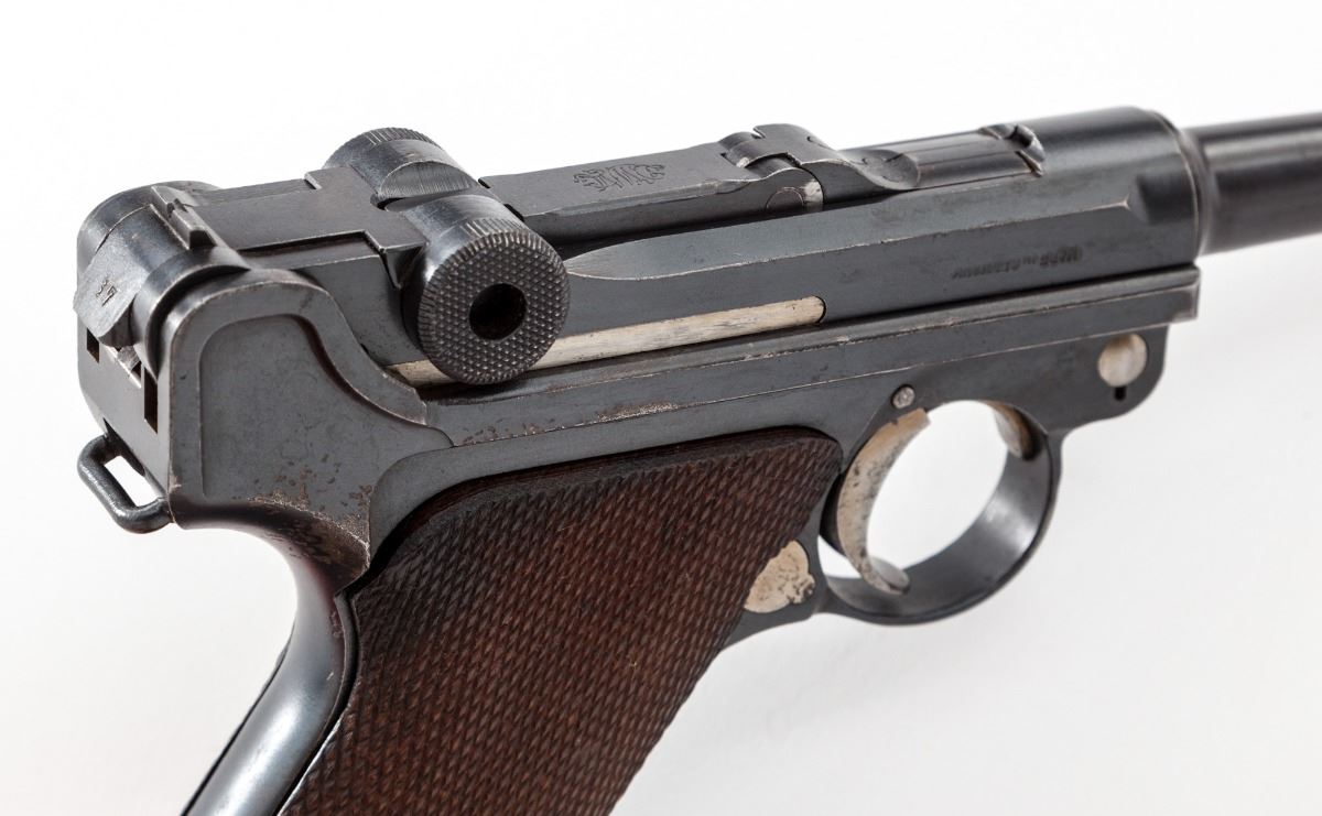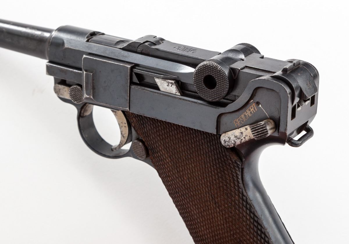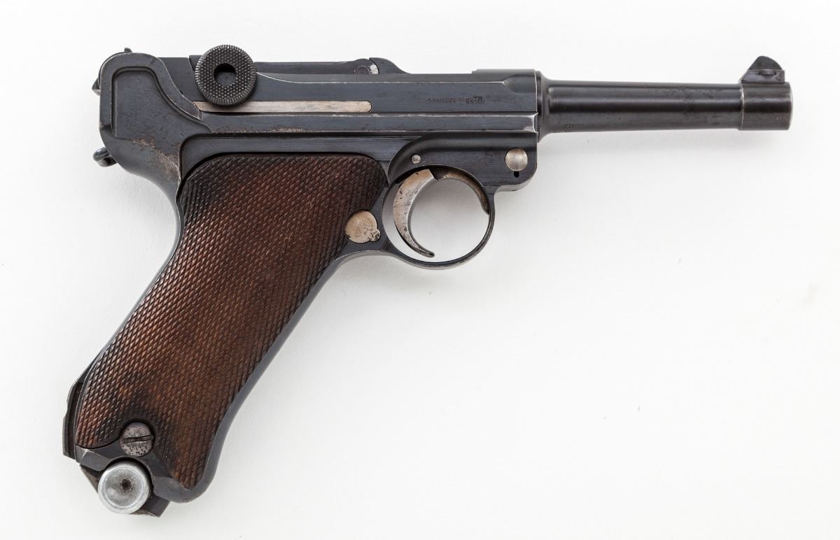 DWM Model 1920 Commercial P.08 Luger, #5537L .30 Luger cal., 3-3/4'' barrel, blue finish, straw small parts, checkered walnut grips, with WWII ''fxo'' blue bodied aluminum based magazine. Crown/N on barrel, barrel extension and front toggle. ''Made in Germany'' on right side of barrel extension. Condition is very good retaining approx. 90% original finish, with light surface corrosion to barrel, right side of frame, and right side grip screw. Straw parts retain approx. 50% color with slight pitting to their surfaces. Action is tight, bore is strong with frosting in the grooves that may clean. Est.: $800-$1,200. (C&R)