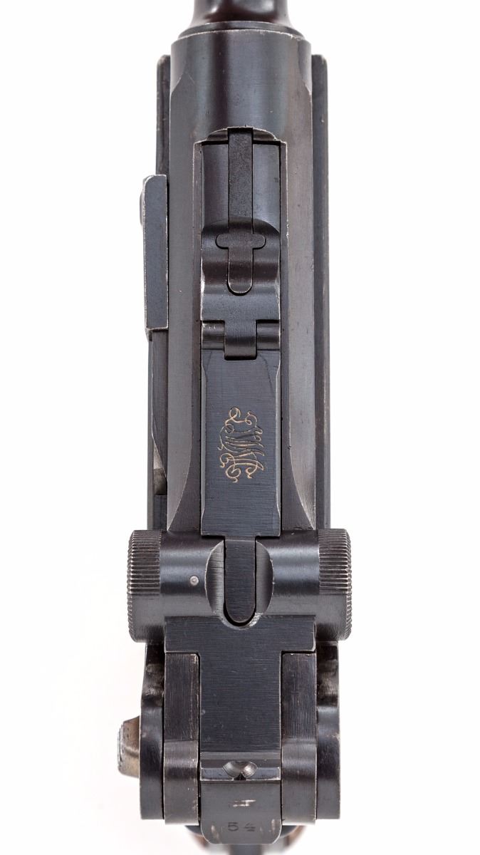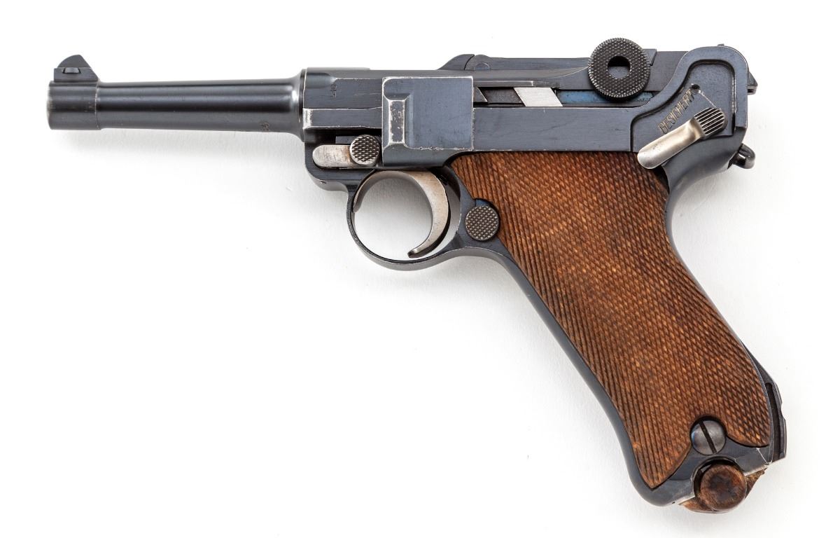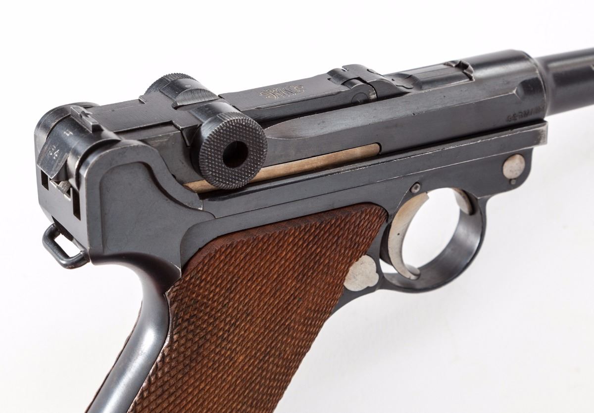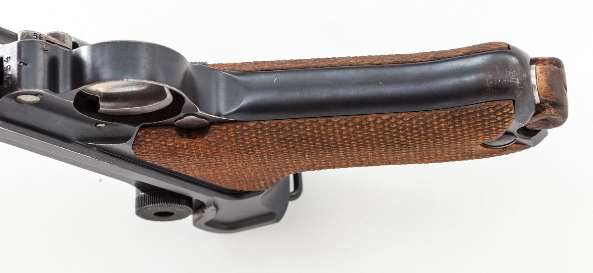 DWM 1920 Commercial Luger, #5754i, 9mm, 4'' barrel, blue finish, checkered walnut grips, with ''(crown)/N'' proofmark on barrel and left side of barrel extension; Germany import stamp on right barrel extension. No chamber markings. Firing pin is not numbered as is common in these post-WWI pistols assembled with both military and commercial parts. Three (3) magazines are included: One nickel bodied with wood base bearing the #5**4 and may be original to the pistol; one blue bodies with black plastic bullseye base; and one Mec-Gar reproduction mag. Condition is excellent, with all matching numbers including grips. Finish retains approx. 95% original blue with most of the loss to the muzzle and high points of the disassembly plate; straw parts retain approx. 85% original color. The numbered grips are excellent with a small amount of flattening to the checkers, and one small chip missing behind the safety. Action is tight, bore is excellent. One of the better 1920's we have seen recently. Est.: $1,500-$2,500. (C&R/PPT)