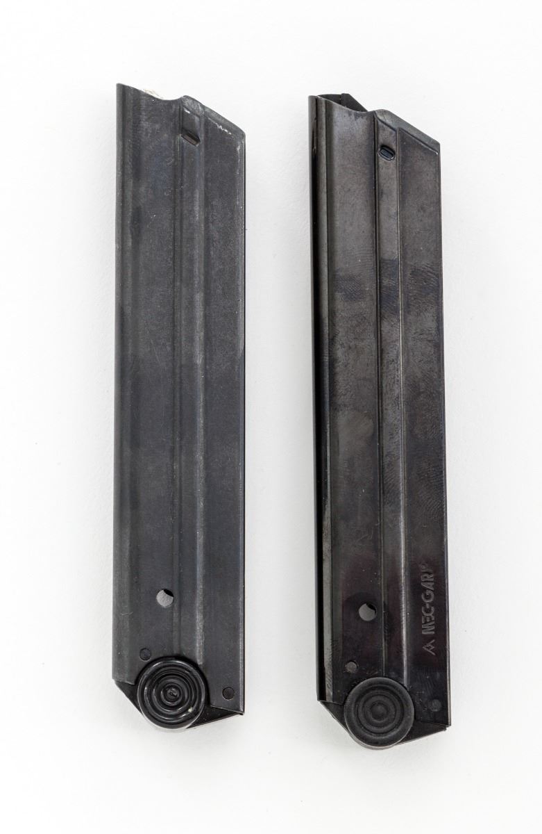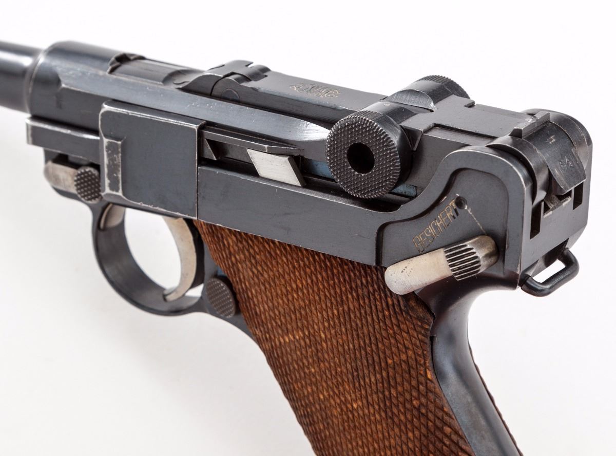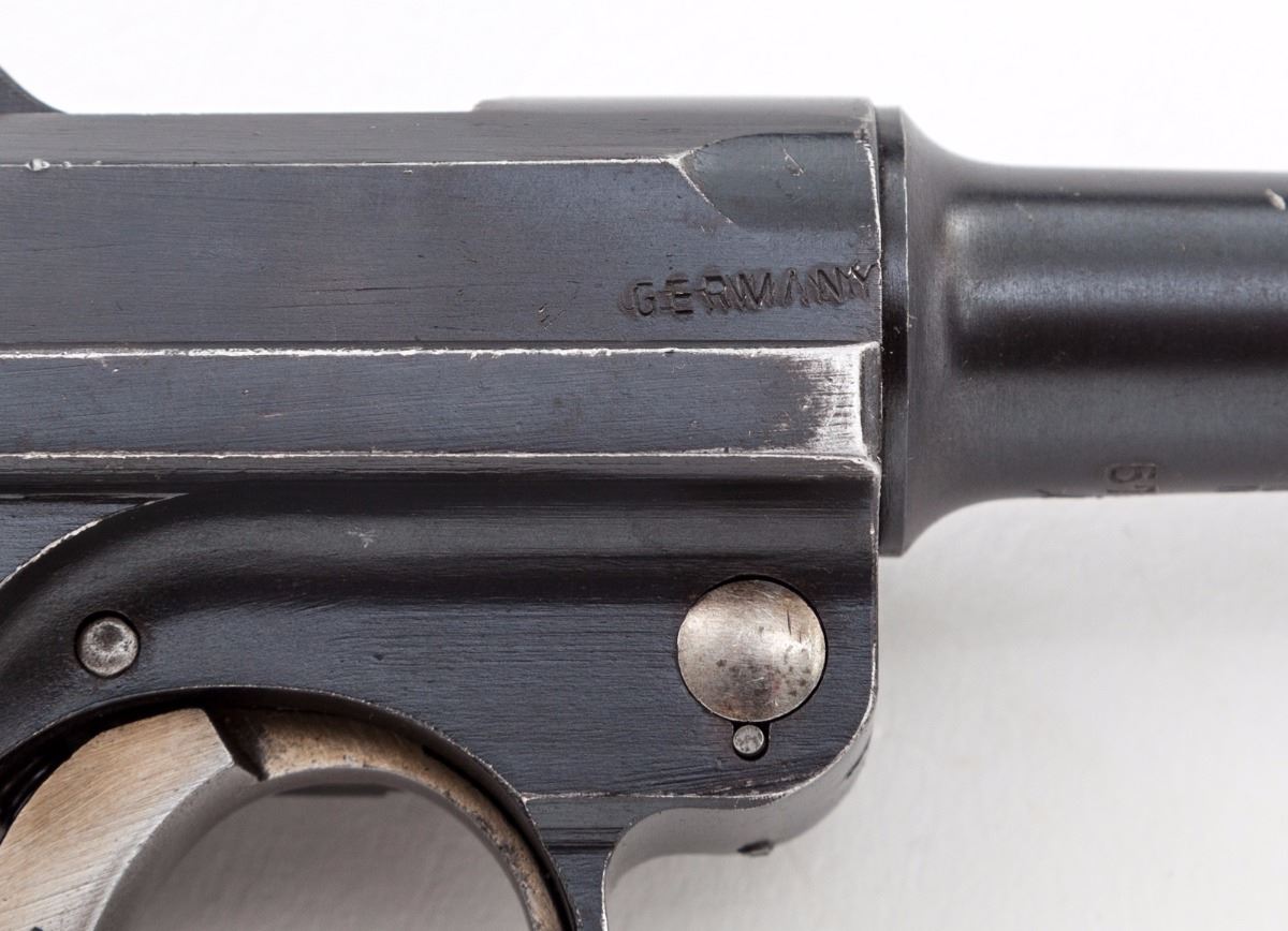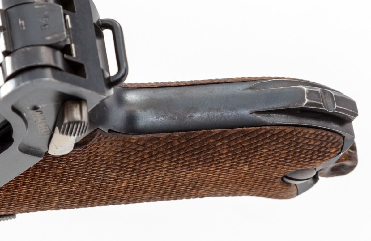 DWM 1920 Commercial Luger, #5754i, 9mm, 4'' barrel, blue finish, checkered walnut grips, with ''(crown)/N'' proofmark on barrel and left side of barrel extension; Germany import stamp on right barrel extension. No chamber markings. Firing pin is not numbered as is common in these post-WWI pistols assembled with both military and commercial parts. Three (3) magazines are included: One nickel bodied with wood base bearing the #5**4 and may be original to the pistol; one blue bodies with black plastic bullseye base; and one Mec-Gar reproduction mag. Condition is excellent, with all matching numbers including grips. Finish retains approx. 95% original blue with most of the loss to the muzzle and high points of the disassembly plate; straw parts retain approx. 85% original color. The numbered grips are excellent with a small amount of flattening to the checkers, and one small chip missing behind the safety. Action is tight, bore is excellent. One of the better 1920's we have seen recently. Est.: $1,500-$2,500. (C&R/PPT)