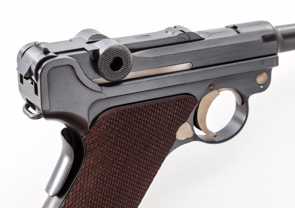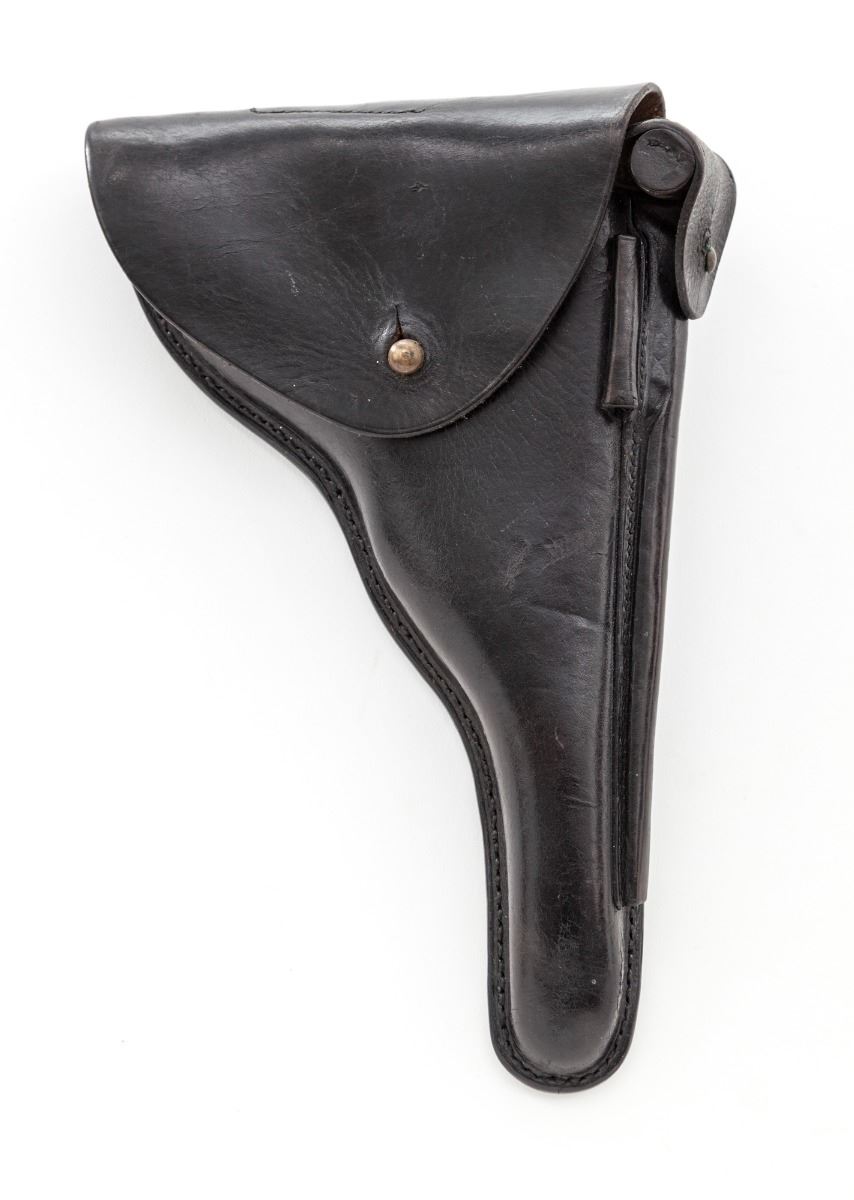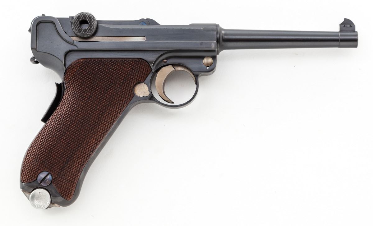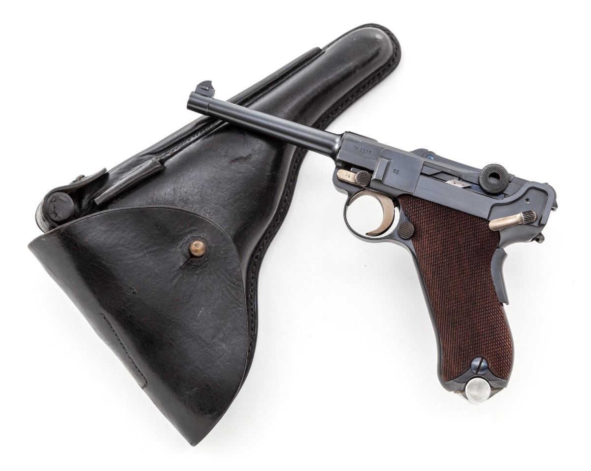 Mauser Banner Model 1906 GNR Portuguese Contract Luger, #1986V, .30 Luger cal., 4-1/2'' barrel, blue finish, straw small parts, checkered walnut grips, with fixed combat type sights, ''(crown)/U'' firing proof, and ''GNR'' on chamber. In Portuguese pattern holster with oil can, cleaning rod, and takedown tool (no pin punch tool). Condition is excellent retaining approx. 99% original rust blue finish; straw parts retain approx. 98% color. All visible matching numbers including grips and magazine. Grips are excellent with a little flattening to the checkering but no cracks or losses. Action is tight, bore is bright. Est.: $3,000-$4,000. (C&R)