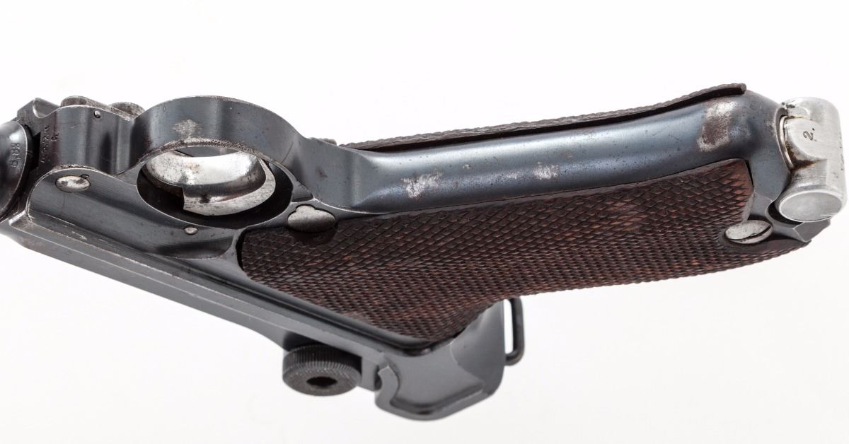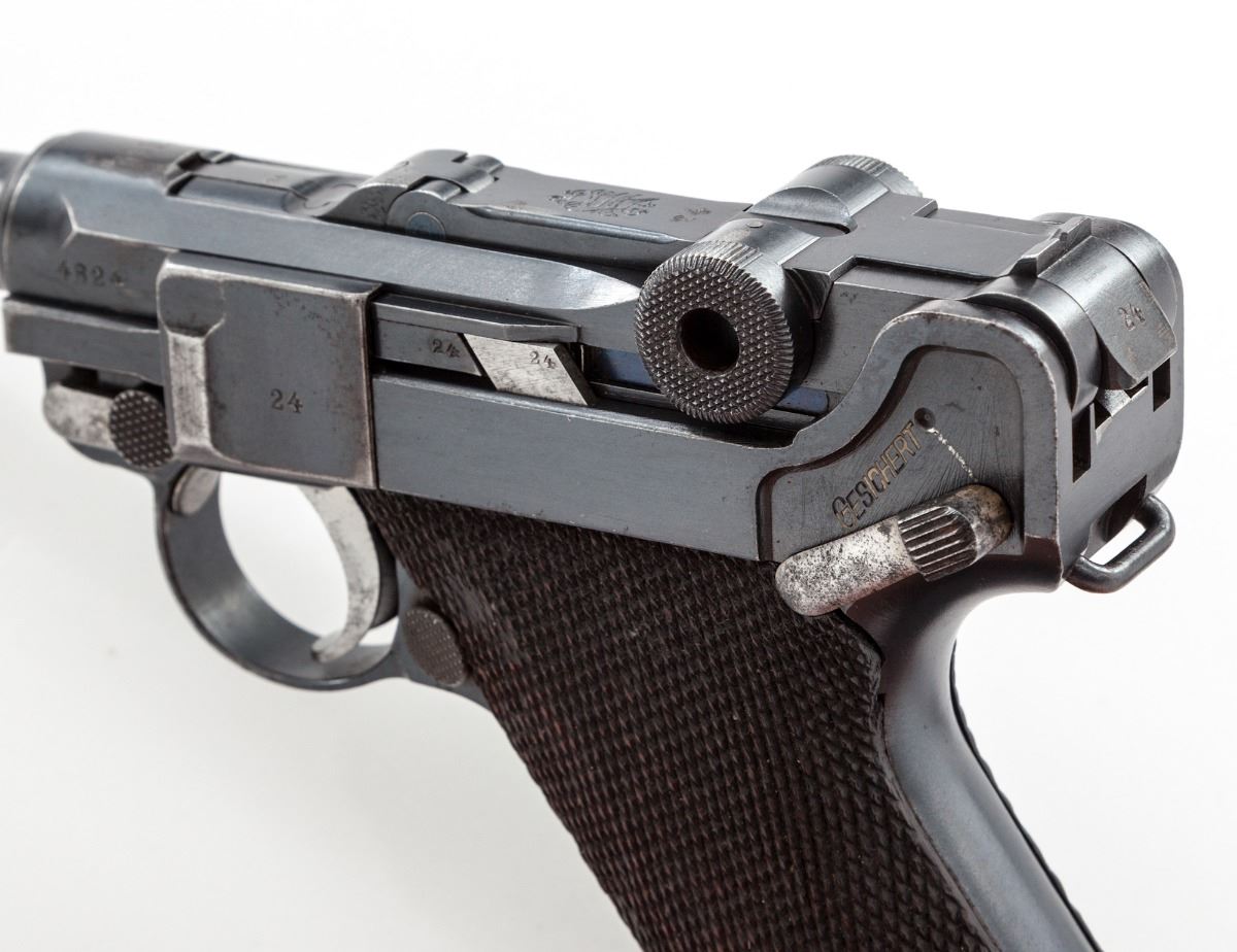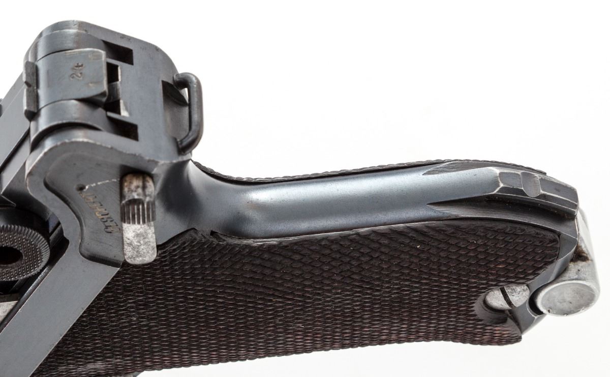 WWI Era DWM Model 1914 Luger, #4824h, 9mm, 4'' barrel, blue finish, straw small parts, checkered walnut grips, with all appropriate acceptance and firing proofmarks on right side barrel extension, which are lightly stamped, but do not appear to be re-done; barrel and breech firing proofs are strong. Chamber date is 1915. All matching numbers including firing pin; grips appear to be the appropriate type but are replacements being marked ''80''. Magazine is a later aluminum base model marked 7679. Condition is very good retaining approx. 85% original rust blue with small areas of minor holster wear, with a few spots of pitting and thinning blue. Straw colored parts have faded to bright with age spots and normal wear. Replacement grips show minor flattening to the checkers. Action functions as designed, bore is excellent. Est.: $1,500-$2,200. (C&R/PPT)