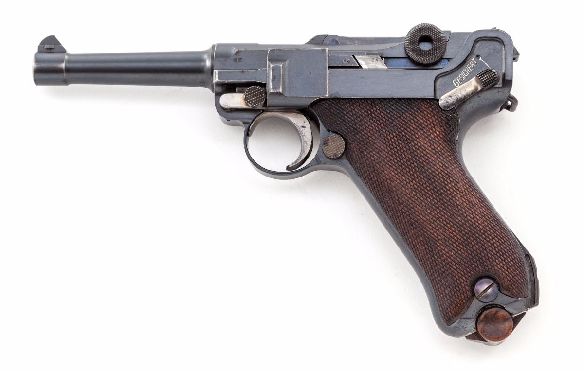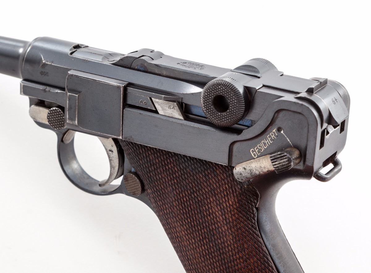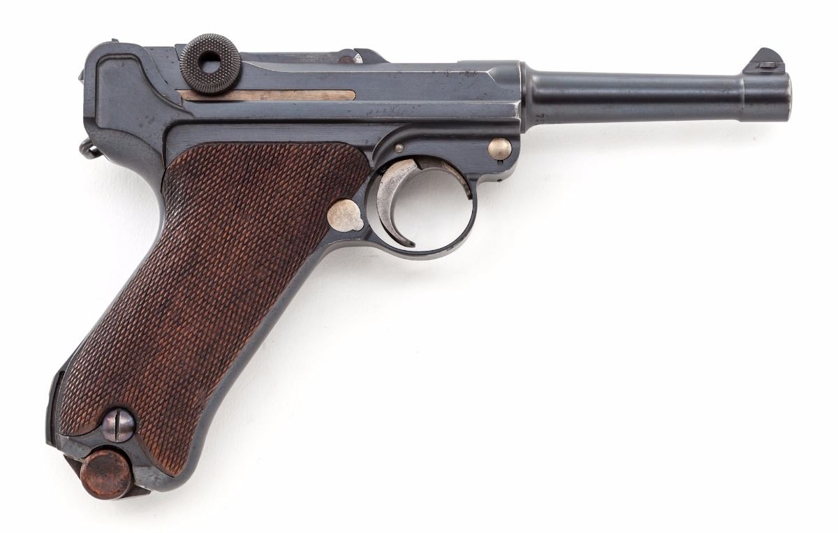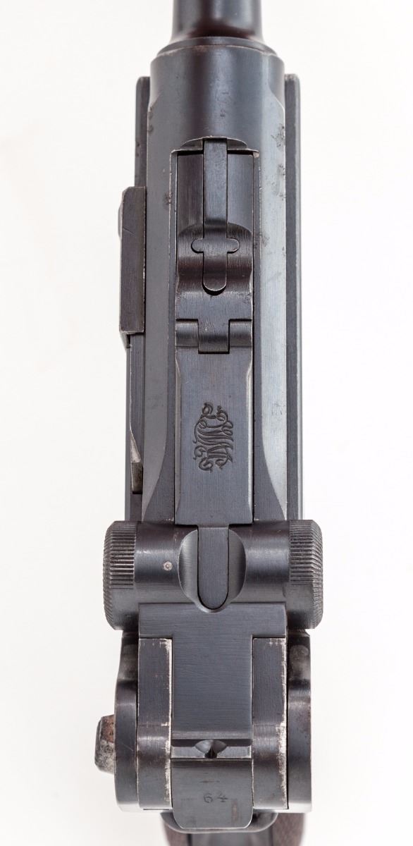 DWM Model 1914 Commercial P.08 Luger, #72964, 9mm, 4'' barrel, blue finish, checkered walnut grips, with ''Lazy (crown)/N'' commercial proofs on barrel and barrel extension. Sights are fixed combat type. Magazine is a tin-plated wooden base with a number in the same series as the pistol. Mfg'd approx. 1916/17. Condition is excellent retaining approx. 95% original factory blue with losses mostly to high edges and muzzle. All matching numbers except the unnumbered firing pin. Grips are excellent with slight flattening to the checkering, one very well repaired chip under the safety lever and are numbered to the pistol. No import marks visible. Action is tight, bore is bright. A very nice war-time commercial Luger. Est.: $2,000-$2,800. (C&R)