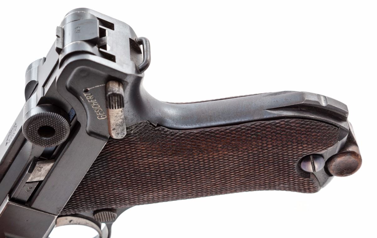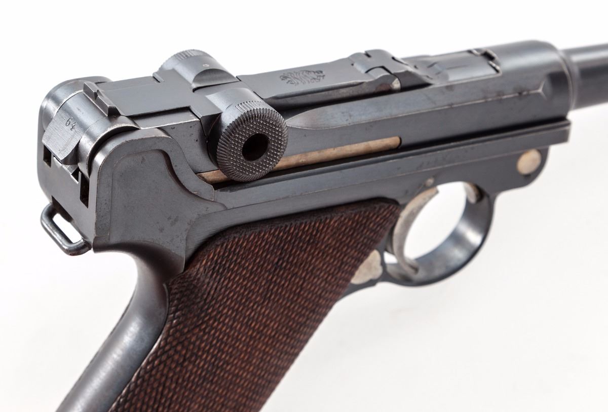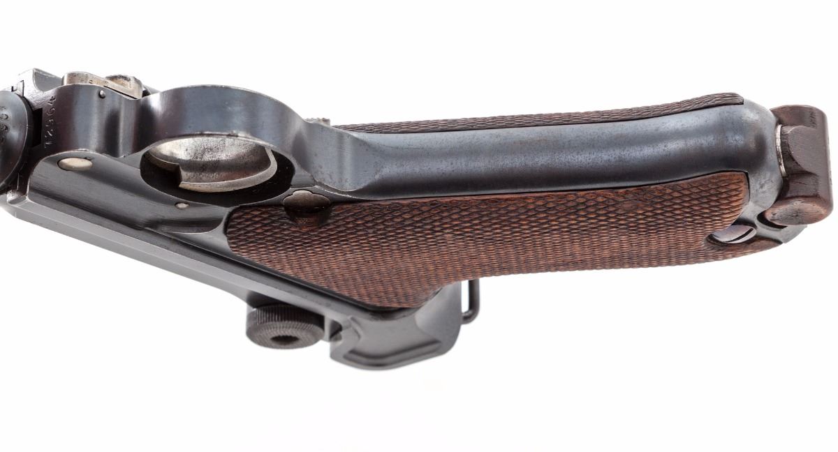 DWM Model 1914 Commercial P.08 Luger, #72964, 9mm, 4'' barrel, blue finish, checkered walnut grips, with ''Lazy (crown)/N'' commercial proofs on barrel and barrel extension. Sights are fixed combat type. Magazine is a tin-plated wooden base with a number in the same series as the pistol. Mfg'd approx. 1916/17. Condition is excellent retaining approx. 95% original factory blue with losses mostly to high edges and muzzle. All matching numbers except the unnumbered firing pin. Grips are excellent with slight flattening to the checkering, one very well repaired chip under the safety lever and are numbered to the pistol. No import marks visible. Action is tight, bore is bright. A very nice war-time commercial Luger. Est.: $2,000-$2,800. (C&R)