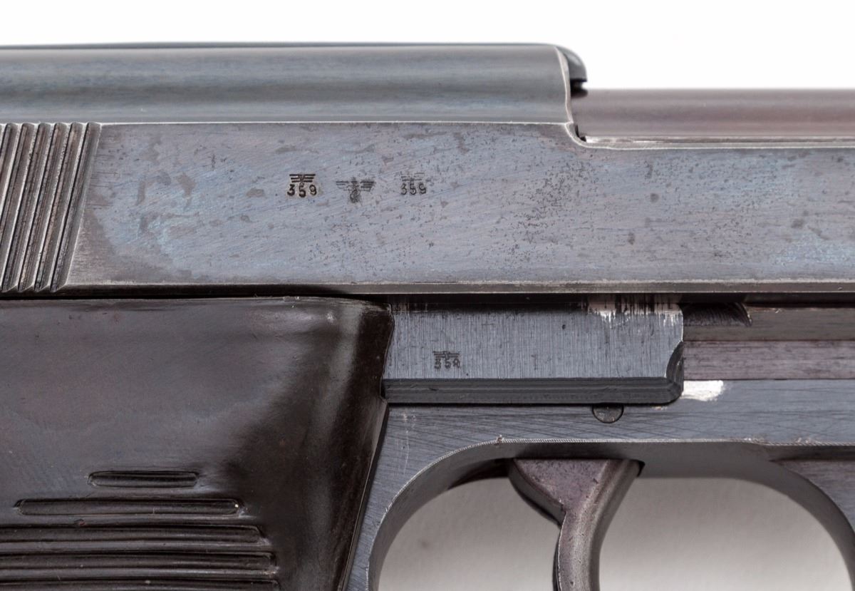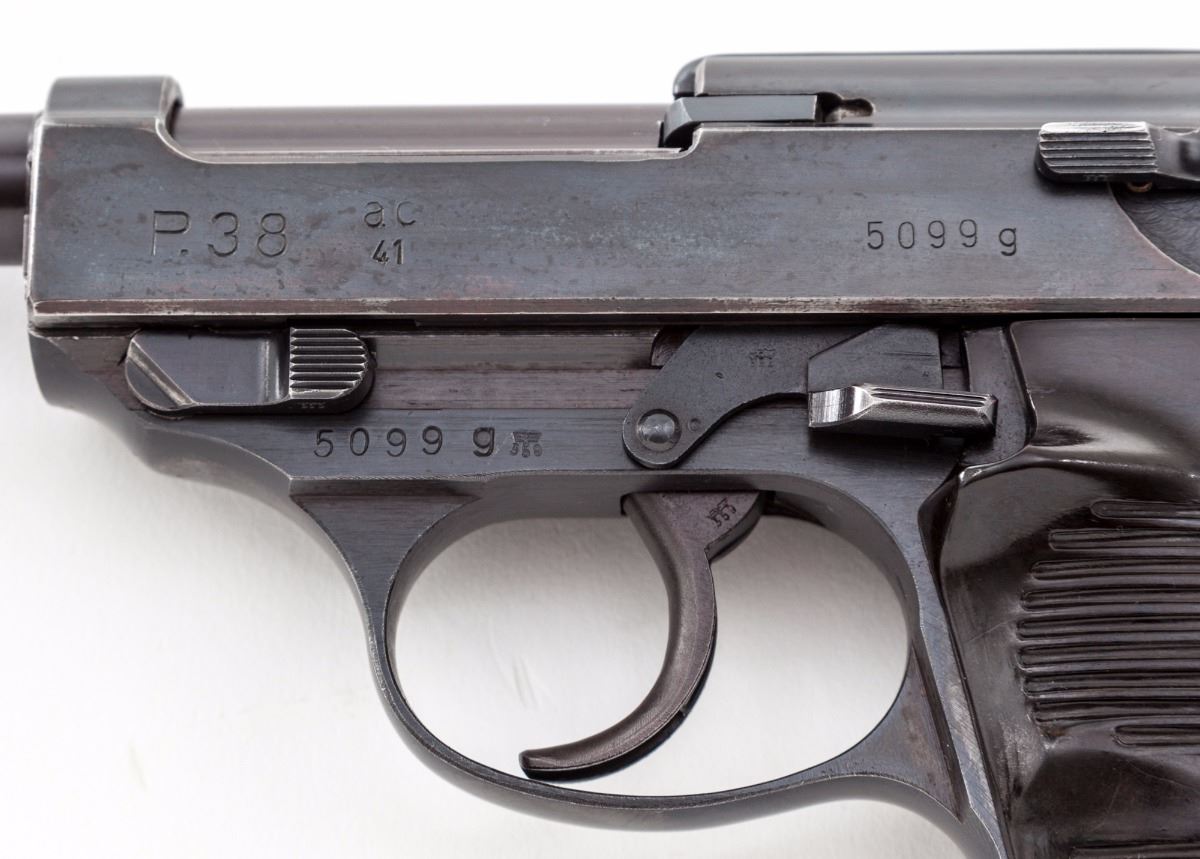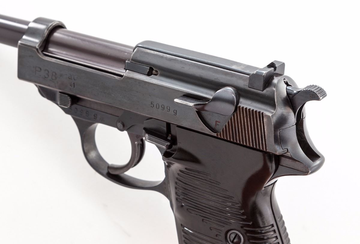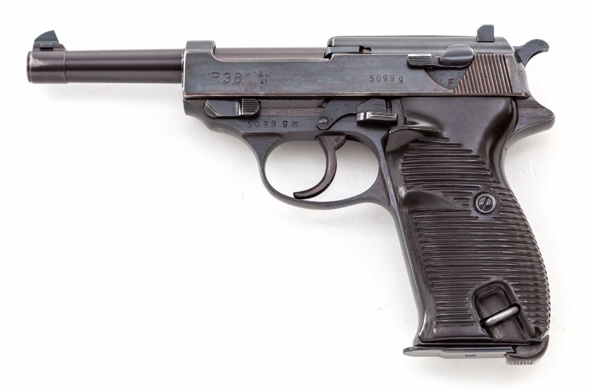 Walther P-38 2nd Variation Semi-Automatic Pistol (ac/41), #5099g, 9mm, 5'' barrel, blue finish, plastic grips, with ''(eagle)/359'' proofs in many places, fixed combat sights, and magazine is marked P38. Condition is excellent retaining approx. 95% original high polish blue. All numbered parts match including locking block. Bakelite grips are not numbered but are ''Wafffenampt/359'' marked. Action is tight, bore is bright. Est.: $1,200-$1,800. (C&R)