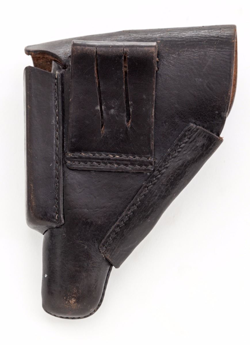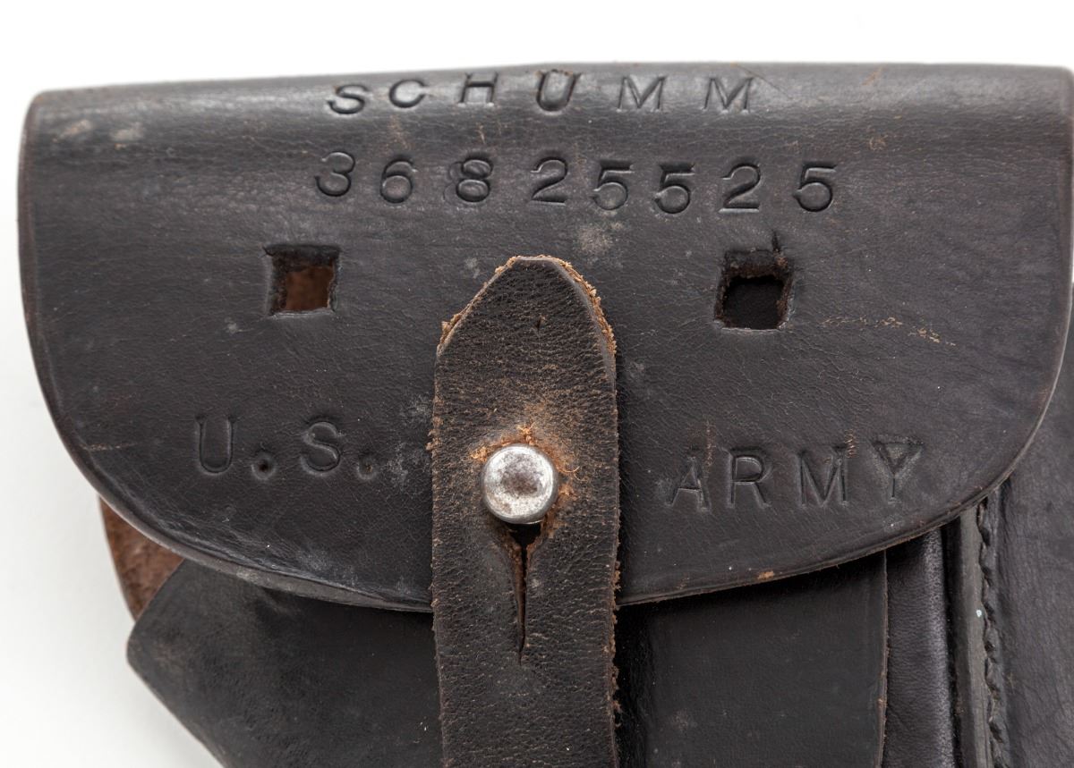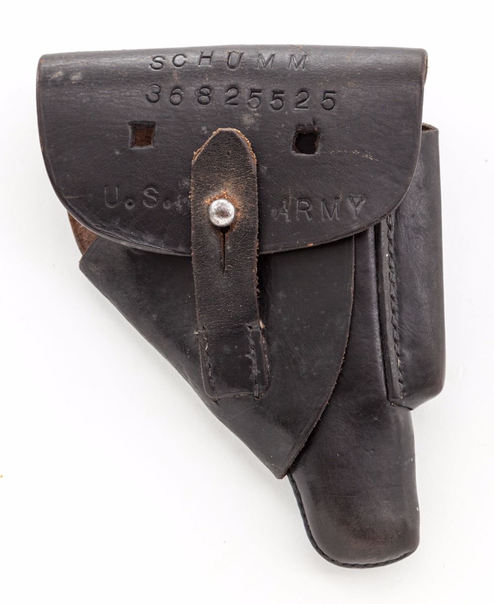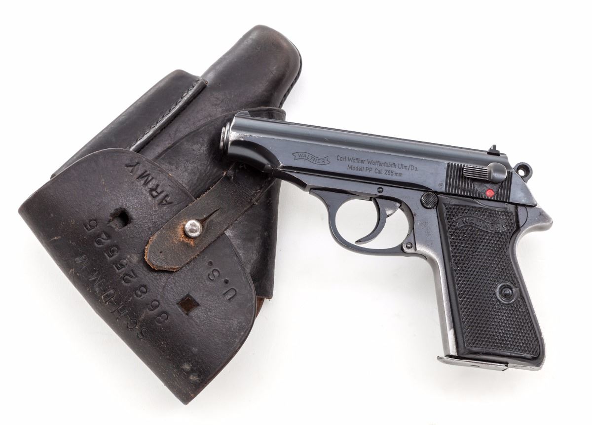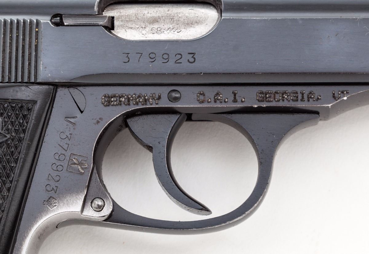 Walther Model PP Semi-Automatic Pistol, #V379923, .32 ACP cal., 3-5/8'' barrel, blue finish, black plastic grips, with post-war ''(crown)/N'' proofmark on barrel and frame. Import marked ''Germany C.A.I. Georgia VT''. In post-war three-piece holster with one extra brown based nickel-plated magazine. Holster is marked with prior owner's name and service number. Condition is very good retaining approx.60% original factory blue, with most of the loss to front and rear grip straps and muzzle; remainder of pistol has minor micro-scratches and small rub marks. Action is tight, bore is excellent. Est.: $500-$700. (Modern) (Not available to Calif. residents.)