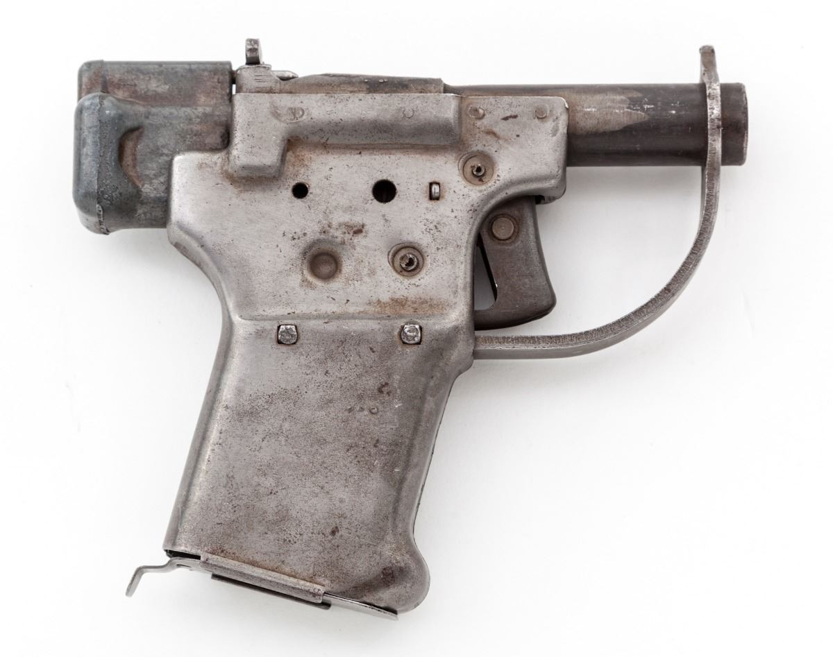 WWII Model FP-45 ''Liberator'' Single Shot Pistol, unserialized, .45 ACP smoothbore, 4'' barrel, die-stamped metal construction. These inexpensive mass-produced weapons were mfg'd for the European and Pacific underground and were dropped from aircraft into occupied territories to arm and assist the resistance. Includes copy of August 2012 ''American Rifleman'' magazine, with article on the history of the Liberator pistol. Condition is good showing wear and handling. Metal shows light to just moderate age patina. Floorplate is present. Est.: $1,200-$1,800. (C&R/PPT)