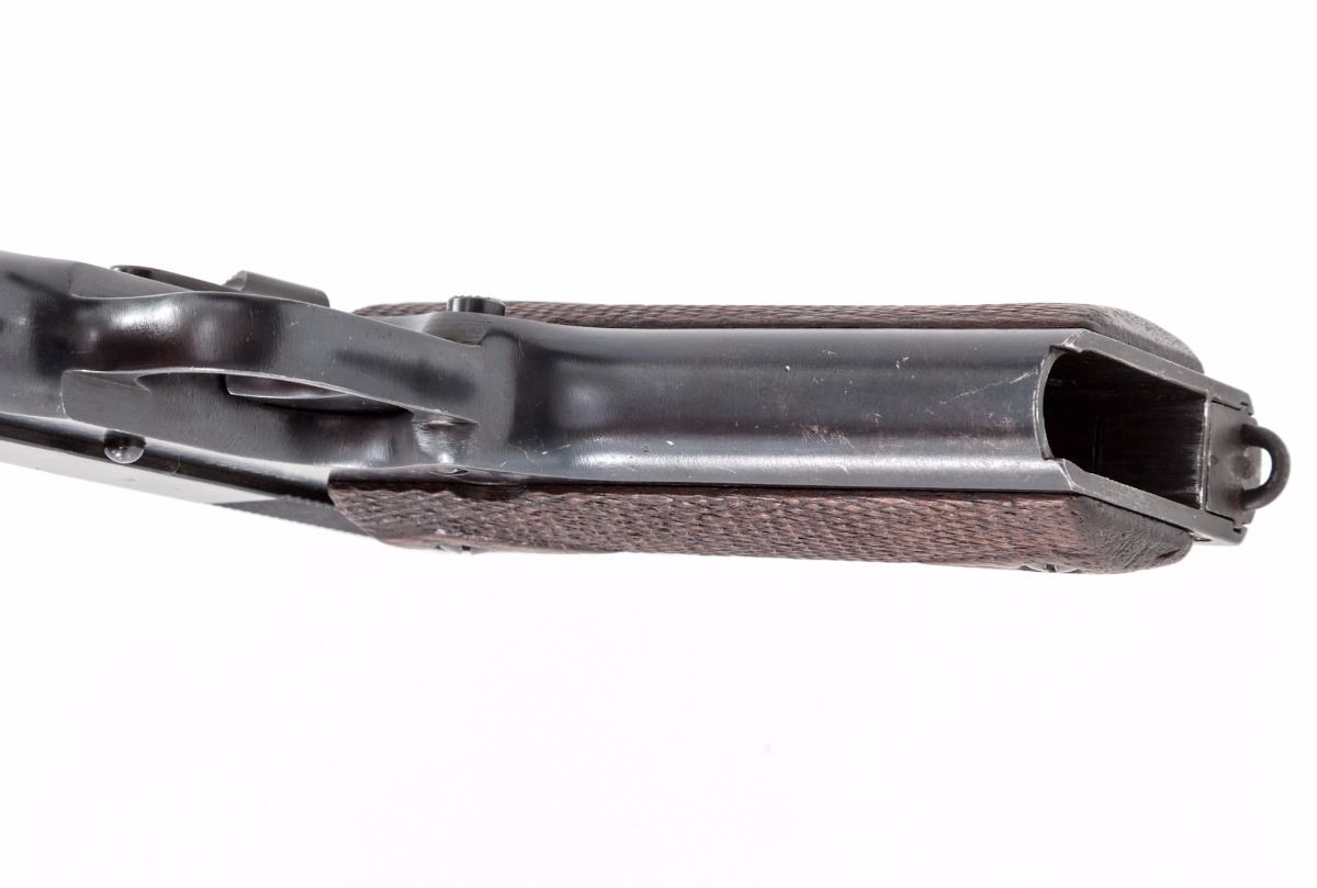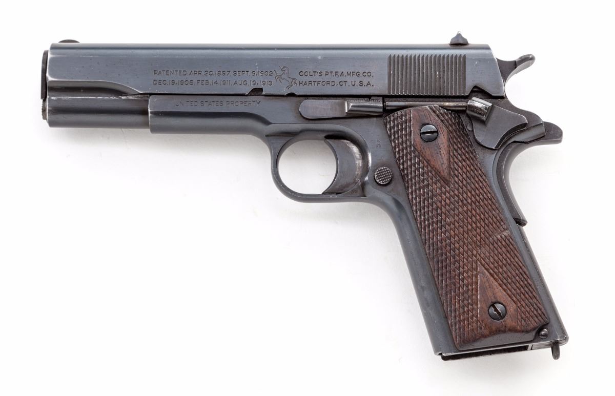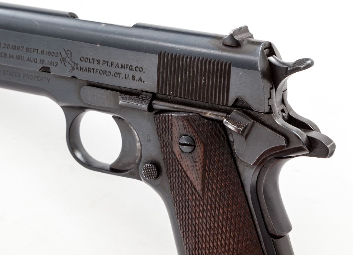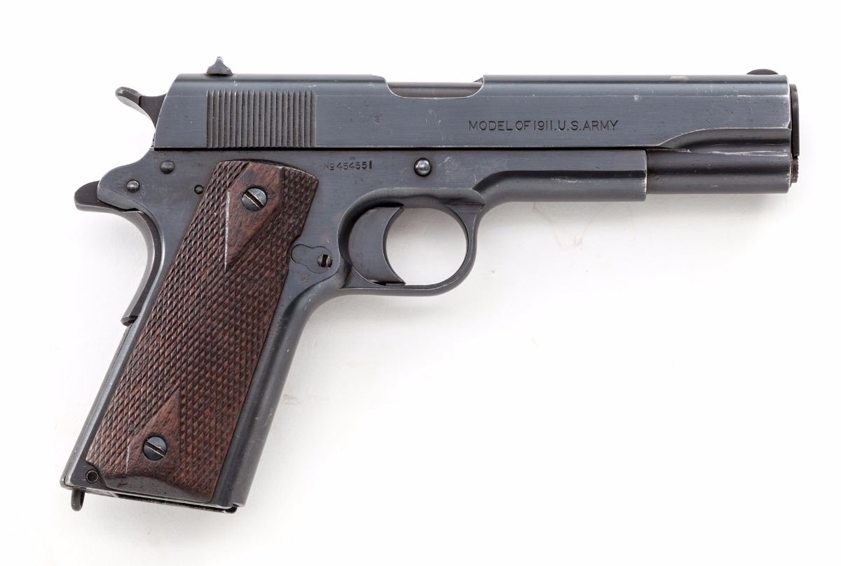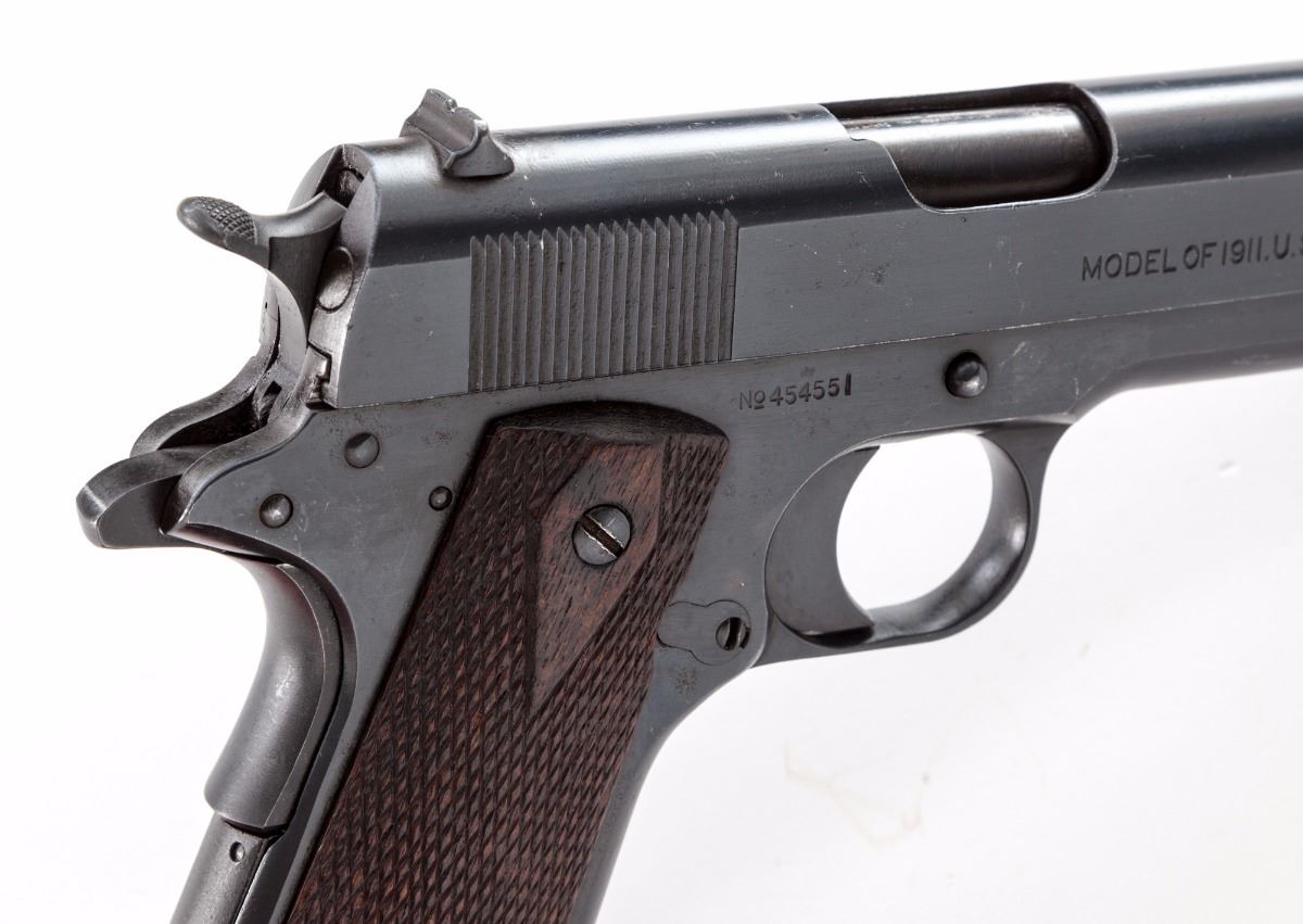Colt Model 1911 Semi-Automatic Pistol, #454551, .45 ACP cal., 5'' barrel, arsenal blue finish, factory checkered large diamond walnut grips, with one correct loopless two-tone magazine. As originally shipped Fall 1918. Condition is fine as arsenal refinished with later style blue, of which approx. 94% is retained. Grips with moderate flattening. Good action, fine bore. Est.: $800-$1,200. (C&R)