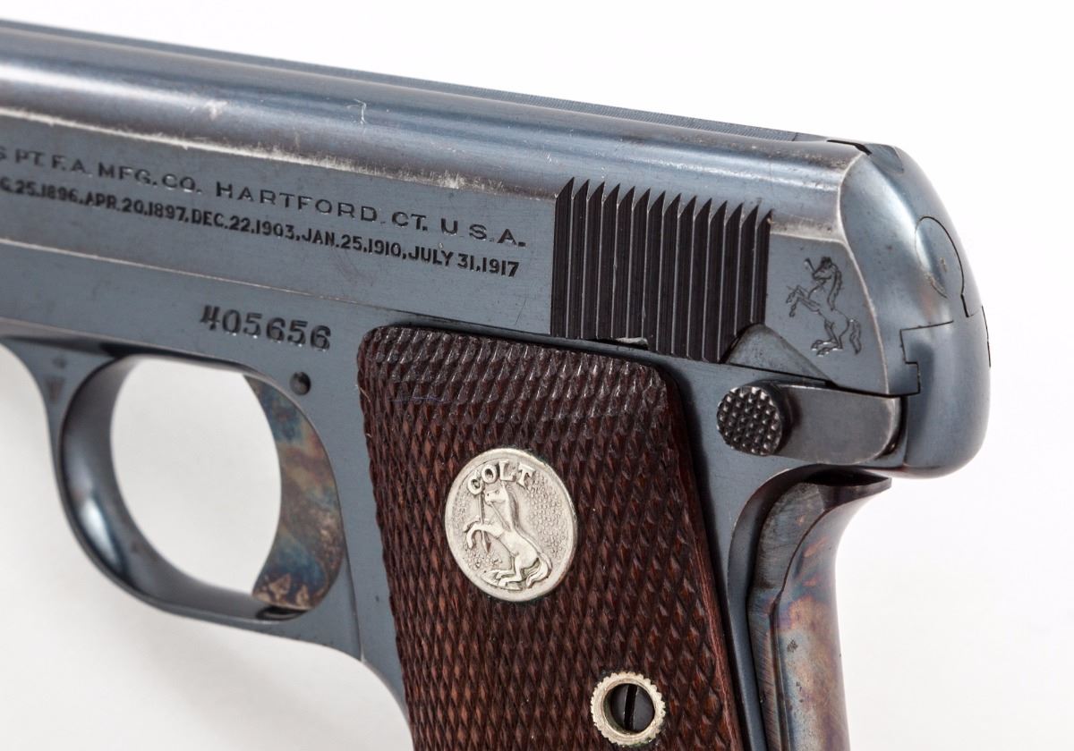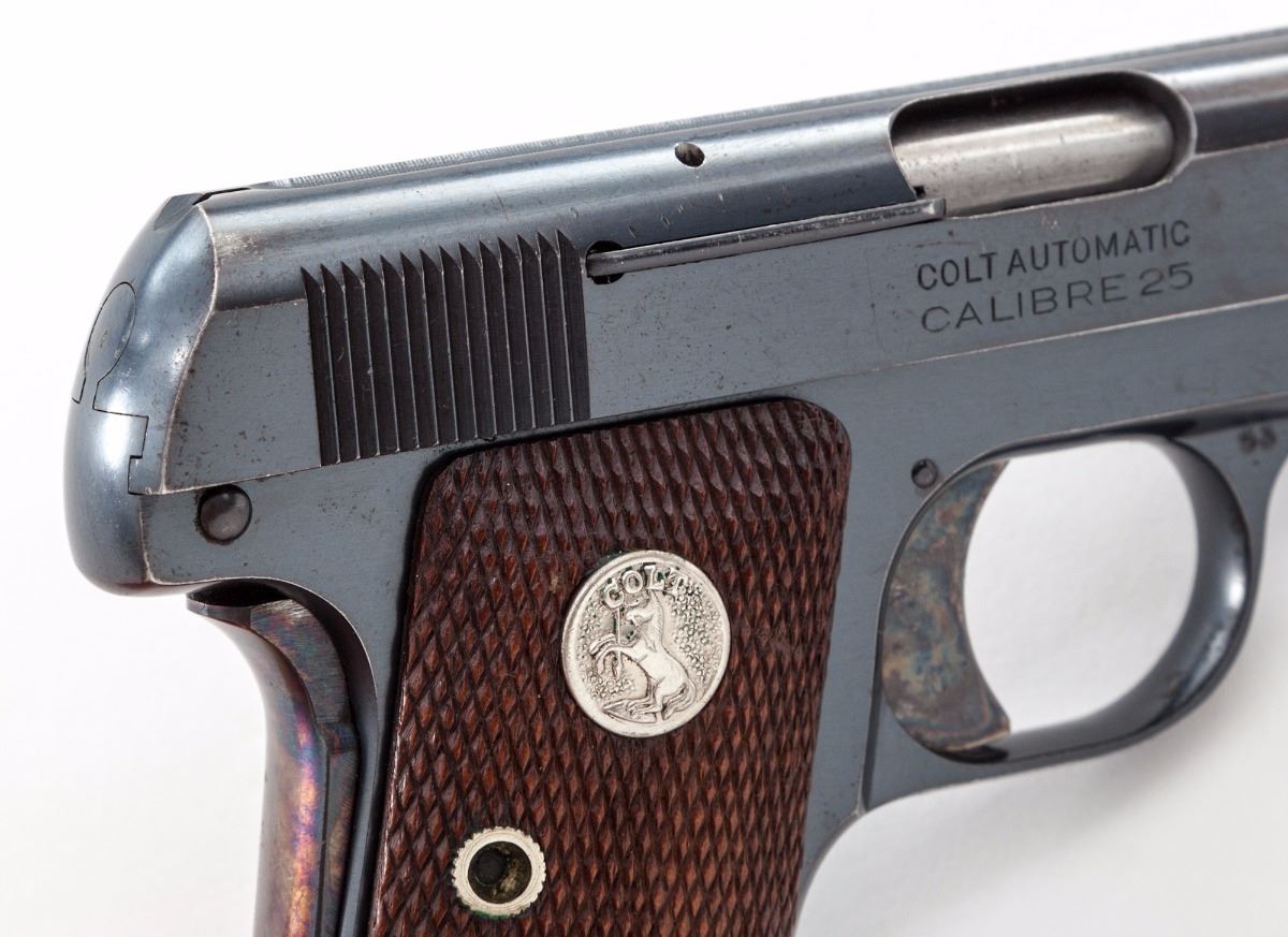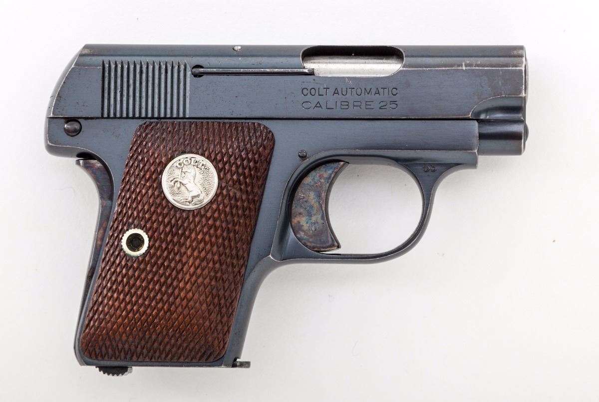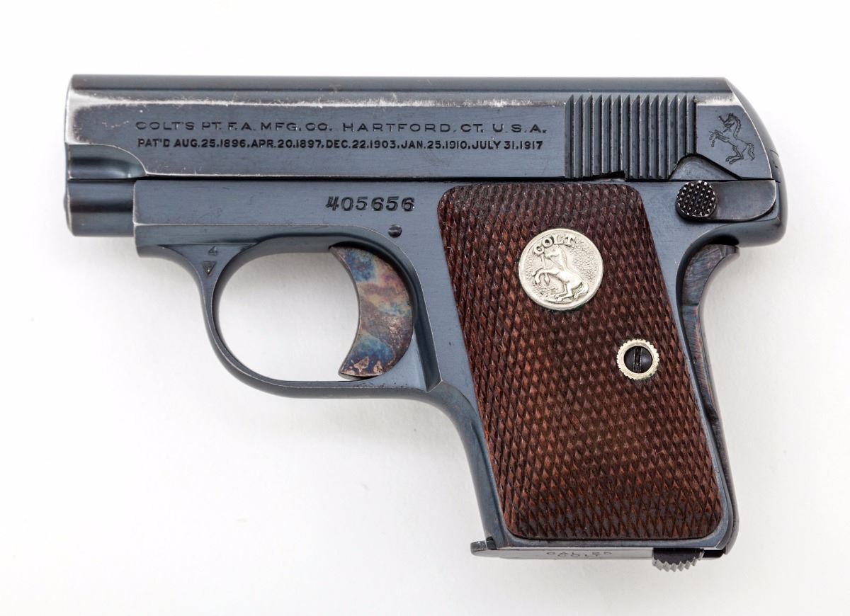 Colt Model 1908 Vest Pocket Semi-Automatic Pistol, #405656, .25 ACP cal., 2'' barrel, blue and casehardened finish, factory checkered walnut grips with flush medallions, and one blue factory magazine marked ''CAL .25/COLT''. Mfg'd 1937. Condition is near excellent retaining approx. 92% factory finish with thinning at high edges and muzzle. Front strap and grip safety are excellent. Grips with light even wear, good action, fine magazine and bore. Est.: $450-$600. (C&R/PPT)