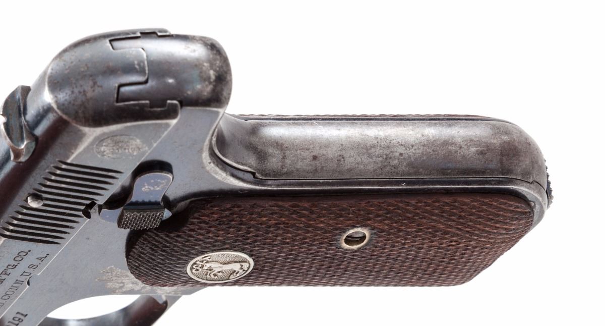 Early Colt Model 1903 Pocket Hammerless Semi-Automatic Pistol, #22191, .32 ACP cal., 4'' barrel, high polish blue with fire blued small parts, later Colt factory checkered walnut grips with flush medallions. Original early magazine is retained. This early pistol features plunged mill serrations, barrel bushing, circled Rampant Colt logo, and safety retaining screw. Mfg'd 1909. Condition is very good to near fine retaining approx. 85% original factory blue. Front strap has thinned to approx. 75%; grip safety shows approx. 30%. Area just behind trigger on left side shows 1'' area of finish loss. Grips are about fine with light flattening. Action and bore are good. Est.: $500-$750. (C&R/PPT)