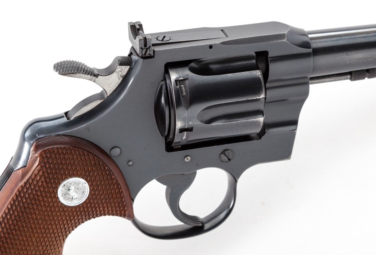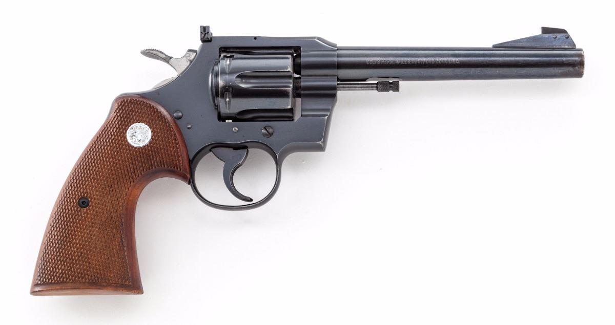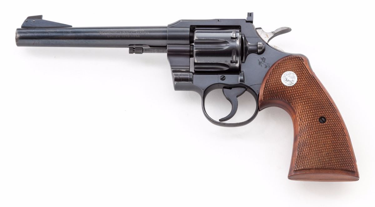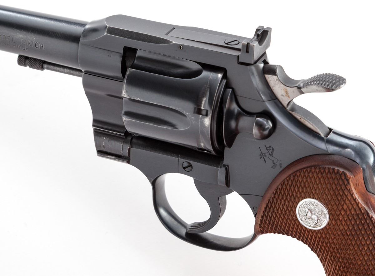 Colt Officer's Model Match Double Action Revolver, #75592, .22 LR cal., 6'' barrel, blue finish, factory checkered walnut grips with inlaid silver Colt medallions, serrated trigger, wide spur checkered hammer, Patridge front sight, adjustable rear sight, with serrated back grip strap. Mfg'd 1958. Condition is very good retaining approx. 93%-95% blue with scattered light scratches. Cylinder shows a light dragline and small scratch, with minor surface rust near muzzle that should clean. Grips are excellent with crisp checkering. Action is crisp, bore is fine. Est.: $700-$900. (C&R/PPT)