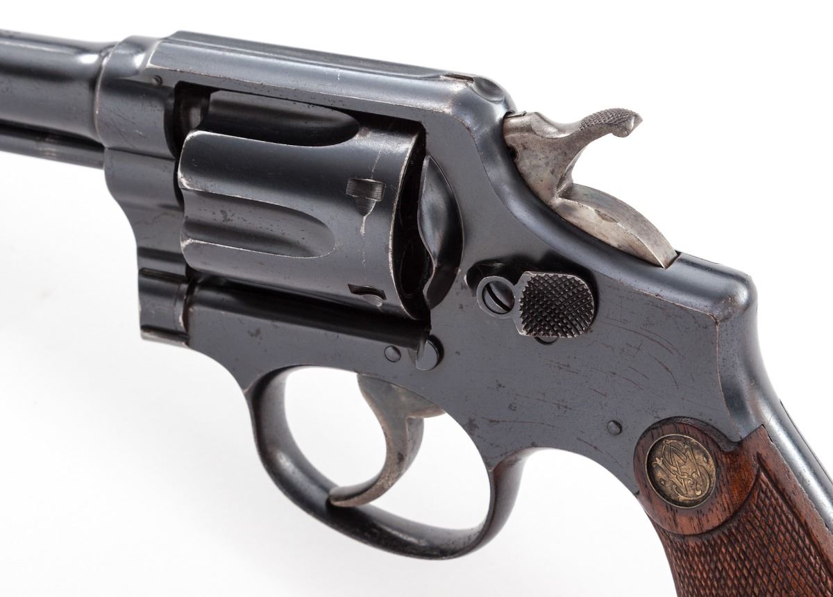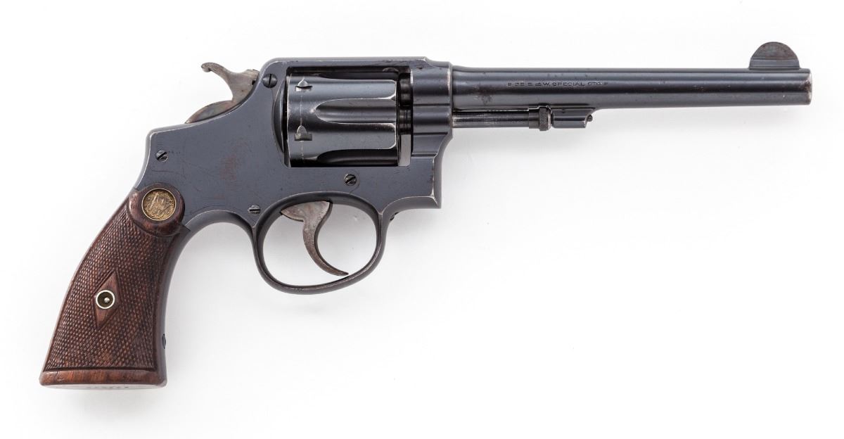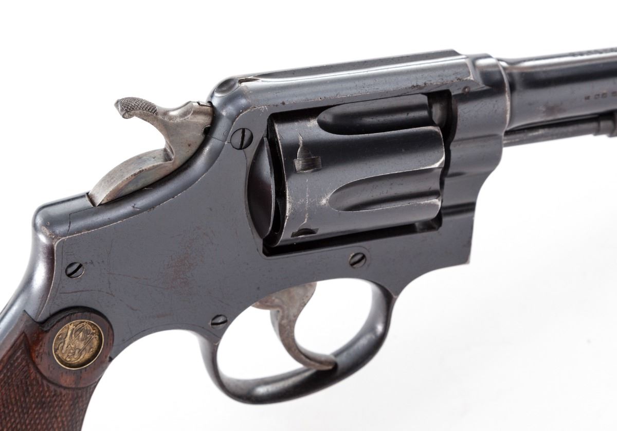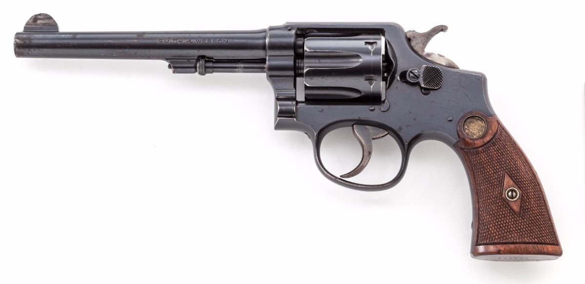 Smith & Wesson M&P (Model of 1905) 3rd Change Double Action Revolver, #292238, .38 Spec. cal., 6'' barrel, blue finish, factory checkered walnut service style grips with inlaid Colt medallions, with fixed service style sights. Mfg'd 1914-1915. Condition is very good retaining approx. 90% original blue with overall freckling and areas of pitting on barrel. ''Humpback'' hammer and trigger retain approx. 80% case colors. All numbers match, including grips, which are lightly pencil marked on right grip panel. Grips are in excellent condition with minor flattening. The frame is unusual as it bears no logo markings of any kind, as ''The Standard Catalog of Smith & Wessons'' notes being a characteristic of some 4th change target frames. Grips are in excellent condition with minor flattening. Timing and lock-up are excellent, as well as bore. Est.: $500-$750. (C&R/PPT)