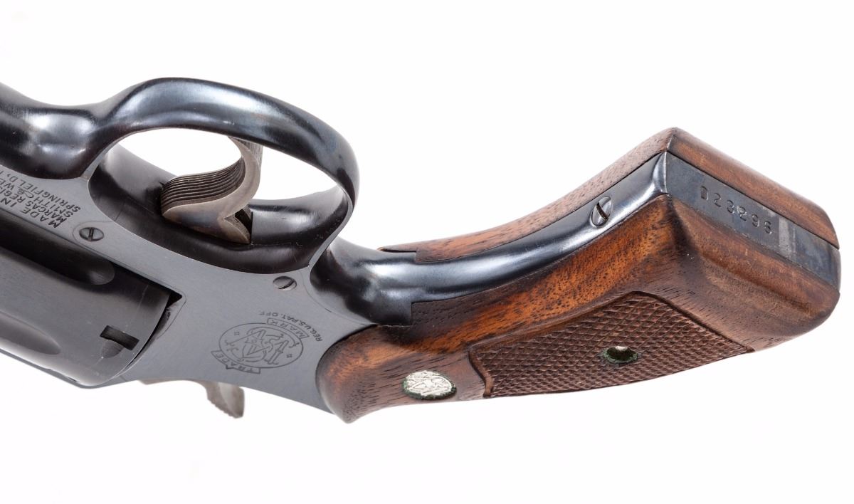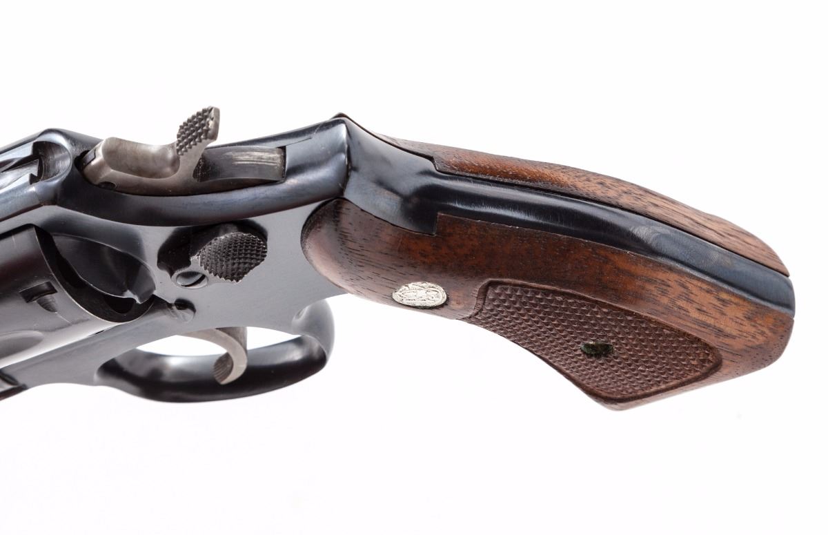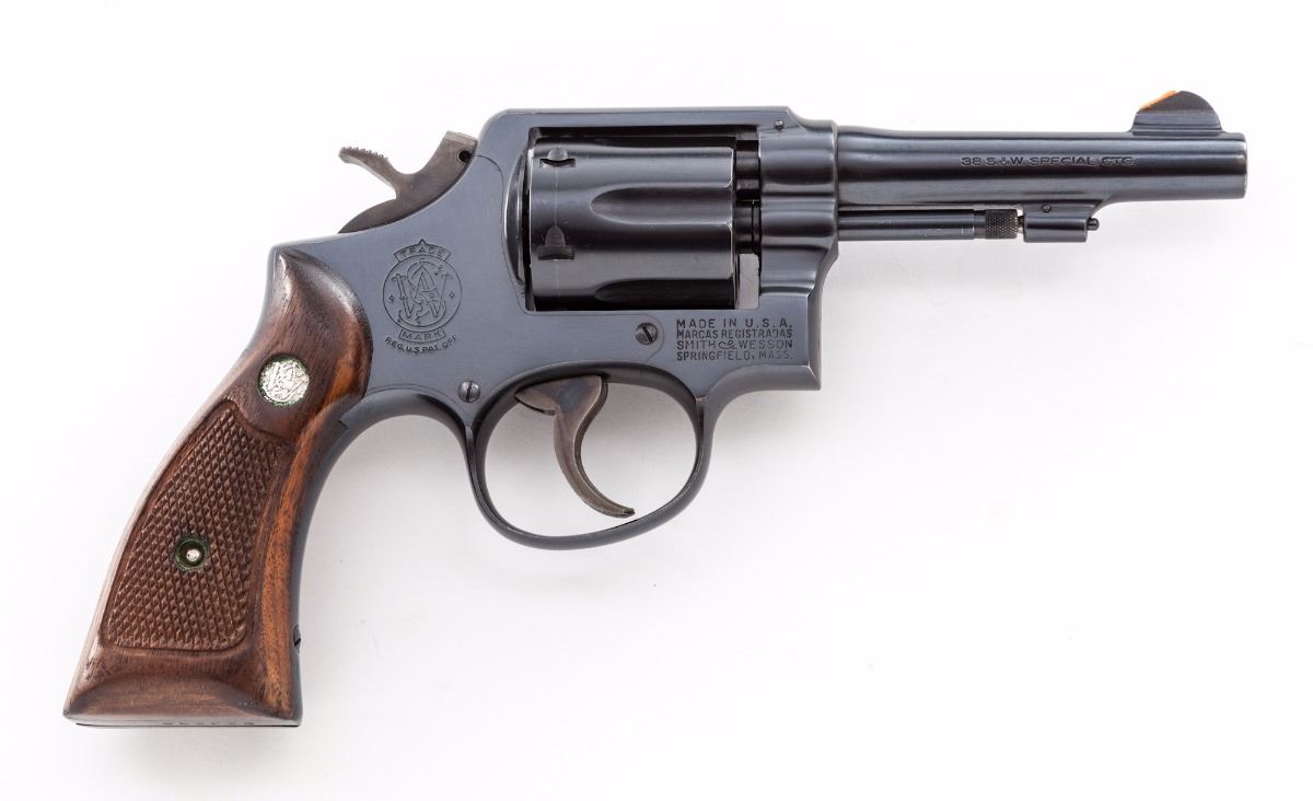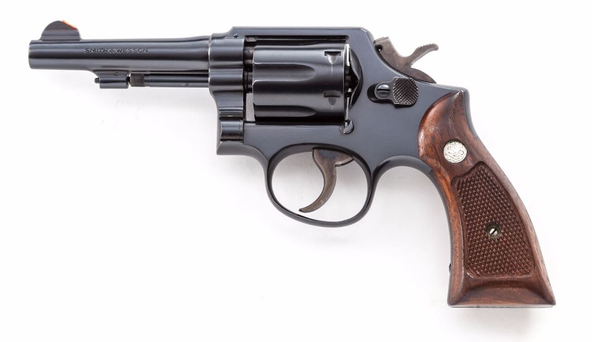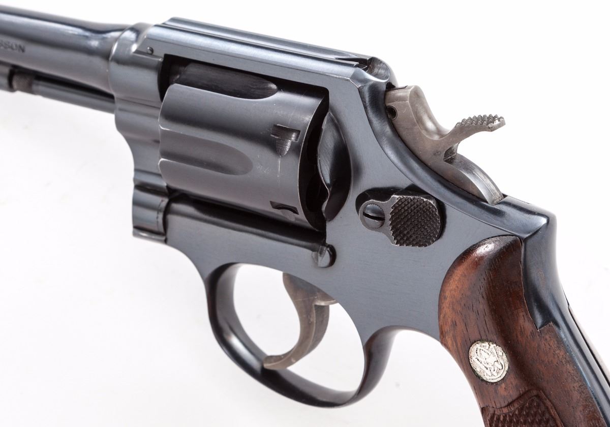Smith & Wesson Model 10-5 Double Action Revolver, #D23296, .38 Spec. cal., 4'' barrel, blue finish, original factory walnut grips and Hogue mono-grips, in later S&W plastic hard case. Condition is excellent with added red paint to front sight blade. Blue surfaces retain approx. 96% factory finish. Grips and action are excellent, bore is bright. Est.: $400-$600. (Modern/PPT)