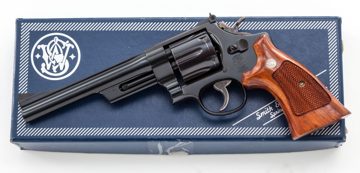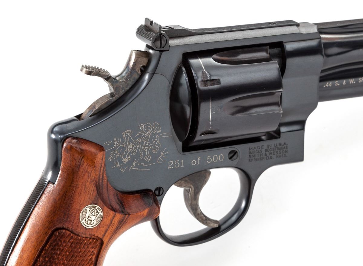 Limited Edition Smith & Wesson Model 24-4 ''Through the Line'' Double Action Revolver, #BFJ5164, .44 Spec. cal., 6-1/2'' barrel, blue finish, case hardened serrated trigger, checkered case hardened semi-target hammer, factory checkered wood grips with inlaid S&W medallions, with blade front sight and notched adjustable rear sight. Right side of barrel is etched ''Through the Line'', with laser etched facsimile of the 1902 Dan Smith watercolor that was used in poster form to advertise S&Ws. Sideplate is additionally marked ''251 of 500''. In original two-piece metal-cornered S&W box with matching end label, owner's manual, misc. paperwork, speedloader, sight adjustment tool, cleaning accessories and S&W packing paper. Mfg'd in 1990 and offered as a subscription purchase with a gun for each month, this being the July edition firearm. Condition is near excellent retaining approx. 98% blue, with a few light marks from handling, as well as a moderate dragline. Grips are near new with sharp checkering. Trigger and hammer with approx. 95% case colors remaining. Action and bore are excellent. Two-piece box with clear tape at mid-point long edge of lid and bottom of lower piece. Est.: $600-$800. (Modern/PPT)