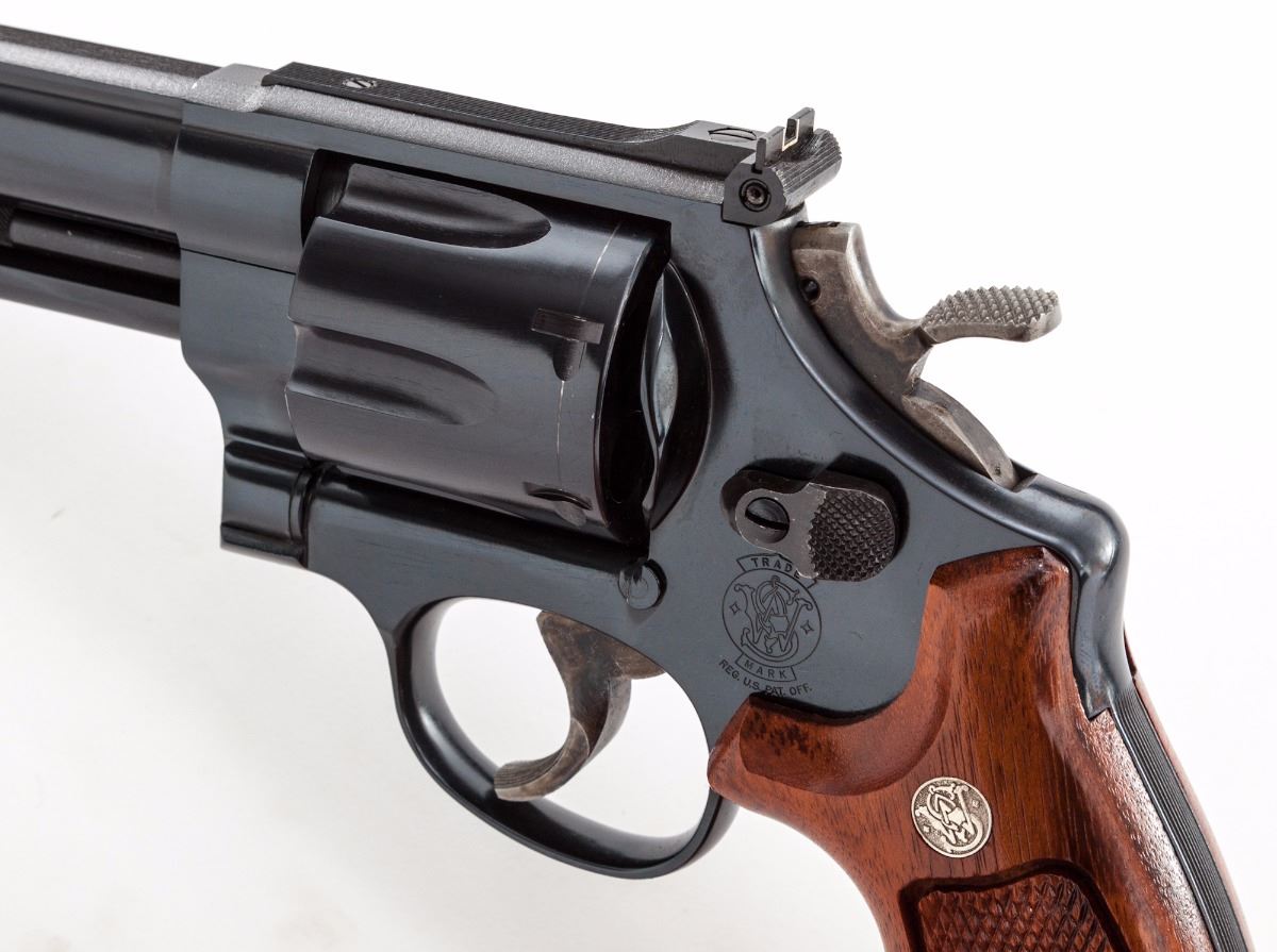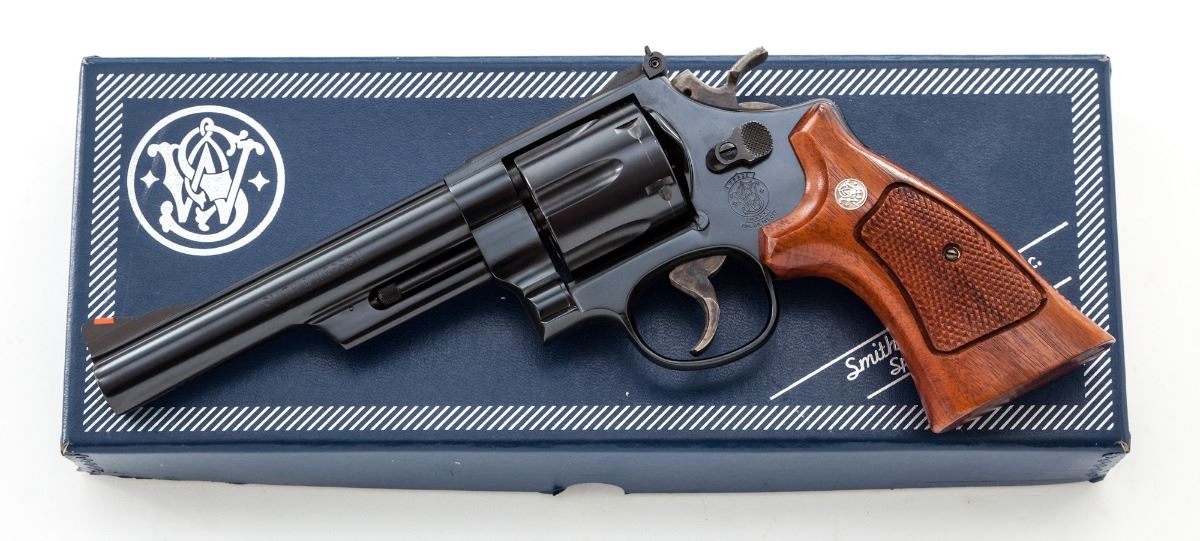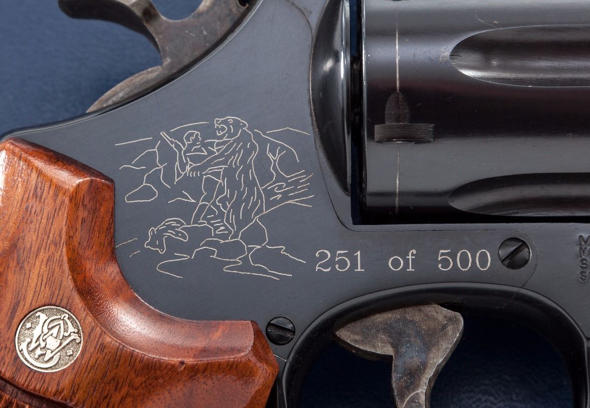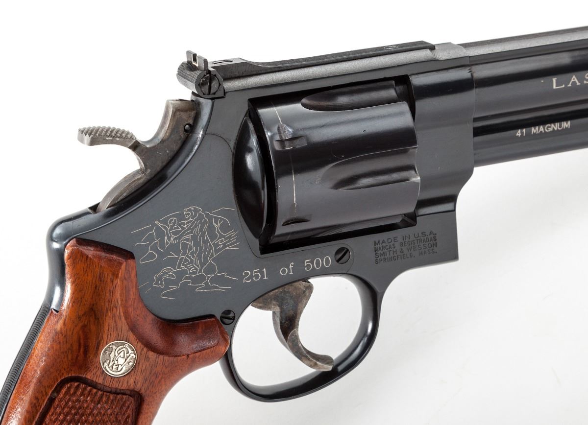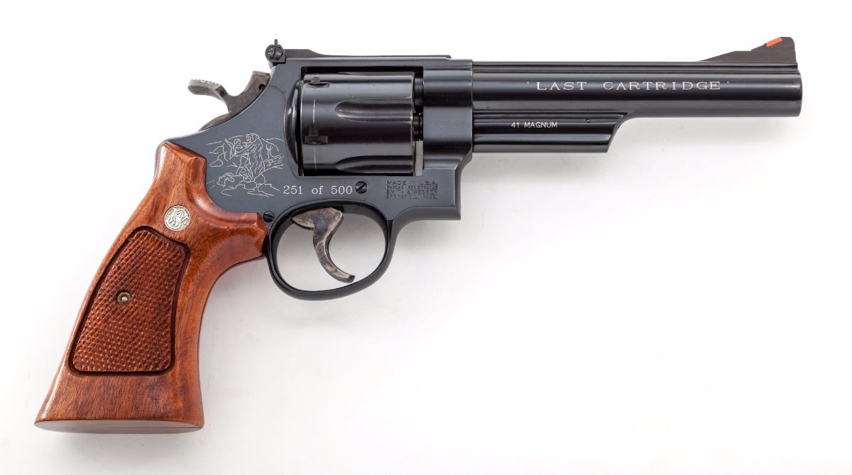 Limited Edition Smith & Wesson Model 57-3 ''Last Cartridge'' Double Action Revolver, #BFA9799, .41 mag. cal., 6'' barrel, blue finish, serrated case hardened trigger, checkered case hardened target hammer, factory checkered walnut grips with inlaid S&W medallions, red ramp front sight and adjustable outline rear sight. Right side of barrel is etched ''Last Cartridge'', with laser etched facsimile of the 1902 Dan Smith watercolor that was used in poster form to advertise S&Ws. Sideplate is additionally marked ''251 of 500''. Mfg'd in 1990 as a special limited edition by S&W and Ellett Bros., and offered as a subscription purchase with a gun for each month, this being the May edition firearm. In original two-piece metal-cornered S&W box with matching end label, owner's manual speedloader, cleaning accessories, sight adjustment tool and S&W packing paper. Condition is excellent retaining approx. 98%-99% blue, with scattered light marks from handling, moderate dragline, and small amounts of dried preservative, mainly in protected areas. Grips with a few faint impressions, the most noticeable being to the bottom edge of right grip panel; checkering remains crisp. Trigger and hammer with approx. 90%-95% case colors remaining. Action is crisp, bore is excellent. Est.: $600-$800. (Modern/PPT)