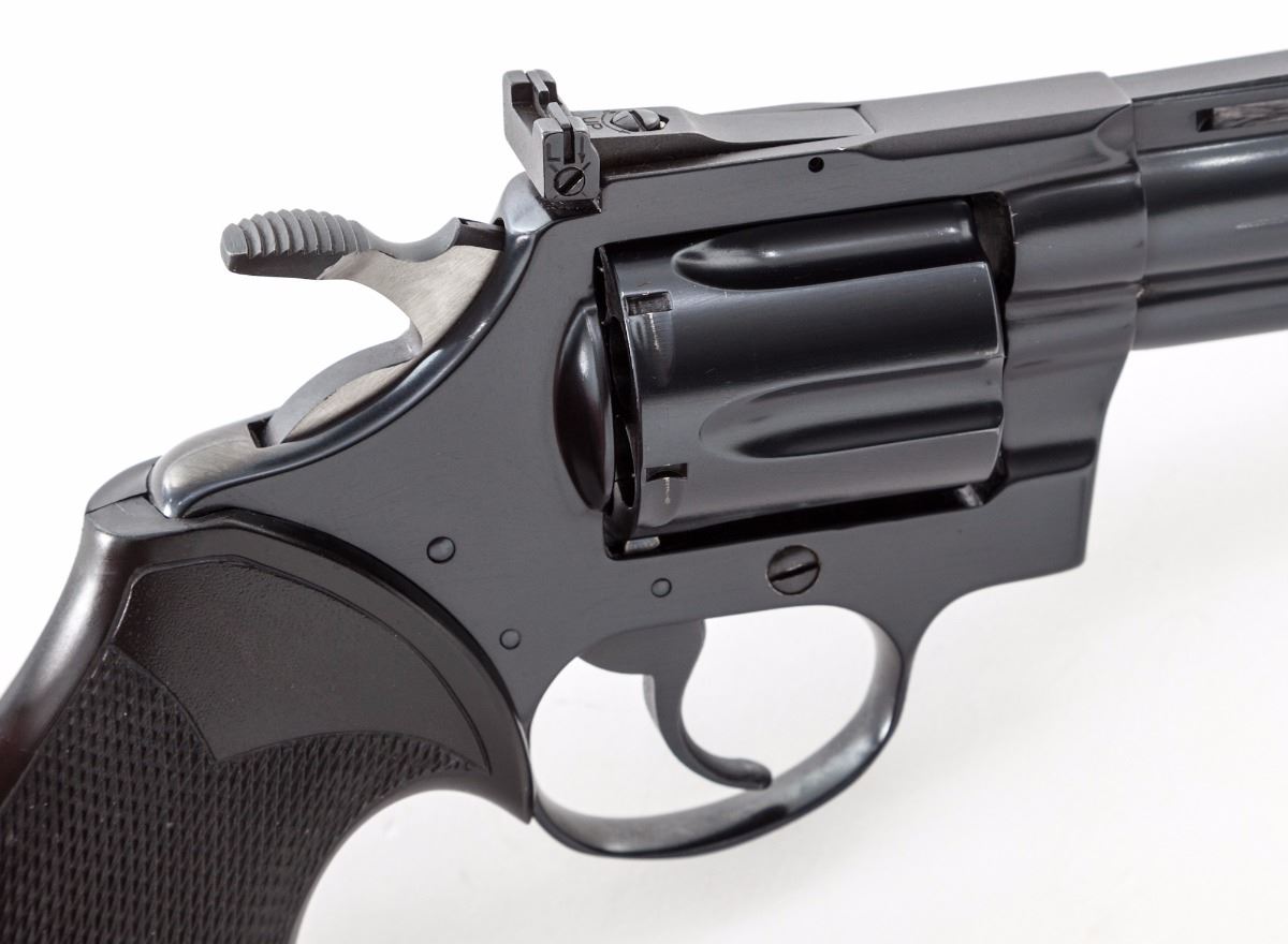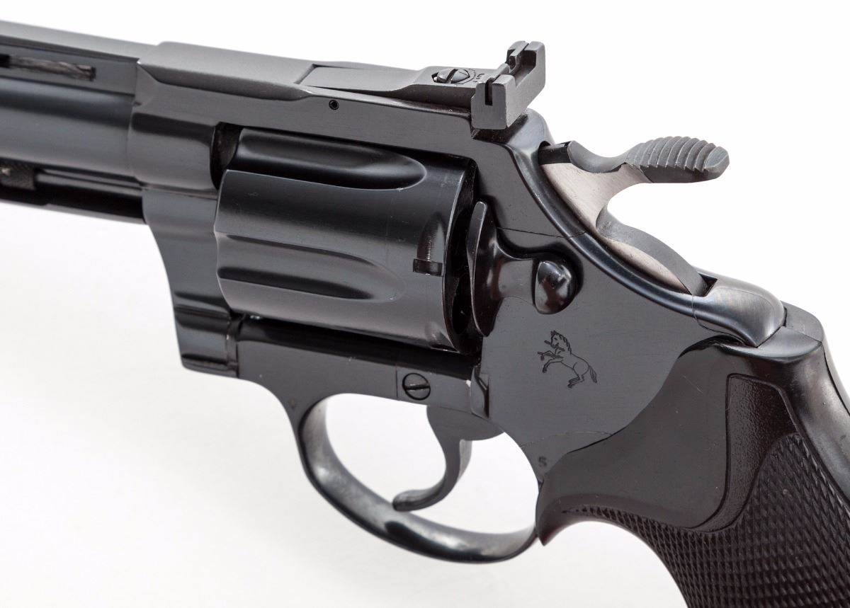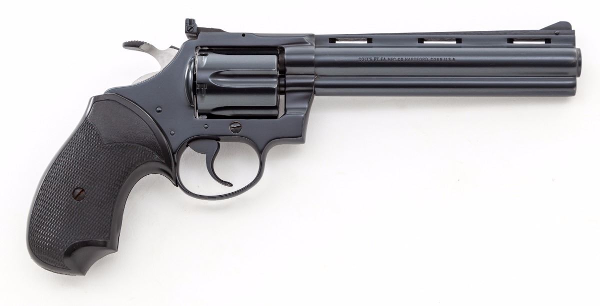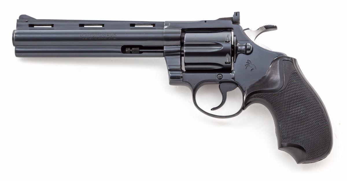 Colt Diamondback Double Action Revolver, #P37408, .38 Spec. cal., 6'' vent rib barrel, blue finish, serrated hammer, factory checkered black rubber Pachmayr Presentation grips, with fixed front sight and notched adjustable rear sight. Mfg'd 1982. Condition is excellent retaining approx. 98% blue with scattered general fine micro-scratching and marks from handling. Cylinder with a light dragline, as well as a faint line approx. 3/8'' from back of cylinder. Grips remain crisp. Action and bore are excellent. Est.: $1,000-$1,500. (Modern) (Not available to Calif. residents.)