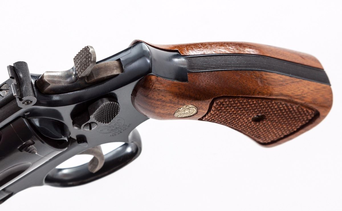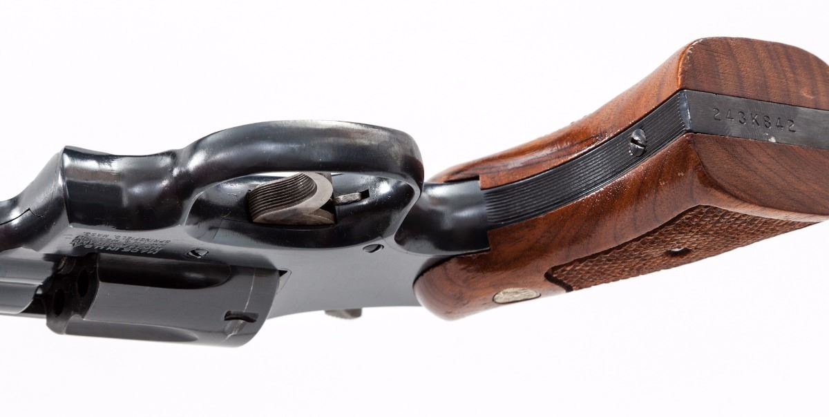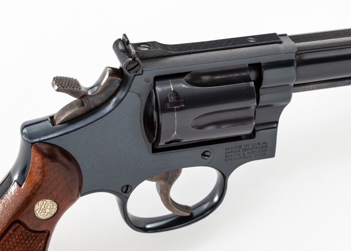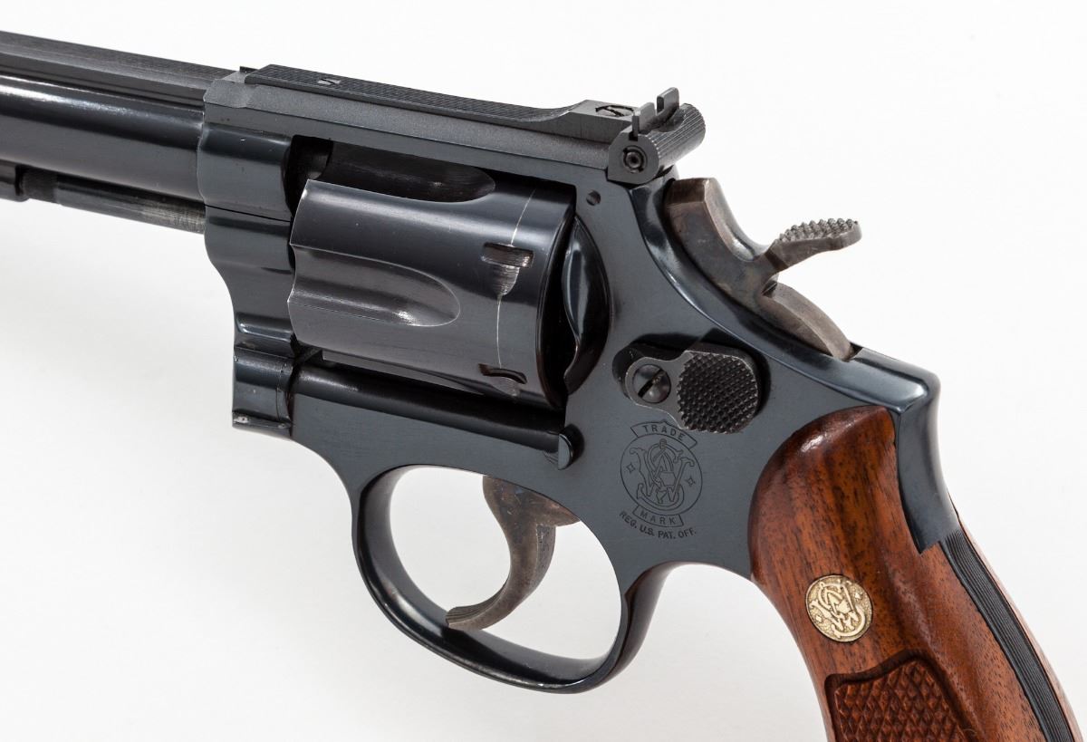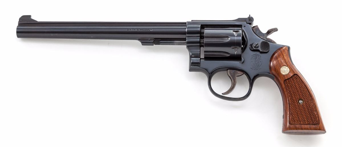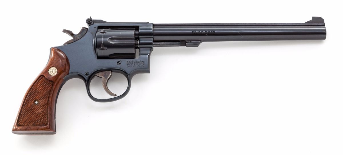 Smith & Wesson Model 48-4 Double Action Revolver, #243K842, .22 mag. cal., 8-3/8'' barrel, blue finish, case hardened trigger and hammer, factory checkered walnut grips with inlaid S&W medallions, Patridge front sight and notched adjustable rear sight. Condition is near excellent retaining approx. 98% blue with a few scattered light marks from handling, in addition to moderate dragline, and a few moderately sized scratches to bottom of barrel. Grips with light impressions, mainly to back and bottom portion; checkering remains sharp. Approx. 75%-80% case colors remain, with most of the losses to the trigger. Action and bore are excellent. Est.: $650-$900. (Modern/PPT)