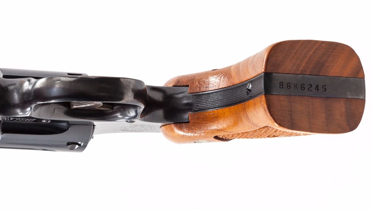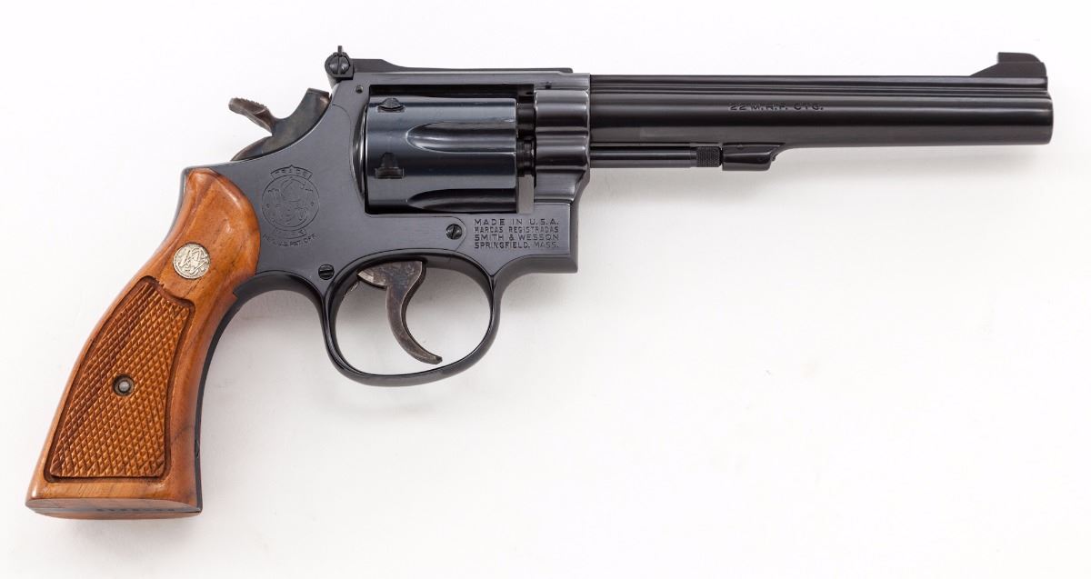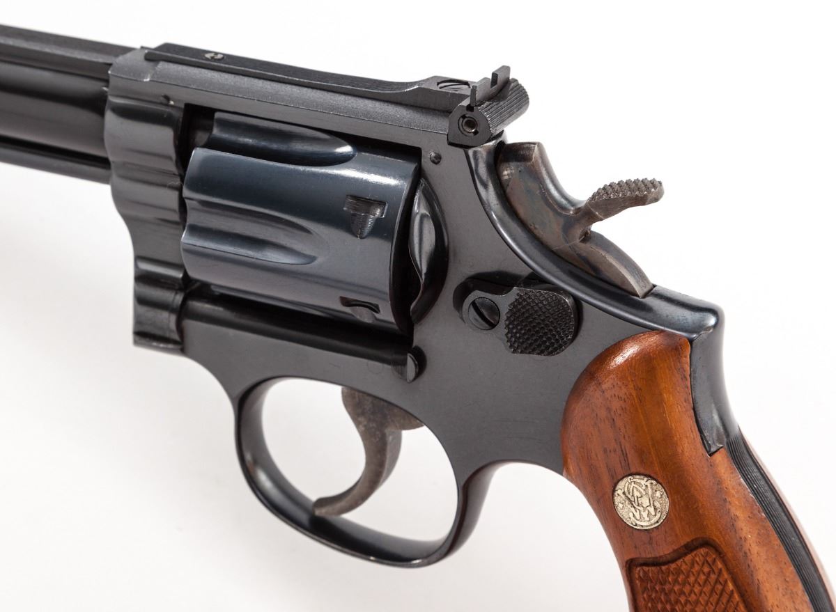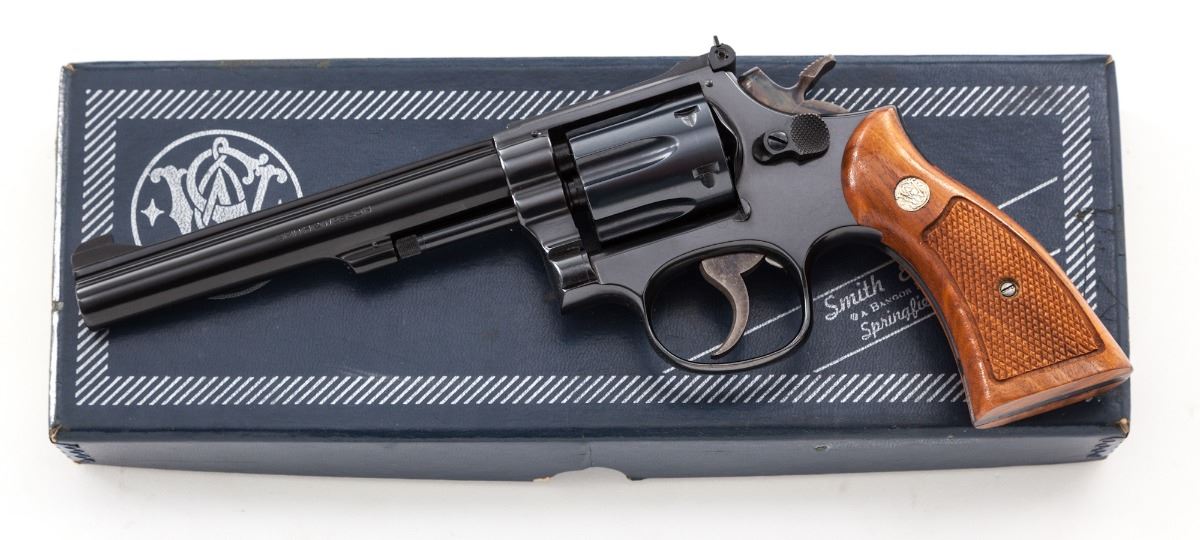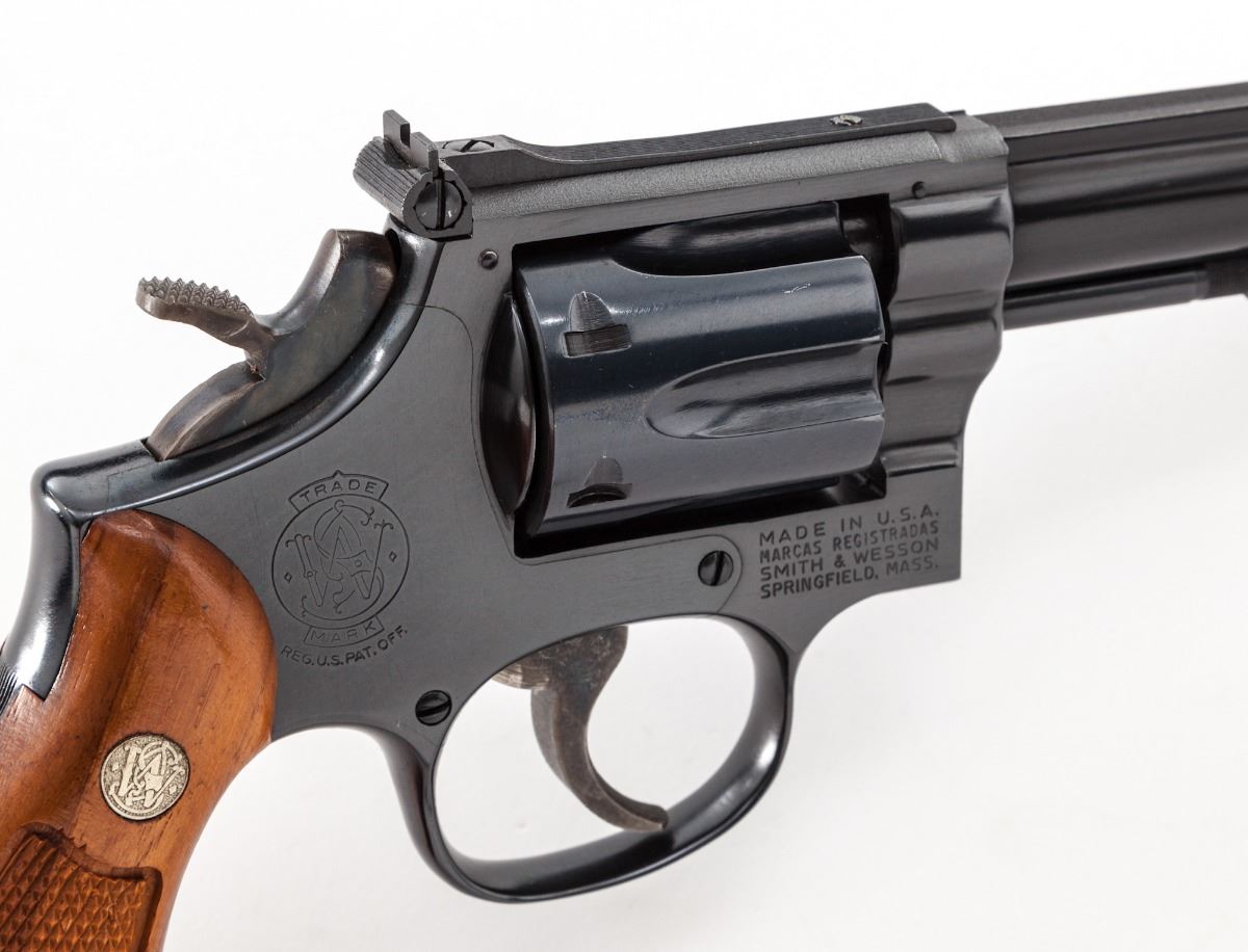 Smith & Wesson Model 48-4 Double Action Revolver, #86K6245, .22 mag. RF cal., 6'' pinned barrel, blue finish, case hardened trigger and hammer, factory checkered square butt magna walnut grips with inlaid S&W medallions numbered to the gun, standard adjustable rear sight and Patridge front sight. In original factory box with matching end label, cleaning kit, factory paperwork and S&W packing paper. Shipped August 1980, with information sheet from Roy Jinks. Condition is excellent, appearing as new. Case colors remain vibrant with minor muting to the edge of trigger. Left side of frame with one faint scratch just below cylinder, and very light index mark to cylinder. Action is crisp, bore is bright. Est.: $800-$1,200. (Modern/PPT)