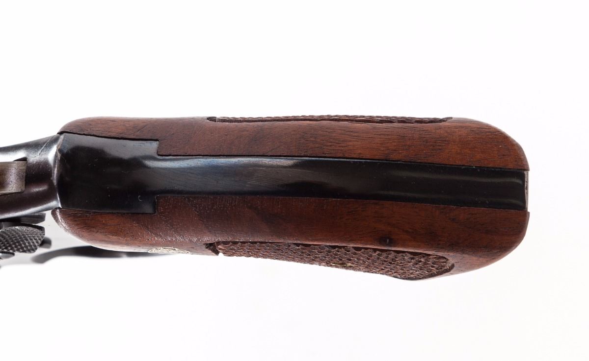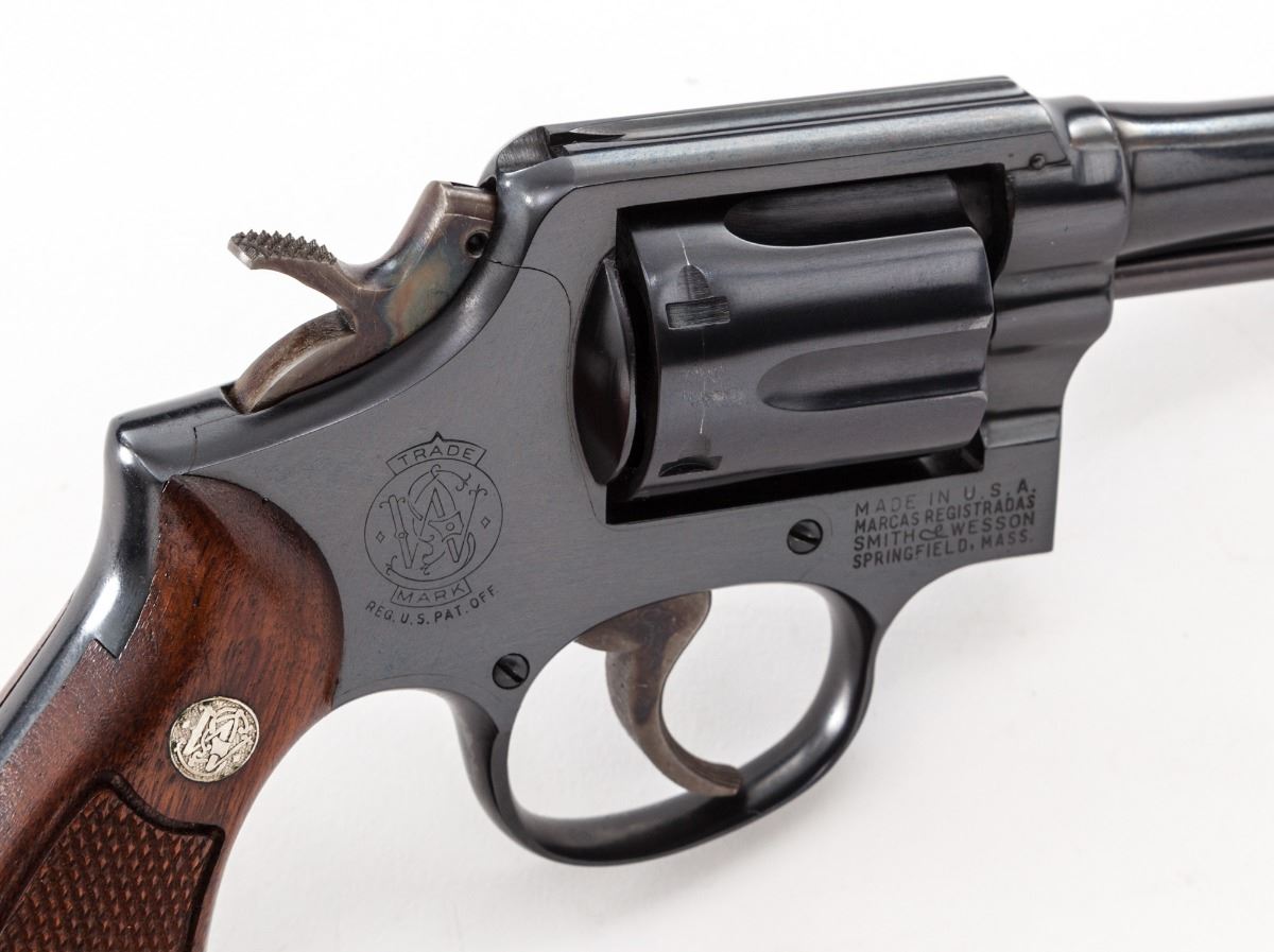 Smith & Wesson Model 10-5 M& P Double Action Revolver, #C827932, .38 Spec. cal., 4'' pinned barrel, blue finish, case hardened trigger and hammer, factory checkered square butt walnut grips with inlaid S& W medallions numbered to the gun, and standard fixed sights. In original factory box with matching end label and S& W packing paper. Shipped March 1966, with information sheet from Roy Jinks. Condition is excellent retaining approx. 98% factory blue with light index mark to cylinder. Grips with a few scattered impressions and sharp checkering. Action is crisp, bore is fine. Box shows heavy wear with some losses to the blue finish and white graphic, as well as writing with grease pen to the lid. Est.: $500-$750. (Modern/PPT)