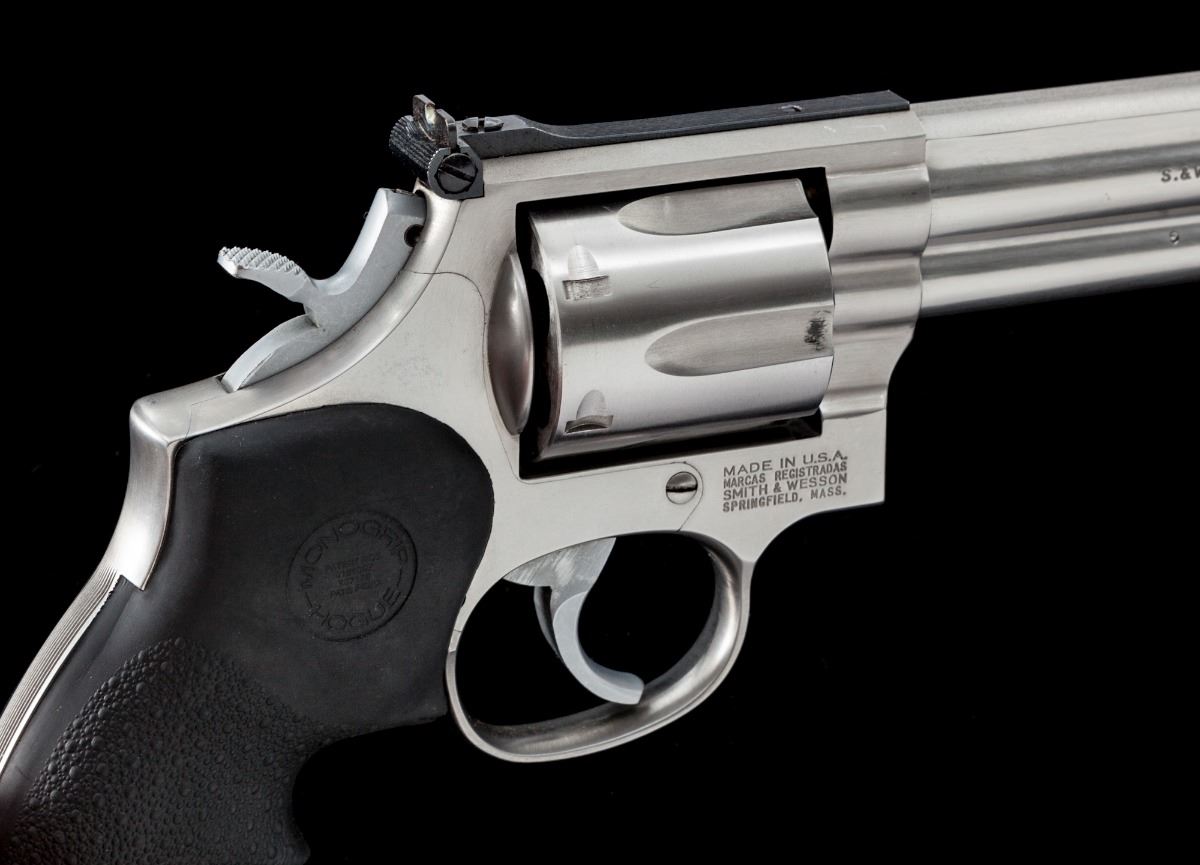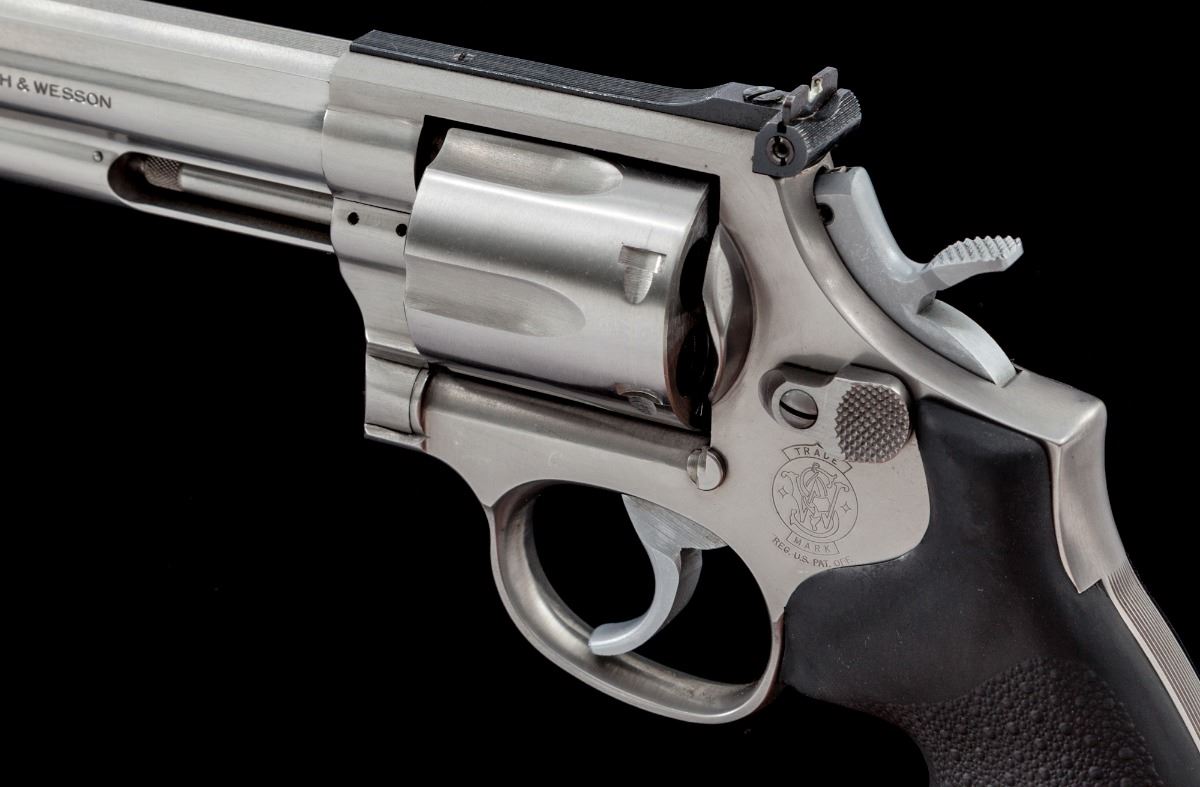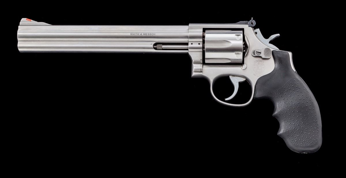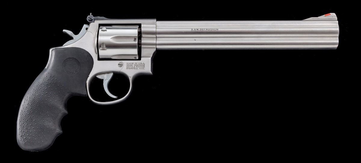 Smith & Wesson Model 686-3 Distinguished Combat Magnum Double Action Revolver, #BKF9153, .357 mag. cal., 8-3/8'' barrel, stainless steel, black rubber Hogue Monogrip grips, red ramped front sight, adjustable rear sight, with checkered hammer. Condition is near excellent with general scattered light marks from handling, as well as some scattered just moderate fine scratches mainly to the right side of barrel. Action and bore are excellent. Est.: $600-$800. (Modern/PPT)