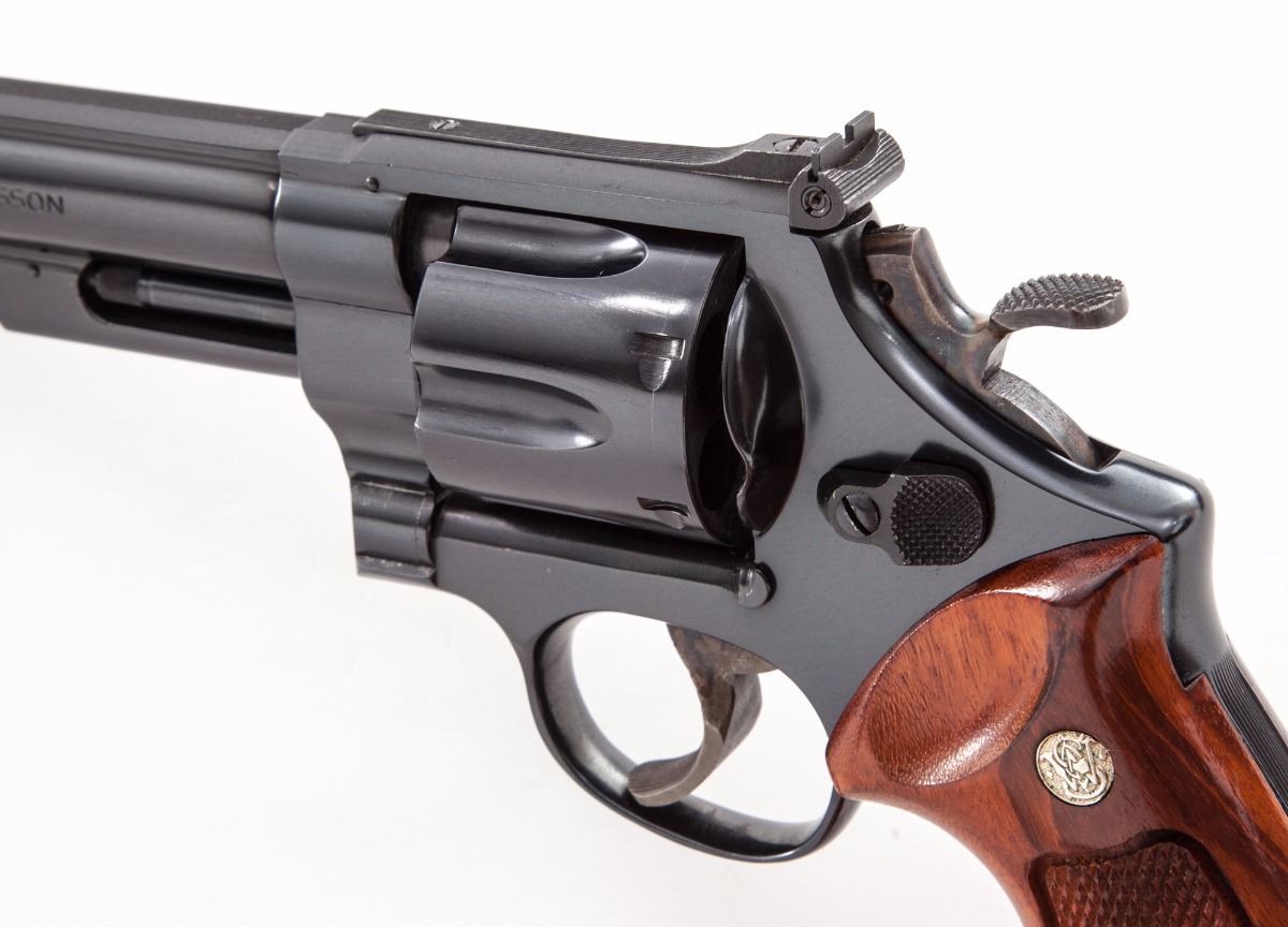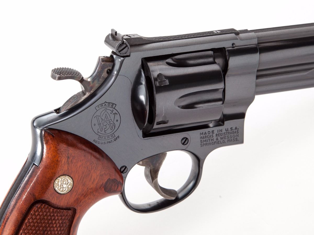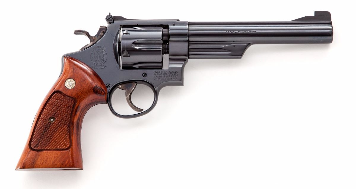 Smith & Wesson Model 25-2 (1955 Target Model) Double Action Revolver, #N405961, .45 ACP cal. (.45 Auto rim), 6-1/2'' pre-1981 pinned barrel, blue finish, factory checkered wood grips with inlaid S&W medallions, serrated back grip strap, case hardened hammer and trigger, Patridge front sight and adjustable rear sight. Includes S&W wood presentation case with blue felt lining, original cleaning accessories and owner's manual. Condition is near excellent retaining approx. 97% blue, with some light wear to the muzzle and scattered general surface scratches. Cylinder with light dragline. Grips with mostly crisp checkering. Hammer and trigger with strong remaining case colors, with some fading to both sides of trigger. Action and bore are excellent. Interior of case with some staining and deterioration and in need of a thorough cleaning; exterior of case with light scuffs and scratches. Est.: $800-$1,200. (Modern/PPT)